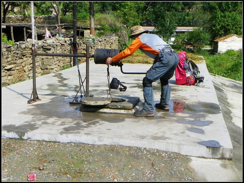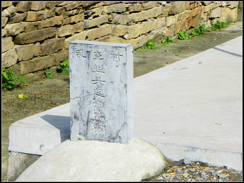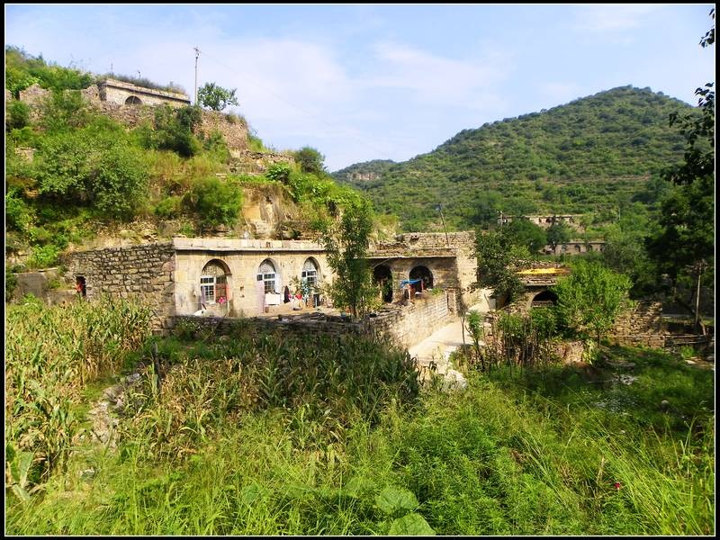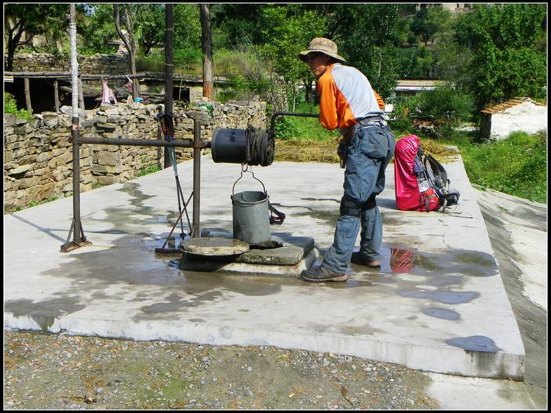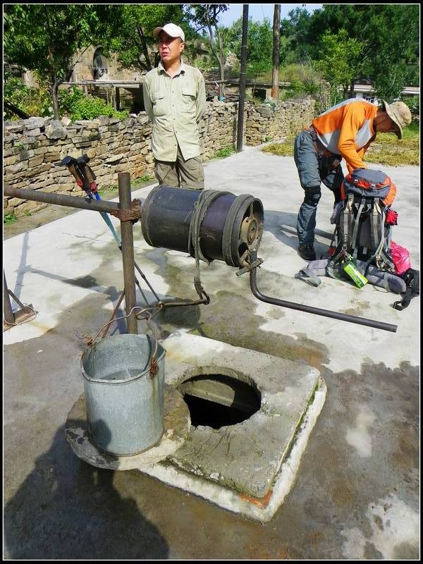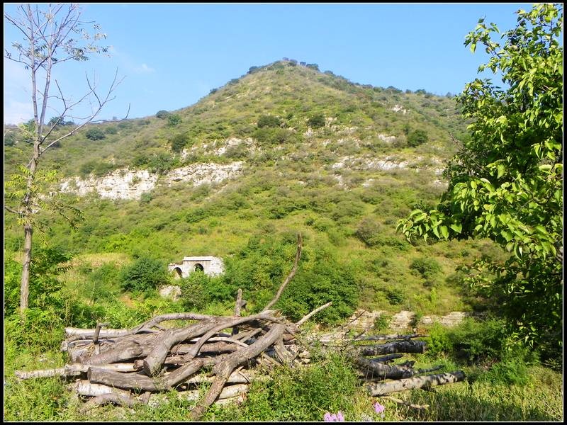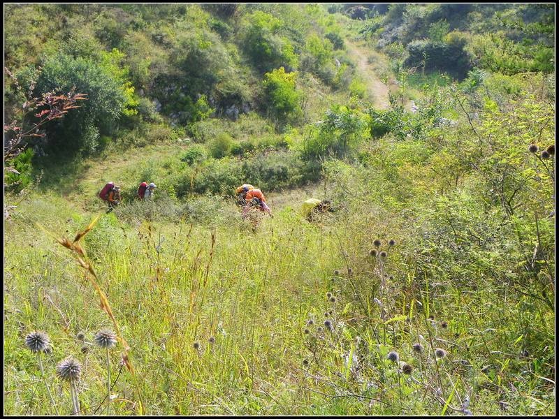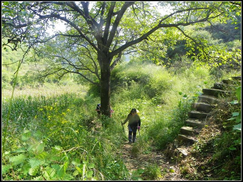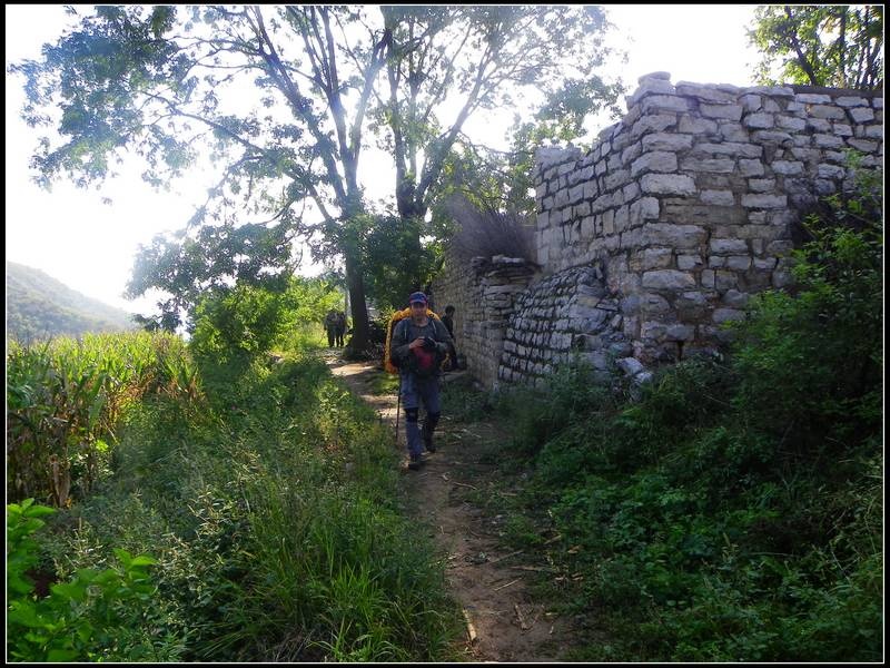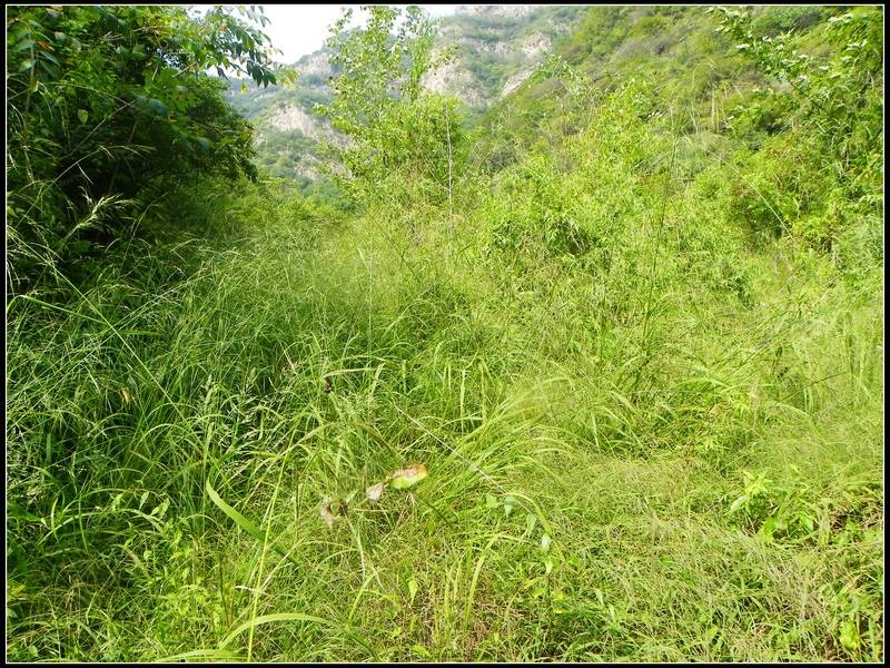 大约10点半,我们走到了拦头起。 栏头起村的中心,公路一边有个大水窖,那是拦头起的生命之源。应该说的是,拦头起的水水质非常清澈,不象四水泉的水那么混浊,不但漂着很多草屑,还多少有些土黄。 穿过村子 走出村子是一条荒芜的三轮车路,现在老乡种地也简单了,只是春天播一播种,秋天收获一下,中间很少管理,所以田间的路很少有人走了,路荒芜也就不稀奇。 过了一根拦路的电线(为什么要拦路?只用一根电线栓在路两边拦住路?不明白),路边的梯田变成了废梯田,路越走越荒芜,渐渐的,封路的茅草已经比人都高,好在那路路底子很好,草虽然高也不至于找不到路。