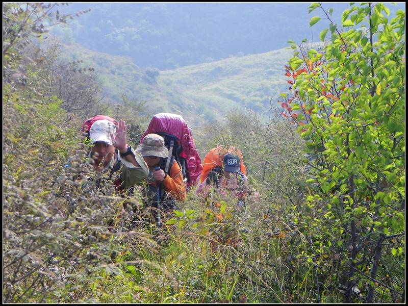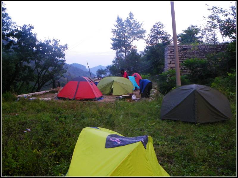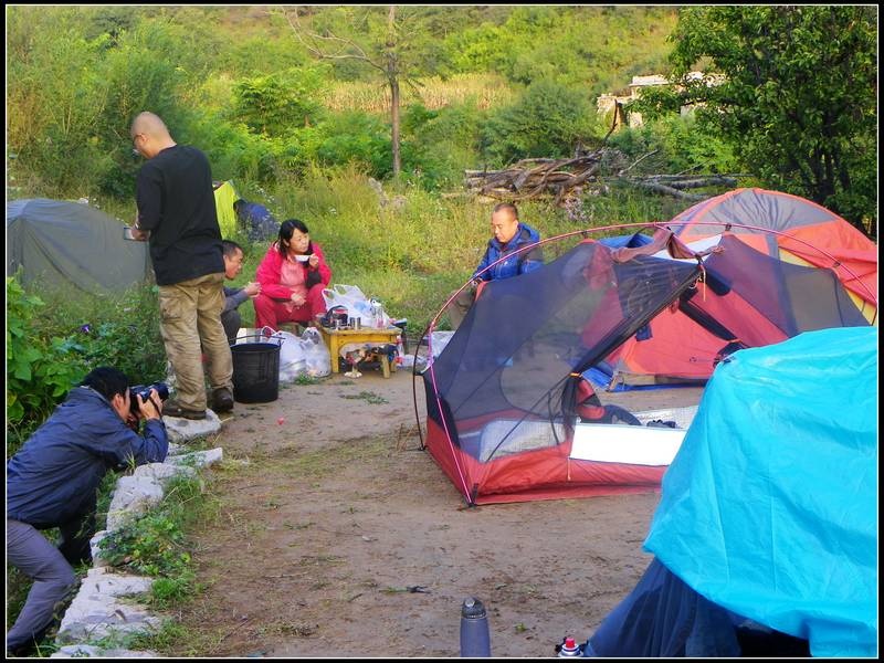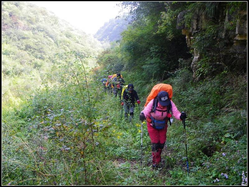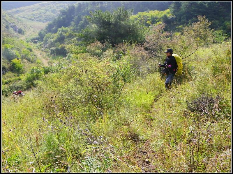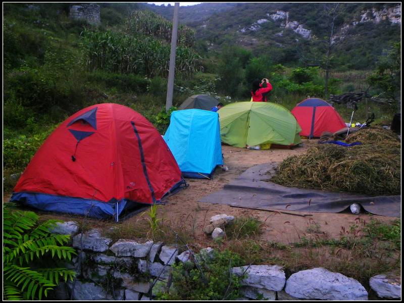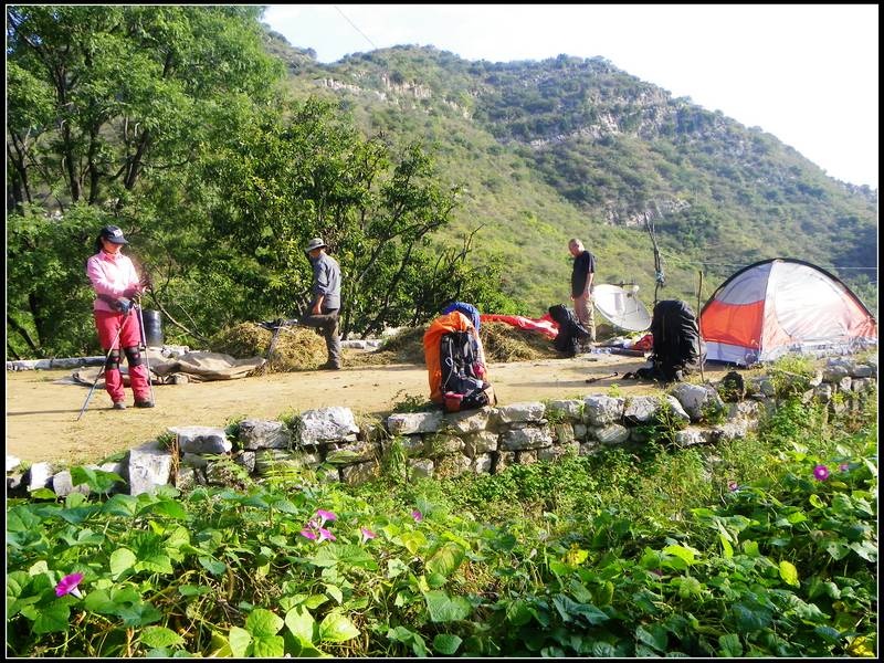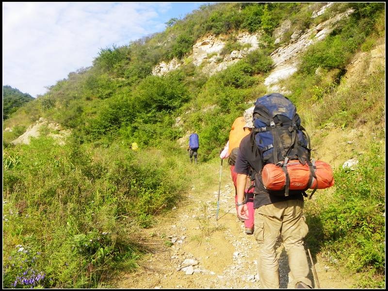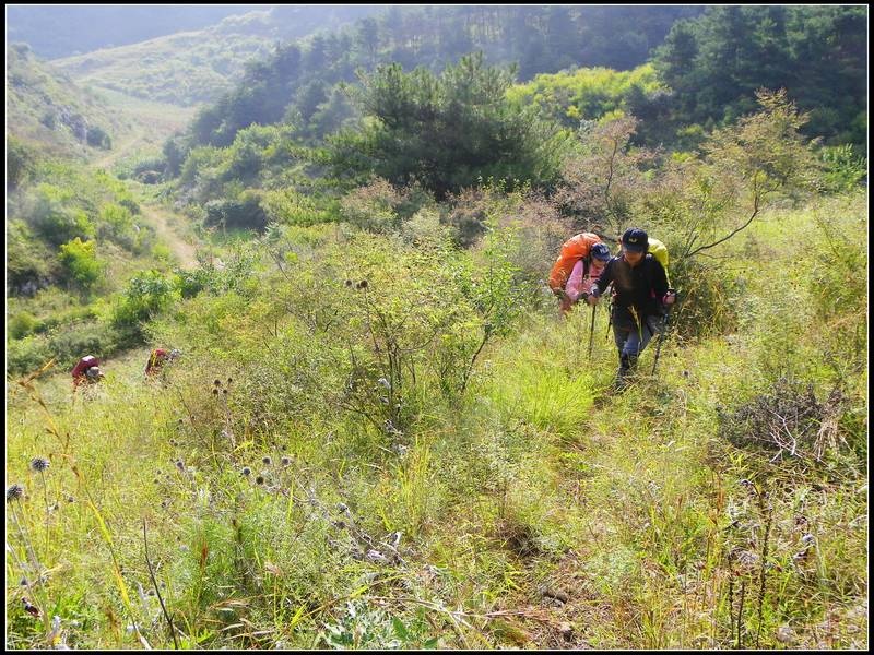 天亮起床,东方的云缝里露出了一丝曙光,可惜云太多,可惜太阳升起的地方正好有一片树,看日出的希望成了失望,说起来有好几年没看过日出了,你别说,还真的很想那红彤彤的一轮朝阳。 营地的早晨 四水泉村北的山 四水泉村西的山,今天我们要从山脊最低处翻过这座山 收营,准备出发 本计划8点出发,稍一磨蹭就拖到了将近1个小时,下面这张照片显示的时间是8点51分,一下子耽误了那么多时间?急死我了。 四水泉共有四户人家,其中三户有人长住,与大多数山村一样,长住的都是老人,只有中秋、春节这样的重要节日才有探视父母的年轻的人回来。 走过人去屋空的那家人的院子,老史想进去看一眼,刚往门里一迈步,“汪汪汪……”,院内一只大狗狂吠着窜了过来,吓的他“妈呀”一声转身就跑,逗的我一阵哈哈大笑。 走出四水泉村 出村是一条能走三马子车(山西人叫三轮)的大道,它通向西侧山脊上的垭口,垭口那边的路我走过,是和仙姐他们探玉华洞时走过。 路虽然能走三轮,却被草忽死了一多半。四水泉村没有“车”,老乡说,每年的秋季有收粮食的贩子来收粮食,只有那时才有三轮走那条道。 拐过一个弯,山坡上出现一条小道,我不假思索的拐向小道,看方位、凭感觉,这是一条上垭口的近路。大多数人与我一样选择了小路,也有人不信邪,非要走大路,验证一下大路快还是小路快,结果可想而知,我不说你也知道。 小路攀升中的队友 登上垭口了,脚下是我熟悉的大道,下面就是乱窑那条沟,沟的对面是石人山,石人山的后面是小鱼。5.1我们从乱窑走到过小鱼,那条路不难走。如同以往尽量不走重复路一样,这次我仍不想走走过的旧路,不想再从乱窑往小鱼走,我想从拦头起往小鱼方向穿,如果能直接穿到下花沟口最理想不过,穿不到下花沟口,能下到小鱼也行,估计那两条路都有一定的难度,因为这一带的山断层很多,而且是连贯的断层。驴友就是这样,放着好路不走走难走的路,这叫什么?“没有难度创造难度”。 垭口看四水泉方向 垭口看石人尖 下山,是一条宽阔的大路,这条路我已经走过两次,下去向右一拐就是乱窑,一路不表。乱窑到拦头起5里,全是公路,平淡而乏味,也不须提。至于有人放着公路不走非要走沟对面的小路,结果越走越高,再来一次没有难度创造难度也不须提。对于驴友,这已是司空见惯的事,如果你没有这样的经历,那我不客气的说:你一定是只新驴。