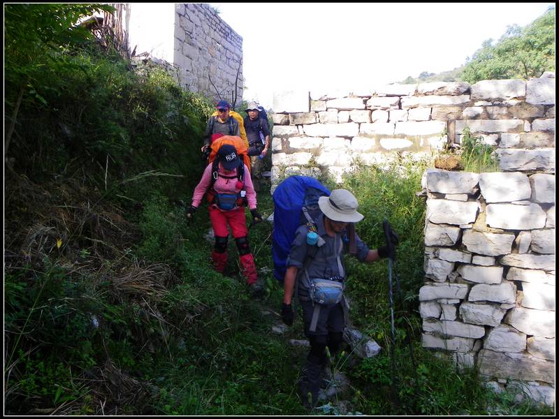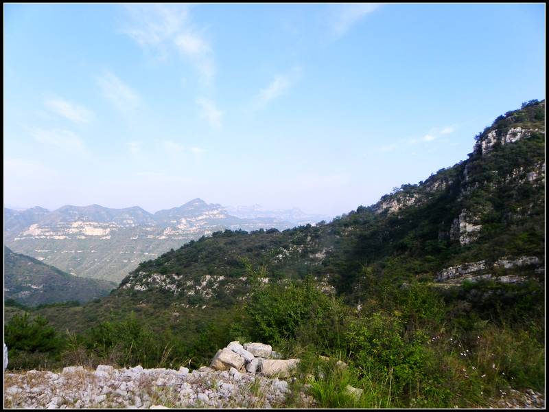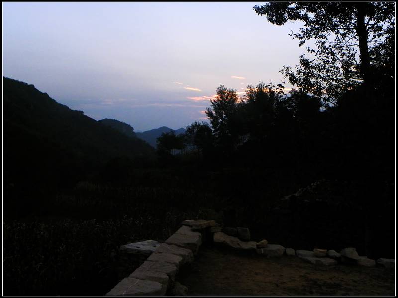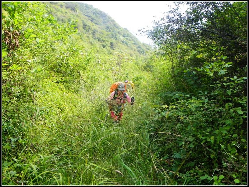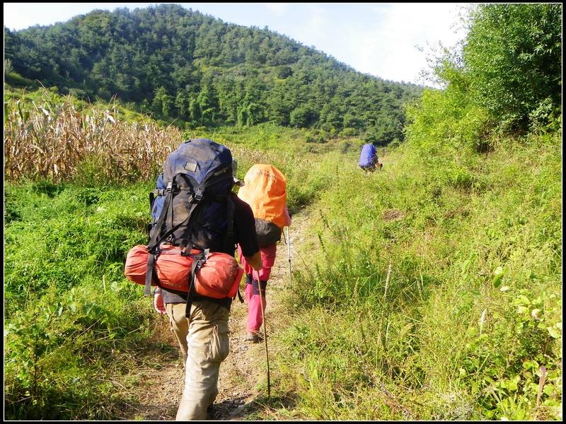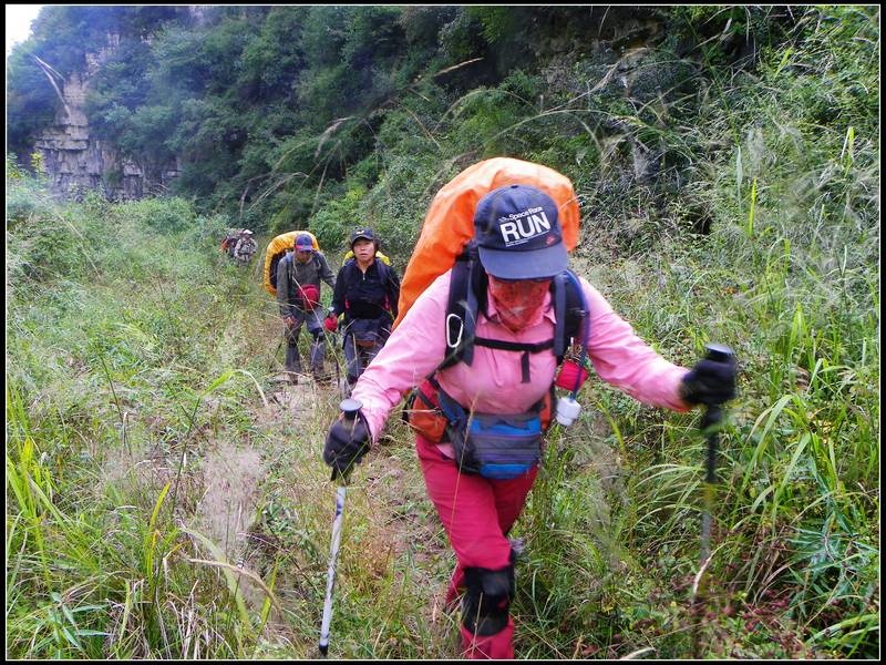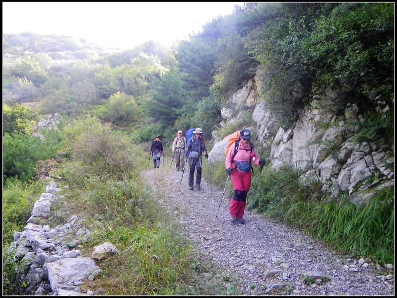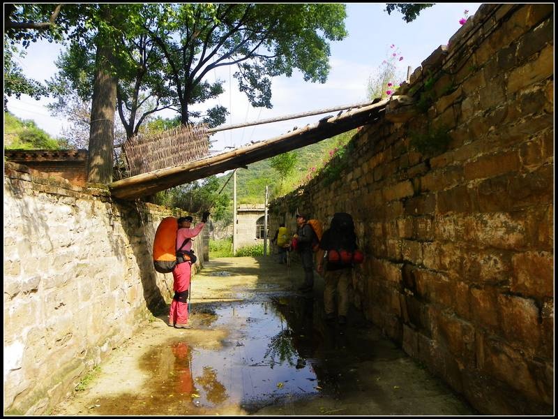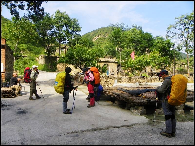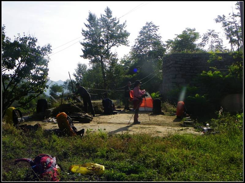 天亮起床,东方的云缝里露出了一丝曙光,可惜云太多,可惜太阳升起的地方正好有一片树,看日出的希望成了失望,说起来有好几年没看过日出了,你别说,还真的很想那红彤彤的一轮朝阳。 营地的早晨 四水泉村北的山 四水泉村西的山,今天我们要从山脊最低处翻过这座山 收营,准备出发 本计划8点出发,稍一磨蹭就拖到了将近1个小时,下面这张照片显示的时间是8点51分,一下子耽误了那么多时间?急死我了。 四水泉共有四户人家,其中三户有人长住,与大多数山村一样,长住的都是老人,只有中秋、春节这样的重要节日才有探视父母的年轻的人回来。 走过人去屋空的那家人的院子,老史想进去看一眼,刚往门里一迈步,“汪汪汪……”,院内一只大狗狂吠着窜了过来,吓的他“妈呀”一声转身就跑,逗的我一阵哈哈大笑。 走出四水泉村 出村是一条能走三马子车(山西人叫三轮)的大道,它通向西侧山脊上的垭口,垭口那边的路我走过,是和仙姐他们探玉华洞时走过。 路虽然能走三轮,却被草忽死了一多半。四水泉村没有“车”,老乡说,每年的秋季有收粮食的贩子来收粮食,只有那时才有三轮走那条道。 拐过一个弯,山坡上出现一条小道,我不假思索的拐向小道,看方位、凭感觉,这是一条上垭口的近路。大多数人与我一样选择了小路,也有人不信邪,非要走大路,验证一下大路快还是小路快,结果可想而知,我不说你也知道。 小路攀升中的队友 登上垭口了,脚下是我熟悉的大道,下面就是乱窑那条沟,沟的对面是石人山,石人山的后面是小鱼。5.1我们从乱窑走到过小鱼,那条路不难走。如同以往尽量不走重复路一样,这次我仍不想走走过的旧路,不想再从乱窑往小鱼走,我想从拦头起往小鱼方向穿,如果能直接穿到下花沟口最理想不过,穿不到下花沟口,能下到小鱼也行,估计那两条路都有一定的难度,因为这一带的山断层很多,而且是连贯的断层。驴友就是这样,放着好路不走走难走的路,这叫什么?“没有难度创造难度”。 垭口看四水泉方向 垭口看石人尖 下山,是一条宽阔的大路,这条路我已经走过两次,下去向右一拐就是乱窑,一路不表。乱窑到拦头起5里,全是公路,平淡而乏味,也不须提。至于有人放着公路不走非要走沟对面的小路,结果越走越高,再来一次没有难度创造难度也不须提。对于驴友,这已是司空见惯的事,如果你没有这样的经历,那我不客气的说:你一定是只新驴。