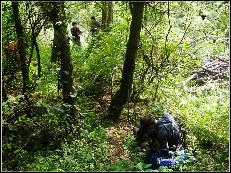 过一条岔沟再走不远又是一条岔沟,两侧的坡变陡了,沟口处有一片砍倒的树,这儿就是问路时老乡说的那个堆木场吧?路从这儿脱离了沟底,拐进右侧山坡上的松林。我们在此简单休息了一下,就要爬坡了,休息、休息一下。