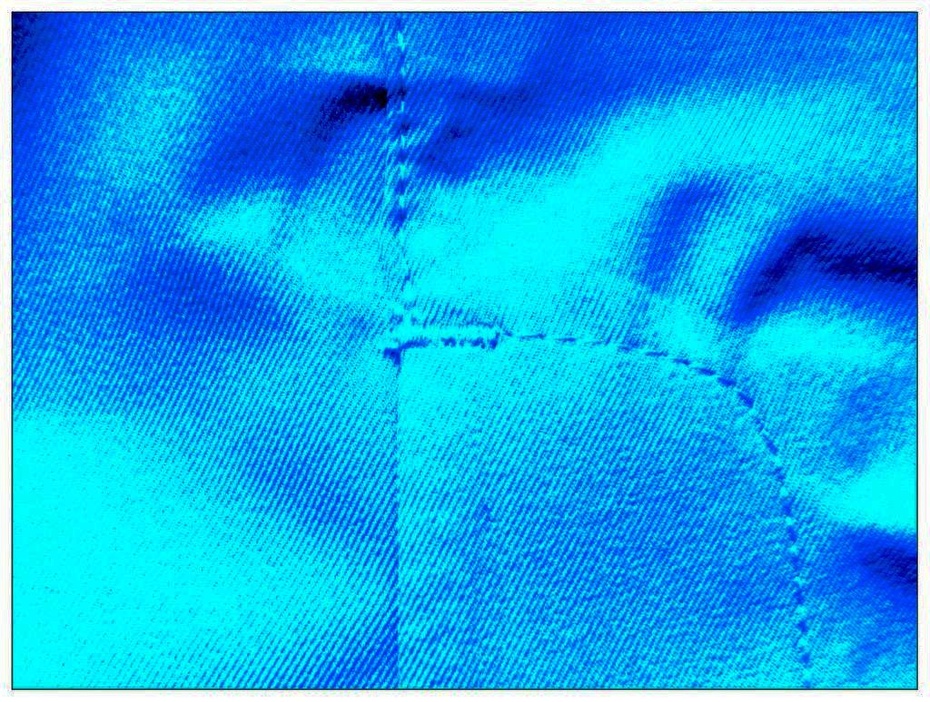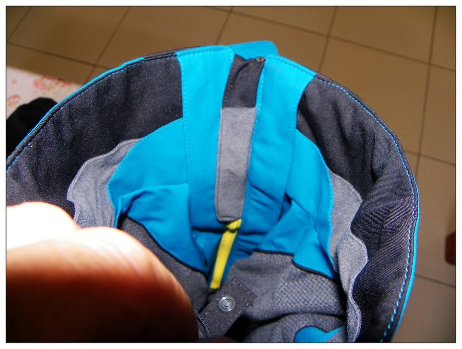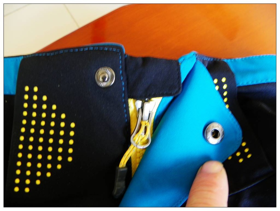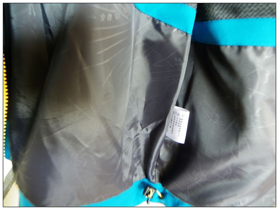 H、软猬甲冲锋衣其它细节展示 冲锋衣衬里的下1/3是加厚的灰色暗花的尼龙绸,尼龙绸与网纱间用主色调的蓝色布条拼接,障显美观效果。冲锋衣的衬里之所以采用网纱拼接尼龙绸,是因为上衣的下摆经常与裤子摩擦蹭挂,与网纱相比,尼龙绸的耐磨耐挂性能更好。