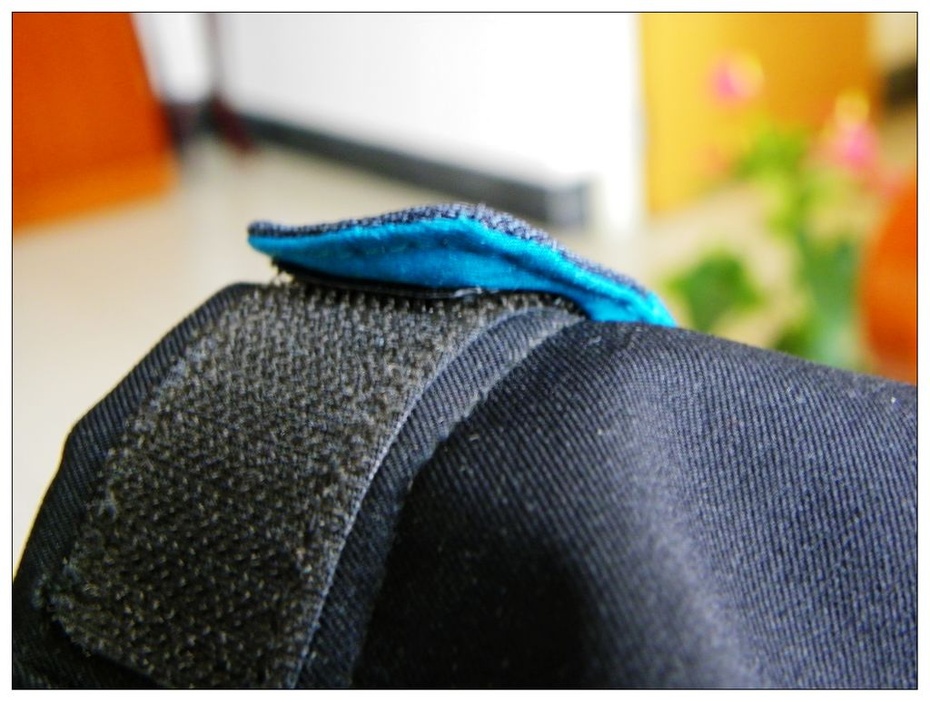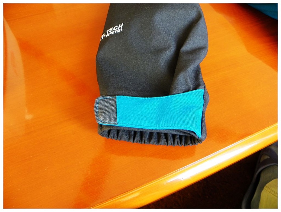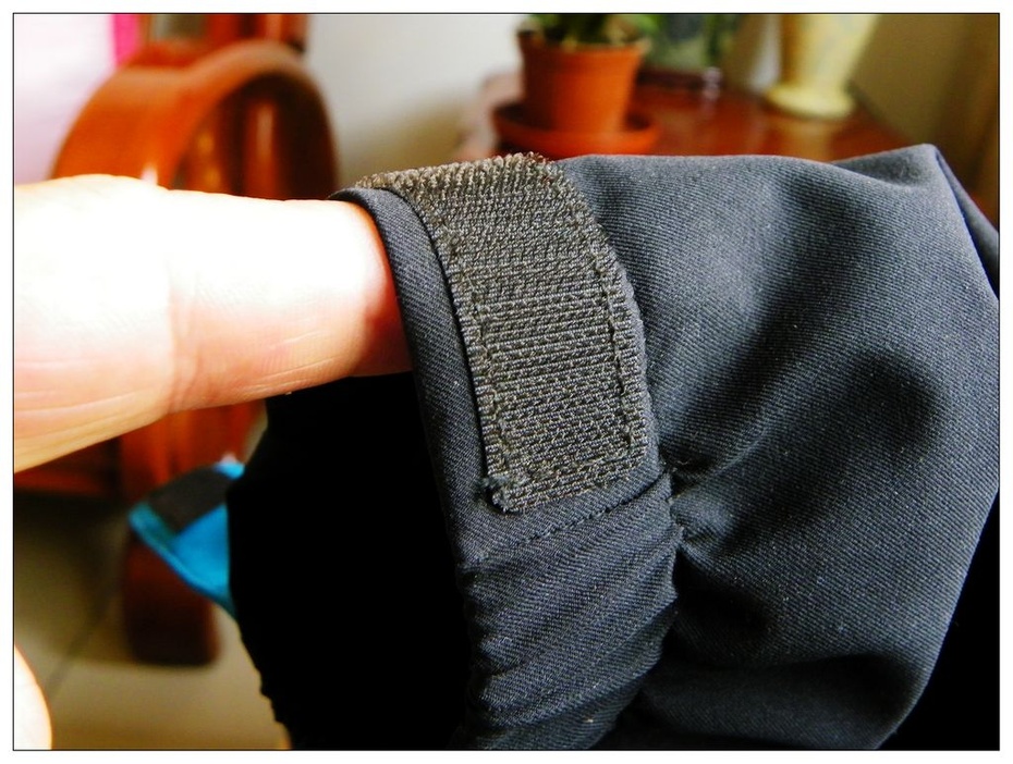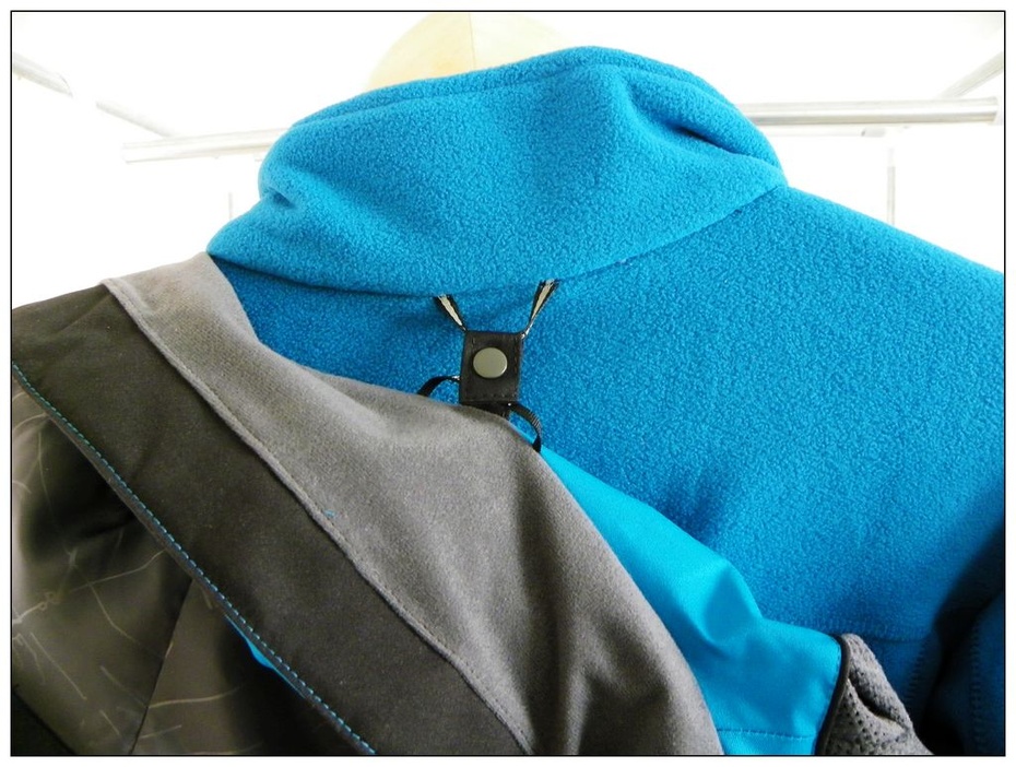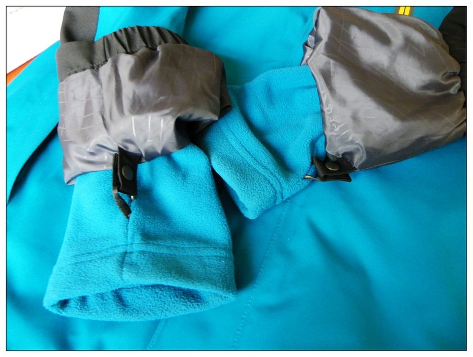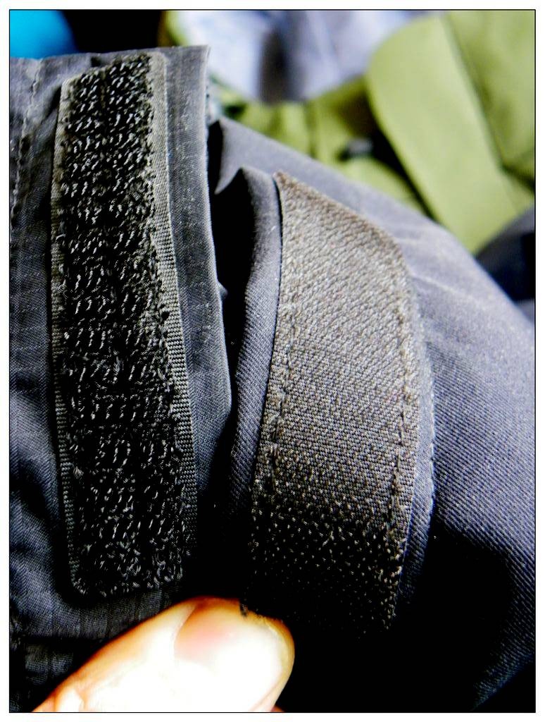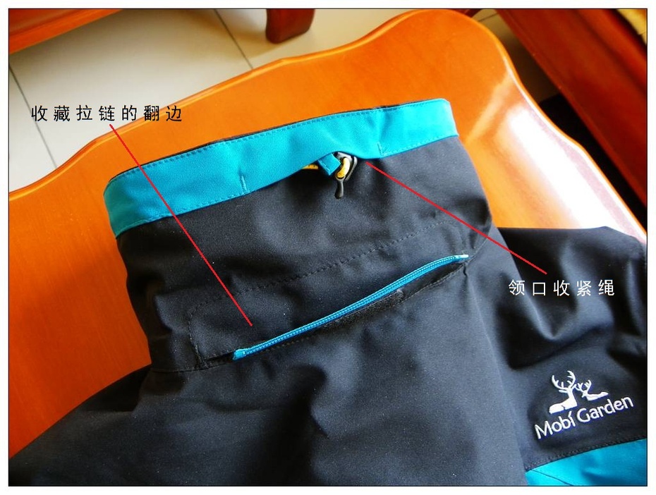 软舌头的上边有一个小翻边,可以有效的遮档住拉链头 软猬甲冲锋衣的领口处也有一道收紧绳,半隐藏式的调节锁扣位于衣领外侧的后颈处。在恶劣条件下,通过这根收紧绳可以有效的收紧领口,防止体温由脖子处散失。衣领的下侧还有一个小小的暗兜,说暗兜是夸张,其实是只一个翻边,在拆下风雨帽后,我们可以掀开这个翻边,把连接风雨帽的拉链藏于其中。 掀开这个翻边,可以把连接风雨帽的拉链收藏起来 拉链收好后的效果,怎么样,很美观吧? G、衣袖细节展示