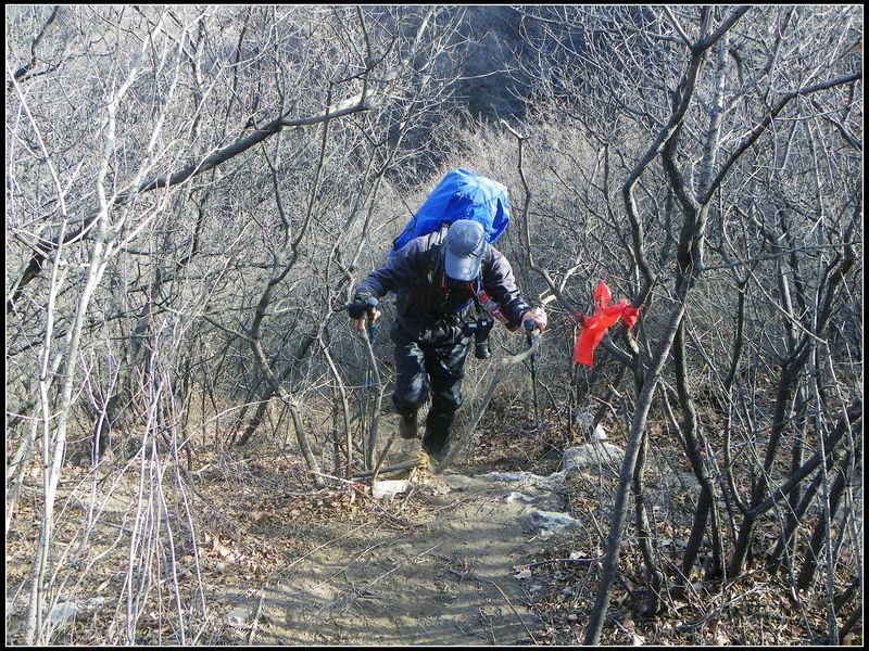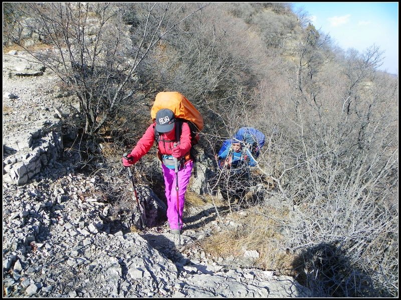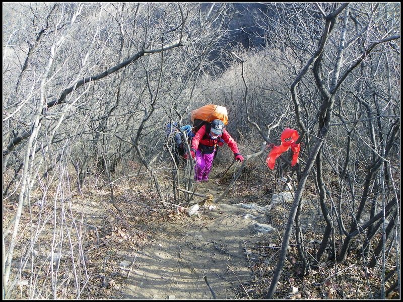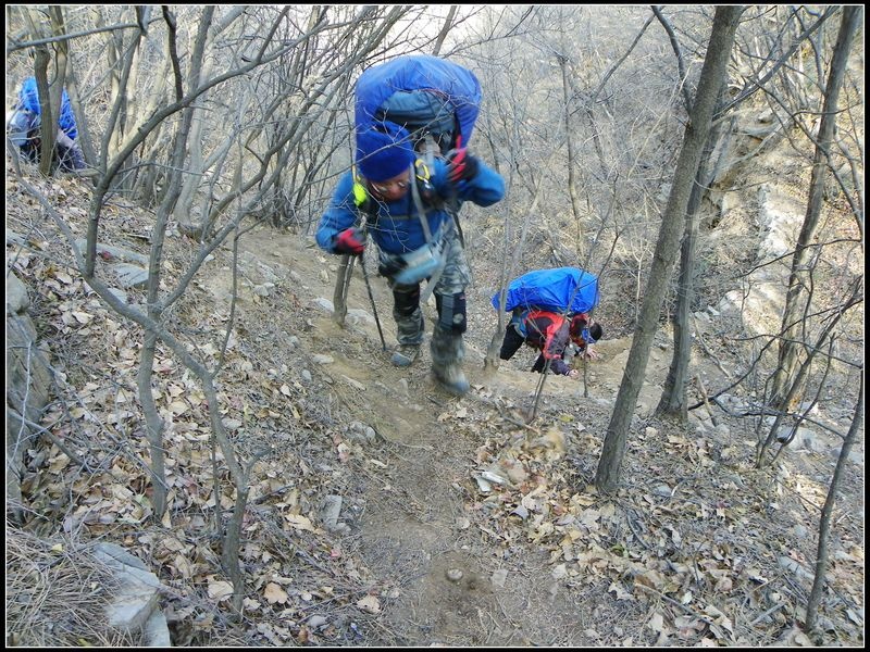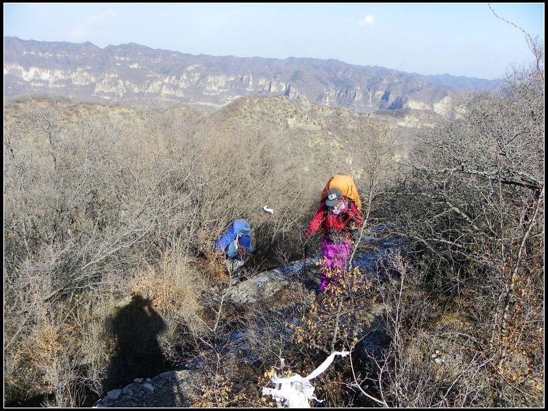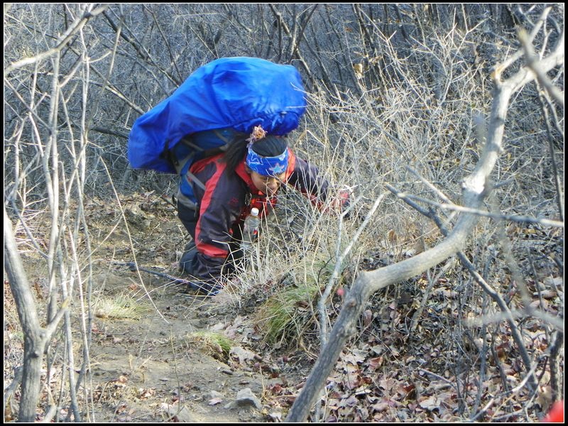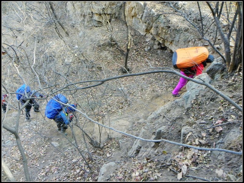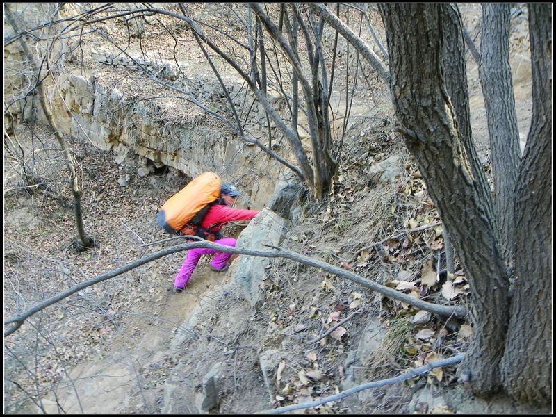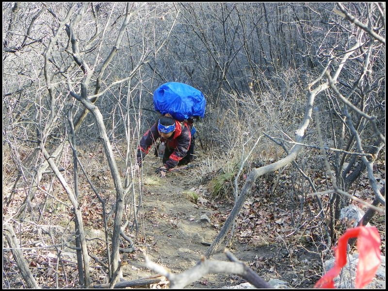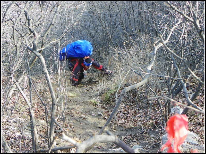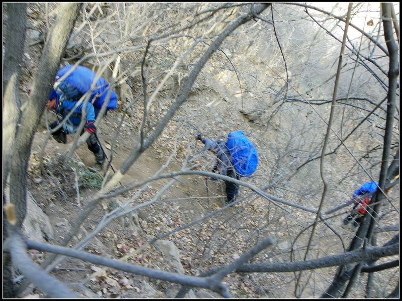 顺路继续前行,一路向前横切,年久失修的古道长满了大大小小的树木,树木稀疏处,可以清楚的看到下边的沟,那沟也通向黄安方向。10.1我曾试图走这条沟,但没能找到路。 脚下的沟 路渐渐切到沟底,岔沟汇合处是几片废弃的梯田,在这路又不明显了。记的10.1那次探路,我和不锈钢、老史在这儿就很是费了一番周折才找到了路。这次凭印象,再找到那条路应该不难吧?事与愿违,一串红路标把我们引向了一条错误的路,那路开始还不算难走,但越往后的路越难走,我终于断定我们走错了路。退回去重新找路?返回也不容易,再说,既然有路标,应该能走通,已经走过来不近了,干脆接着走吧。 走在错路上的一组镜头 走过最后一片梯田,路更难走了,看的出来,此路根本不是真正的路,只是不久前,某支队伍硬从山坡上趟出来的一条道,你想想,动辄几十人、上百人的队伍一走,没路的地方也得趟出一条路来。如果轻装走这条路还问题不大,可重装的我们走这条路就非常吃力了。用句调侃的话,那叫滚的滚、爬的爬,不过最终我们还是沿这条路登上了山梁。