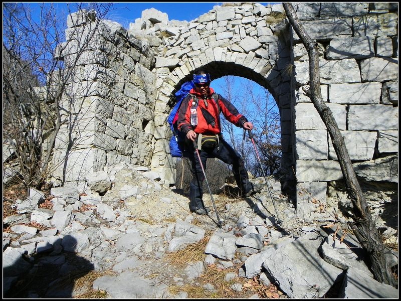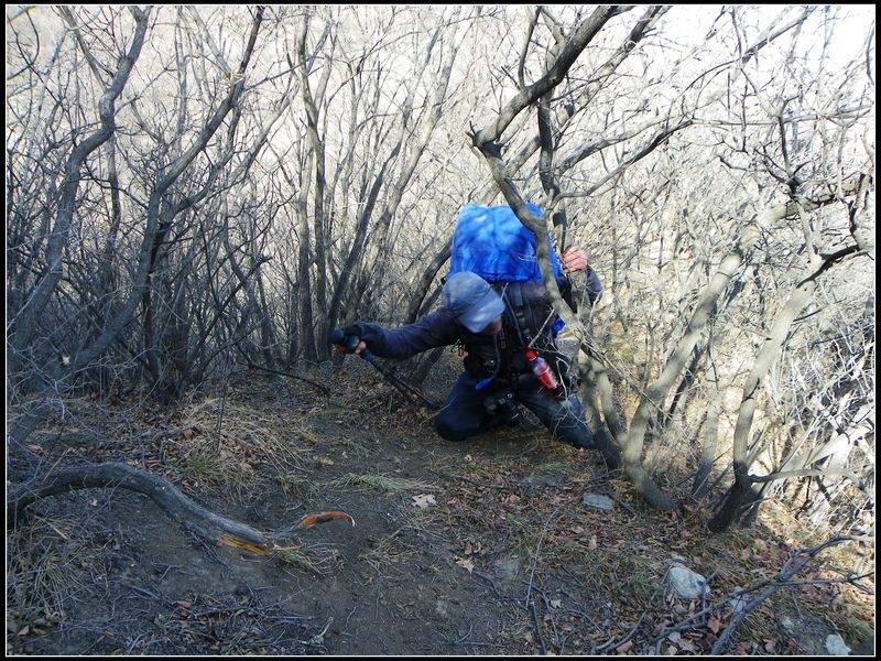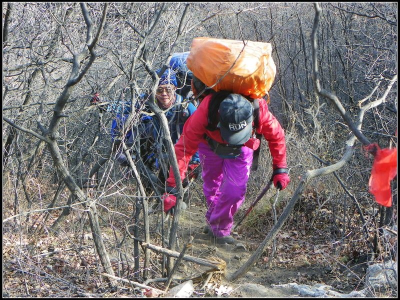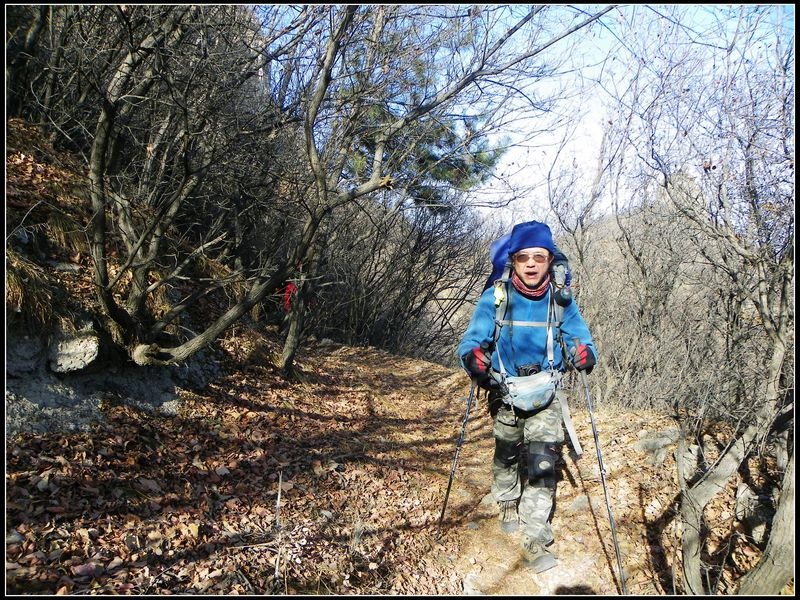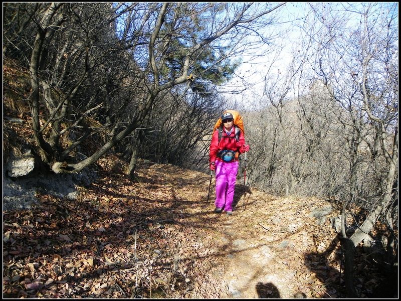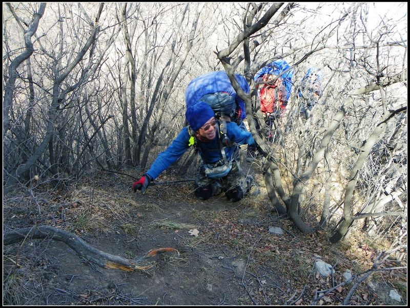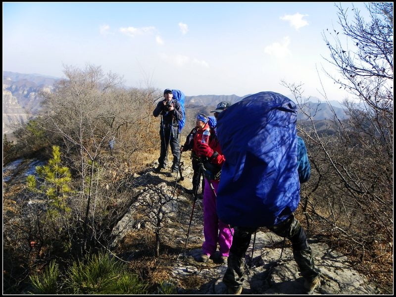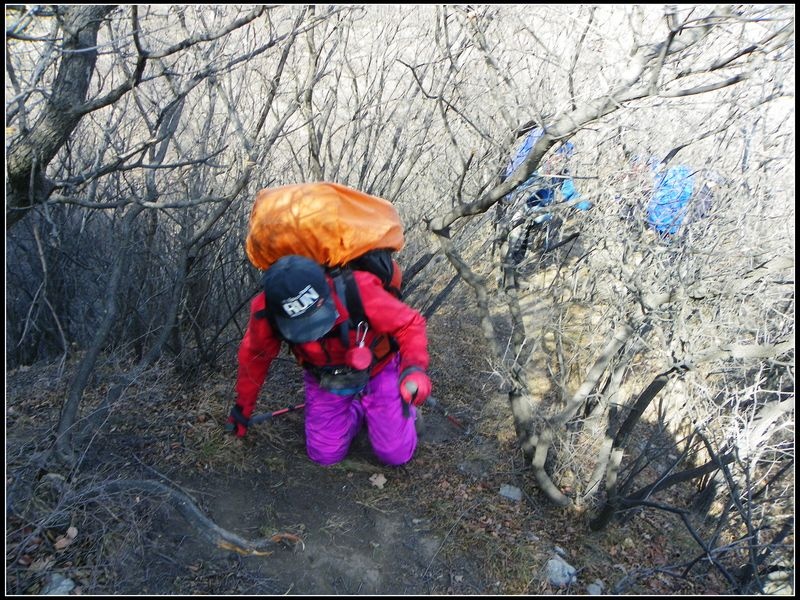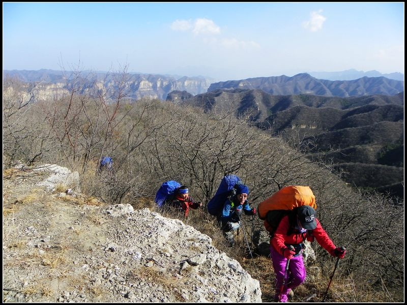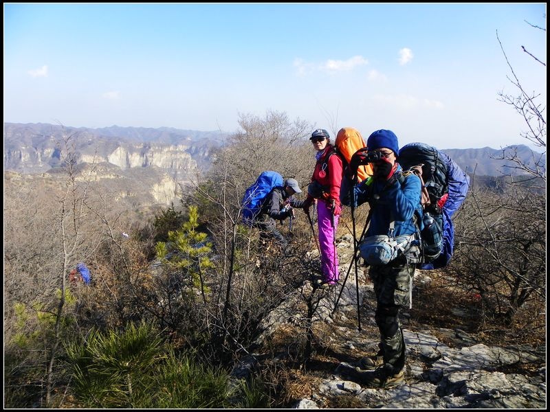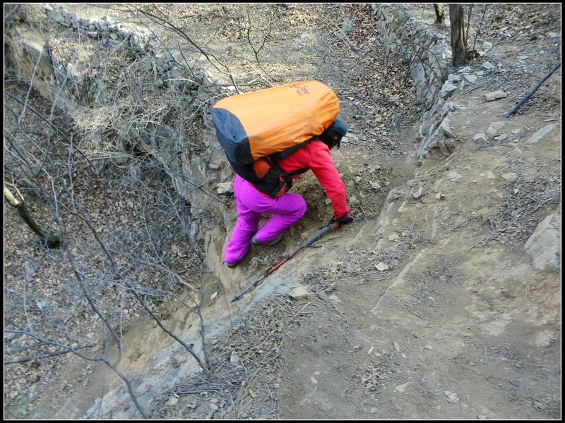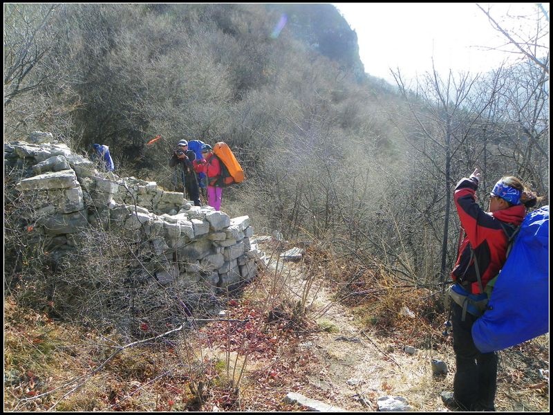 顺路继续前行,一路向前横切,年久失修的古道长满了大大小小的树木,树木稀疏处,可以清楚的看到下边的沟,那沟也通向黄安方向。10.1我曾试图走这条沟,但没能找到路。 脚下的沟 路渐渐切到沟底,岔沟汇合处是几片废弃的梯田,在这路又不明显了。记的10.1那次探路,我和不锈钢、老史在这儿就很是费了一番周折才找到了路。这次凭印象,再找到那条路应该不难吧?事与愿违,一串红路标把我们引向了一条错误的路,那路开始还不算难走,但越往后的路越难走,我终于断定我们走错了路。退回去重新找路?返回也不容易,再说,既然有路标,应该能走通,已经走过来不近了,干脆接着走吧。 走在错路上的一组镜头 走过最后一片梯田,路更难走了,看的出来,此路根本不是真正的路,只是不久前,某支队伍硬从山坡上趟出来的一条道,你想想,动辄几十人、上百人的队伍一走,没路的地方也得趟出一条路来。如果轻装走这条路还问题不大,可重装的我们走这条路就非常吃力了。用句调侃的话,那叫滚的滚、爬的爬,不过最终我们还是沿这条路登上了山梁。