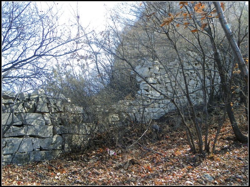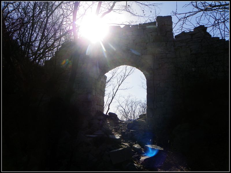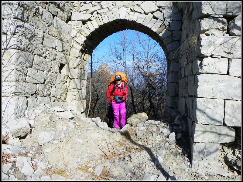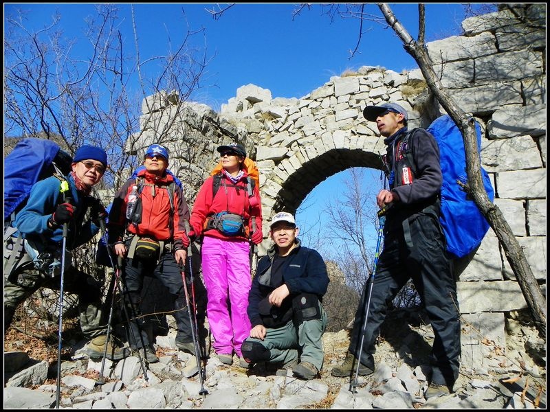 铃铛 下午2点36,我们走到了老乡所说的城门洞处,理论上说,过了城门洞就是山西的地界了。 所谓城门洞应该是内长城的一部分。一般的长城都是一道城墙,此段长城上下三层城墙,此种情况实属罕见,前边我们已经过了两道城墙,这道城墙是此段长城的最后一道关墙,也是三道城墙中保存最好的一段城墙,残高足4米的高大城门全部用条石砌筑,在这人迹罕至的荒山中显的格外的宏伟。 走过城门洞的铃铛 最后一个让我逮住正脸的是和蓝鱼一样同样来自沧州的雨辰,身材高大的他站在那儿象一座山,两条长腿登山时有独特的优势,不过钻树棵子时就惨了,真的很惨,不信你问问他。 蓝鱼 铃铛 城门洞处的小合影