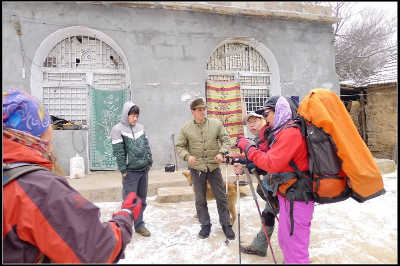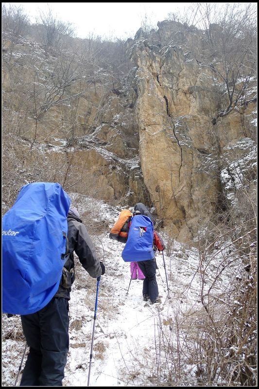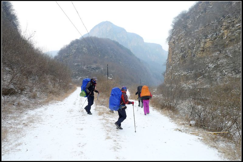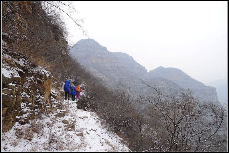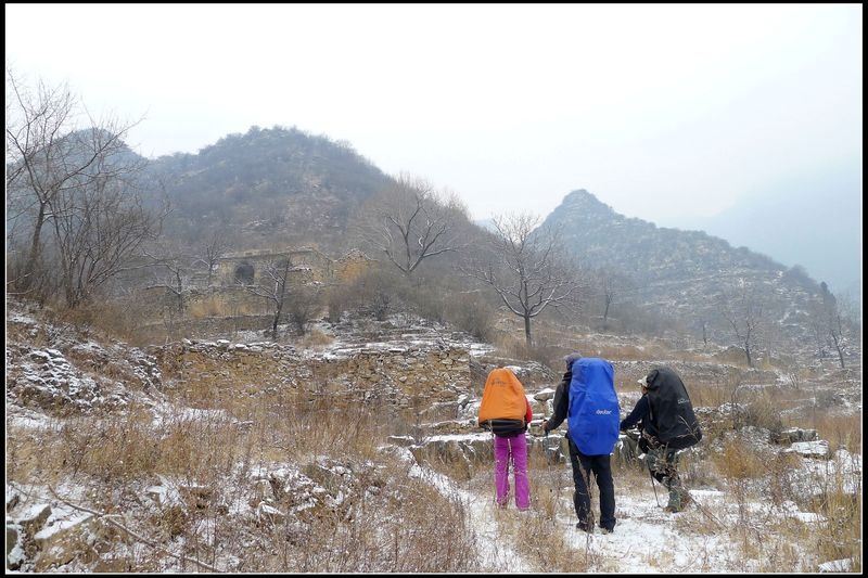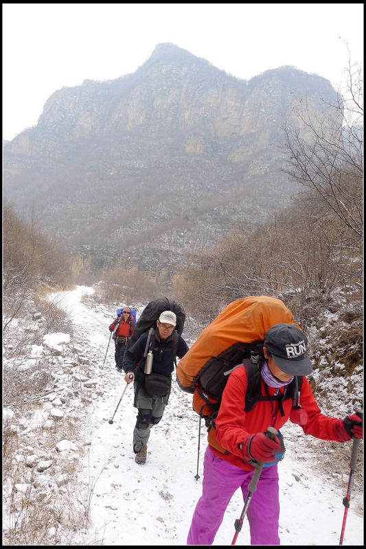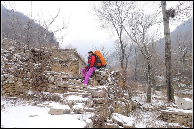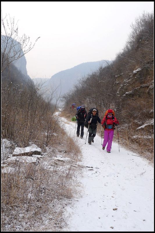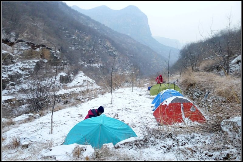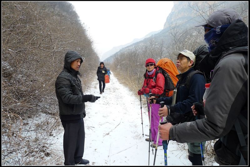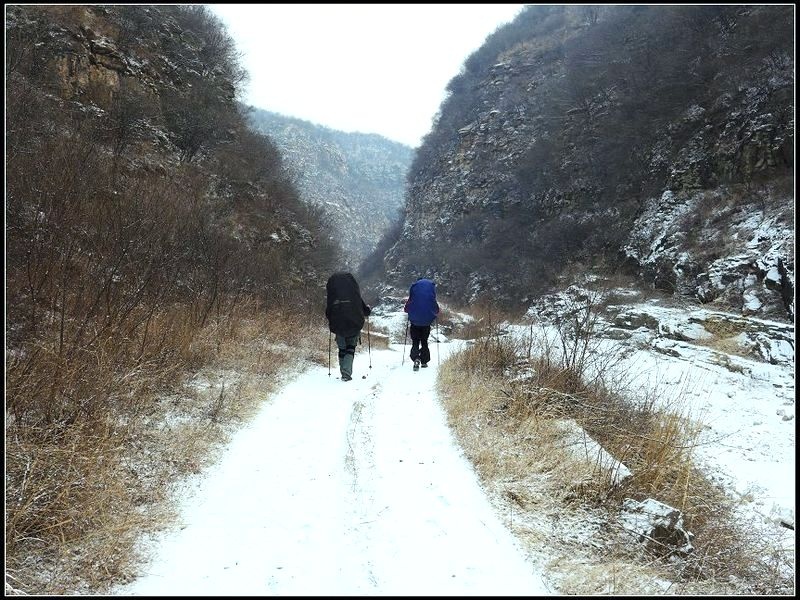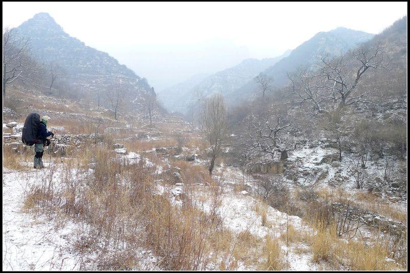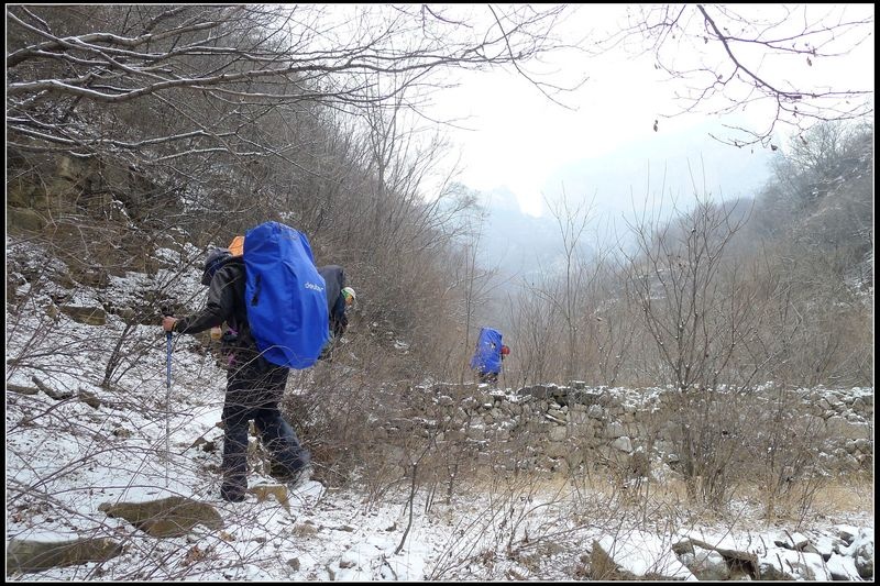 同昨天一样,我睡的很早,吃饱了没事干,外边又冷,不钻被窝干啥呀?钻进被窝里,暖和和的躺着,躺来躺去就睡着了。 一觉醒来,才10点半,惊喜的听到帐篷上的涮涮啦啦的声音,“下雪了”?钻出帐篷看仔细,果然是下雪了,好兴奋。石家庄一冬无雪,不但石家庄,整个华北都旱的不行,雾霾倒是天天有,现在在户外赶上了第一场雪,能不让人兴奋么?。“下雪了”。“下雪了,雪还不小”。连喊了三遍,才有人应了一声。呵呵,都 睡着了,还睡的很死。 此后又是醒醒睡睡,睡睡醒醒,一夜折腾不停。 清晨的营地 营地的早晨 早饭中的龙哥 营地旁的小河 正在拍照营地的铃铛,看着他们想怎么拍就怎么拍,让我好生羡慕、好是嫉妒 9点48,我们上路了,今天 出发时间又不早,同昨天差不多。踏着咯吱咯吱的新雪,我们向下走去,众人都有点小兴奋,是啊,盼雪盼了两个月了,今天终于见到了这个冬季里的第一场雪,如何让人不兴奋。兴奋之余,我心里更多的是担忧:我们今天要翻黑狗尖的山梁,那路本来就不好走,上次就没能走通,现在下了雪,路肯定更难走了,这次我们能穿过去么?不会又象上次那样折戟而归吧?再一想,管它呢,大不了变线,改成走安全的路线,再不行就原路返回,反正要安全第一。户外不就是个玩,不就是个乐么,没了安全,一切全是扯淡。 岔沟里的冰河 上路10分钟,我们拐进另一条沟里,走过这条沟的人,应该对这个沟口有很深的印象,5.1那次穿越的最后一天,不锈钢、老史、车夫、水管就是在这儿和我们分手的。 在外不吸烟,入山不带火。防火警句要牢记 明明是山西的地界,线杆却是河北黄安-盘口的,两省交界处,常有这种扯不清,理还乱的事 踏雪而行 两个带孩子的老乡从上边下来了,这条沟只住着不多的几户人家,平时极少碰上人,我们急忙上前问路,,我们下一步的目标是翻越黑狗尖山脉,那也是一座险山,也是一个老乡都不在翻的山,路很难找。有这个机会我怎能 错过。这个老乡我们昨晚见过,他就是昨晚我们扎营时提醒我们注意防火的老乡,他是来前边村串亲戚的,路并不是很熟。“前边村里有人,你们到那儿再问吧”。 继续前进 11点,我们走到了东山庄,上次我们就是从这儿拐的弯,穿越黑狗尖时因时间关系没翻过去,今天我还想从这儿走。但我心中有一个疑问:在有雪的情况下,下山的路好不好走,我们能安全的翻过去么?这几年,听到的户外事故太多了,在好多人眼里,驴友成了不安全因素的制造者,这可不好。不管如何,我们都要把安全放在第一位。要杜绝各种不安全的因素。 东山庄村只有两户人家,别看村小,却是这条沟、10来个村的地理中心,村口有曾经的东山庄小学,老乡说鼎盛时有50多个学生,如今这条沟里一个学龄儿童也看不到。年轻人都飞走了,这是时代进步的表现。 向老乡问路,这位老哥说我们上次走的路不对,去下口要走另一条沟,然后耐心的向我们说了好长时间,他说的明白,我们也听的明白,但后来我们还是没找到他说的地标,没能按他说的路走通,唉,我们和老乡勾通时常常会出现种种意外,双方的思维、眼光、语言有太大的差异。 在东山庄,我们并不算意外的看到一个老熟人,一个放假在家的小伙子,一个很阳光的风华少年。5.1我们走这条线时小伙子就在家,正背着喷雾器要下地打药,那次我们是向小伙子的爷爷问过路,老爷子耳朵很背,双方勾通了好长时间我们也没问明白。这次向我们介绍路的老乡和小伙子是当家子,在这种只有几户人家的小山村,全村的人往往都沾亲。 告别老乡,我们又向前走去,现在的时间11点多,按老乡所说,如果顺利,我们今天下午就能翻过黑狗尖下盘口,事实上我们的穿越不可能处处顺利,前进的路上总有很多意想不到的困难在等着我们。 虽说是走过一次的路,上路还是走错了,错过了拐弯的路口,好在我及时的发现了错误,只过了路口不足百米。 艰难的爬升,我们奋力的向上攀去,现在我敢肯定,我们走的路没有错。可和我一起走过这条的老王和铃铛却还在质疑。唉,你俩是珠瑙还是玛瑙,这么清楚的路怎么就记不得呢? 路边一景 急剧攀升后是一路平切,到了这时铃铛还在质疑,如此的固执真真的气死我了。妹子啊,你这一路的嚼謦要累死我多少脑细胞啊。俺要是得了老年痴呆症你可得负责。 半个小时后,我们走到了一岔沟处,沟口有两间窑洞,这个村我们来过,我们知道前边不远还有一条岔沟,沟口也有房屋。“岔沟那有两个窑、旁边有两棵梨树、还有两个洞洞。”这儿的房子都是窑洞形式的建筑,老乡说的是哪两个窑?哪儿有两个洞洞,哪儿又是老乡说的那两棵梨树?我们有点懵。搜索,一条沟一条沟的搜索,没能找到两个洞洞,也无法确定我们该走哪条沟。 废村的窑洞式的建筑 等待探路结果时的铃铛 一个小时过去了,仍无法确定哪条沟是我们应该走的沟,我们只能冒然的往前走,选择最有可能的那条沟向上走。 沿着梯田一边的路向前,时间不长路变的越来越小,可老乡说的翻梁的路一直没有出现,这条沟莫非不对?“龙哥,别走了,退回去再问问老乡吧。”不甘心,真的不甘心退回去,这条沟地势并不复杂,如果天气好,如果是上午,既便路不明显甚至没路我们也敢走。现在不行,天寒地冻又有雪,时间也有点晚。如果继续冒然的往前走,一旦找不到我们要走的路,今天就不可能翻过山去,这种地形的山上又很难有营地,那我们就只能往回返,白白的消耗体力和