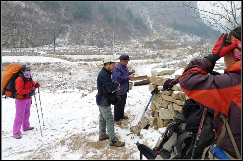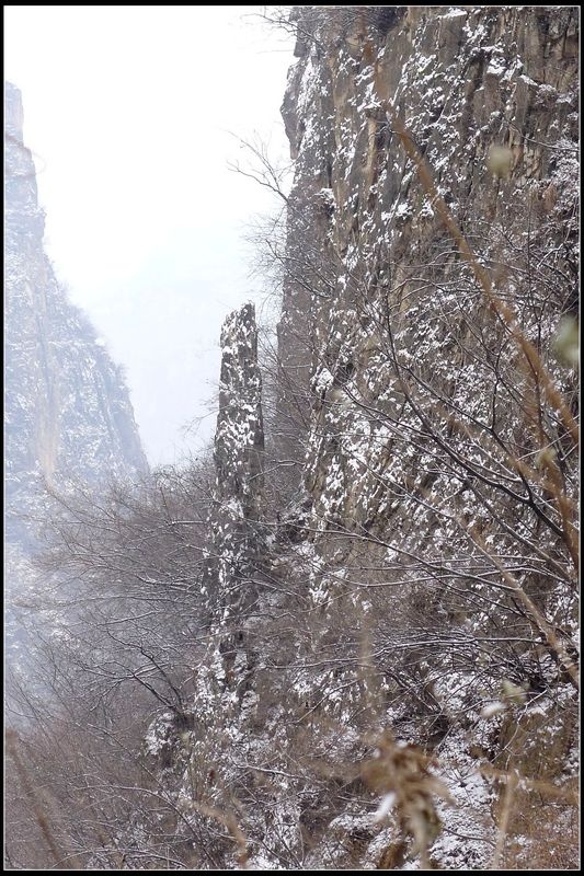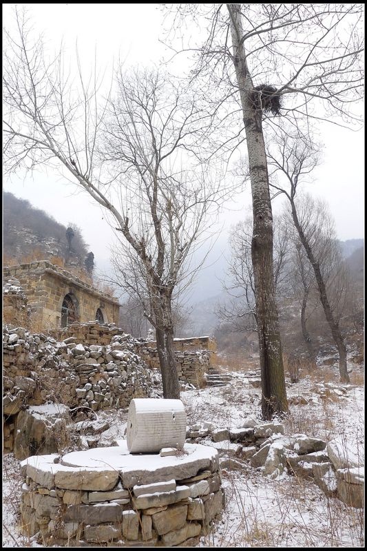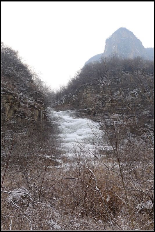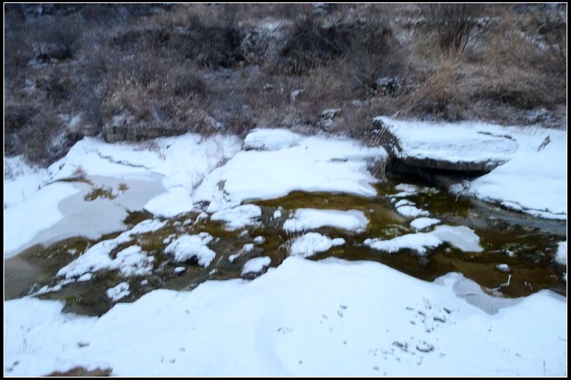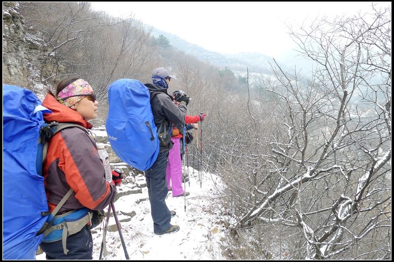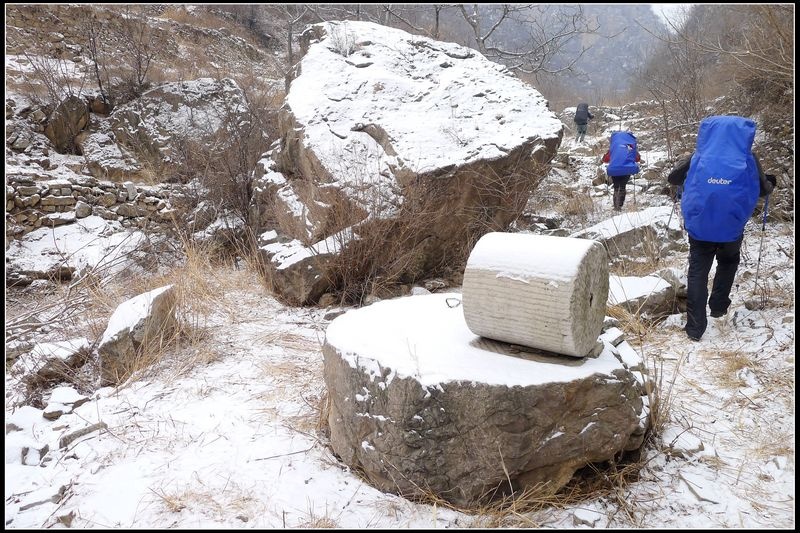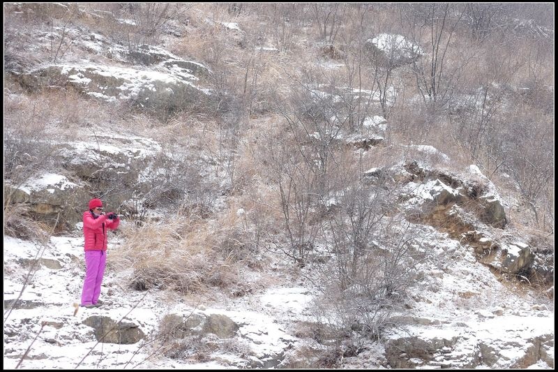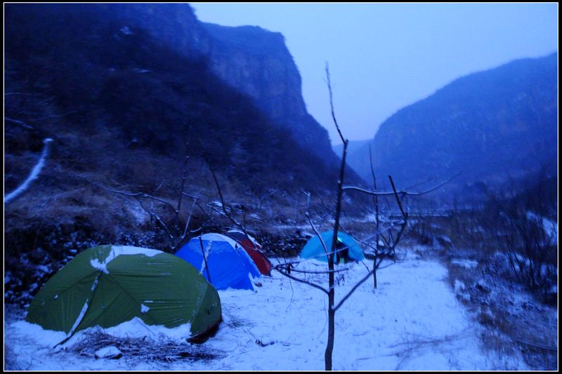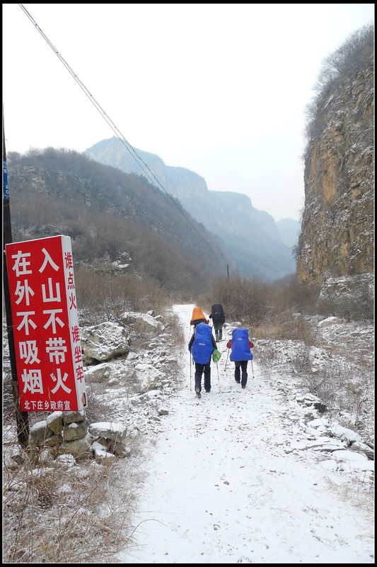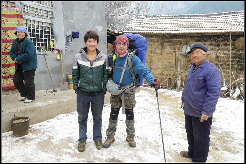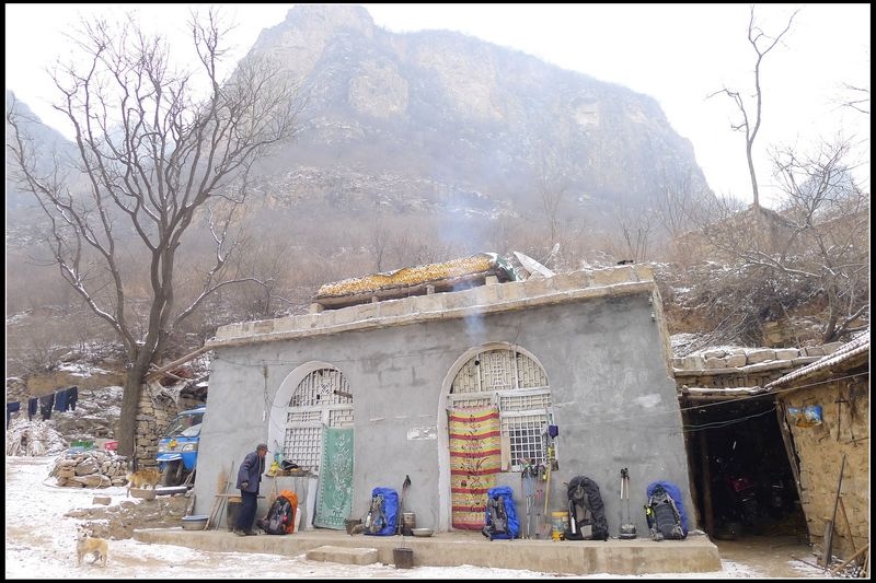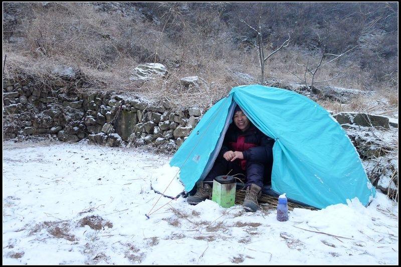 同昨天一样,我睡的很早,吃饱了没事干,外边又冷,不钻被窝干啥呀?钻进被窝里,暖和和的躺着,躺来躺去就睡着了。 一觉醒来,才10点半,惊喜的听到帐篷上的涮涮啦啦的声音,“下雪了”?钻出帐篷看仔细,果然是下雪了,好兴奋。石家庄一冬无雪,不但石家庄,整个华北都旱的不行,雾霾倒是天天有,现在在户外赶上了第一场雪,能不让人兴奋么?。“下雪了”。“下雪了,雪还不小”。连喊了三遍,才有人应了一声。呵呵,都 睡着了,还睡的很死。 此后又是醒醒睡睡,睡睡醒醒,一夜折腾不停。 清晨的营地 营地的早晨 早饭中的龙哥 营地旁的小河 正在拍照营地的铃铛,看着他们想怎么拍就怎么拍,让我好生羡慕、好是嫉妒 9点48,我们上路了,今天 出发时间又不早,同昨天差不多。踏着咯吱咯吱的新雪,我们向下走去,众人都有点小兴奋,是啊,盼雪盼了两个月了,今天终于见到了这个冬季里的第一场雪,如何让人不兴奋。兴奋之余,我心里更多的是担忧:我们今天要翻黑狗尖的山梁,那路本来就不好走,上次就没能走通,现在下了雪,路肯定更难走了,这次我们能穿过去么?不会又象上次那样折戟而归吧?再一想,管它呢,大不了变线,改成走安全的路线,再不行就原路返回,反正要安全第一。户外不就是个玩,不就是个乐么,没了安全,一切全是扯淡。 岔沟里的冰河 上路10分钟,我们拐进另一条沟里,走过这条沟的人,应该对这个沟口有很深的印象,5.1那次穿越的最后一天,不锈钢、老史、车夫、水管就是在这儿和我们分手的。 在外不吸烟,入山不带火。防火警句要牢记 明明是山西的地界,线杆却是河北黄安-盘口的,两省交界处,常有这种扯不清,理还乱的事 踏雪而行 两个带孩子的老乡从上边下来了,这条沟只住着不多的几户人家,平时极少碰上人,我们急忙上前问路,,我们下一步的目标是翻越黑狗尖山脉,那也是一座险山,也是一个老乡都不在翻的山,路很难找。有这个机会我怎能 错过。这个老乡我们昨晚见过,他就是昨晚我们扎营时提醒我们注意防火的老乡,他是来前边村串亲戚的,路并不是很熟。“前边村里有人,你们到那儿再问吧”。 继续前进 11点,我们走到了东山庄,上次我们就是从这儿拐的弯,穿越黑狗尖时因时间关系没翻过去,今天我还想从这儿走。但我心中有一个疑问:在有雪的情况下,下山的路好不好走,我们能安全的翻过去么?这几年,听到的户外事故太多了,在好多人眼里,驴友成了不安全因素的制造者,这可不好。不管如何,我们都要把安全放在第一位。要杜绝各种不安全的因素。 东山庄村只有两户人家,别看村小,却是这条沟、10来个村的地理中心,村口有曾经的东山庄小学,老乡说鼎盛时有50多个学生,如今这条沟里一个学龄儿童也看不到。年轻人都飞走了,这是时代进步的表现。 向老乡问路,这位老哥说我们上次走的路不对,去下口要走另一条沟,然后耐心的向我们说了好长时间,他说的明白,我们也听的明白,但后来我们还是没找到他说的地标,没能按他说的路走通,唉,我们和老乡勾通时常常会出现种种意外,双方的思维、眼光、语言有太大的差异。 在东山庄,我们并不算意外的看到一个老熟人,一个放假在家的小伙子,一个很阳光的风华少年。5.1我们走这条线时小伙子就在家,正背着喷雾器要下地打药,那次我们是向小伙子的爷爷问过路,老爷子耳朵很背,双方勾通了好长时间我们也没问明白。这次向我们介绍路的老乡和小伙子是当家子,在这种只有几户人家的小山村,全村的人往往都沾亲。 告别老乡,我们又向前走去,现在的时间11点多,按老乡所说,如果顺利,我们今天下午就能翻过黑狗尖下盘口,事实上我们的穿越不可能处处顺利,前进的路上总有很多意想不到的困难在等着我们。 虽说是走过一次的路,上路还是走错了,错过了拐弯的路口,好在我及时的发现了错误,只过了路口不足百米。 艰难的爬升,我们奋力的向上攀去,现在我敢肯定,我们走的路没有错。可和我一起走过这条的老王和铃铛却还在质疑。唉,你俩是珠瑙还是玛瑙,这么清楚的路怎么就记不得呢? 路边一景 急剧攀升后是一路平切,到了这时铃铛还在质疑,如此的固执真真的气死我了。妹子啊,你这一路的嚼謦要累死我多少脑细胞啊。俺要是得了老年痴呆症你可得负责。 半个小时后,我们走到了一岔沟处,沟口有两间窑洞,这个村我们来过,我们知道前边不远还有一条岔沟,沟口也有房屋。“岔沟那有两个窑、旁边有两棵梨树、还有两个洞洞。”这儿的房子都是窑洞形式的建筑,老乡说的是哪两个窑?哪儿有两个洞洞,哪儿又是老乡说的那两棵梨树?我们有点懵。搜索,一条沟一条沟的搜索,没能找到两个洞洞,也无法确定我们该走哪条沟。 废村的窑洞式的建筑 等待探路结果时的铃铛 一个小时过去了,仍无法确定哪条沟是我们应该走的沟,我们只能冒然的往前走,选择最有可能的那条沟向上走。 沿着梯田一边的路向前,时间不长路变的越来越小,可老乡说的翻梁的路一直没有出现,这条沟莫非不对?“龙哥,别走了,退回去再问问老乡吧。”不甘心,真的不甘心退回去,这条沟地势并不复杂,如果天气好,如果是上午,既便路不明显甚至没路我们也敢走。现在不行,天寒地冻又有雪,时间也有点晚。如果继续冒然的往前走,一旦找不到我们要走的路,今天就不可能翻过山去,这种地形的山上又很难有营地,那我们就只能往回返,白白的消耗体力和
