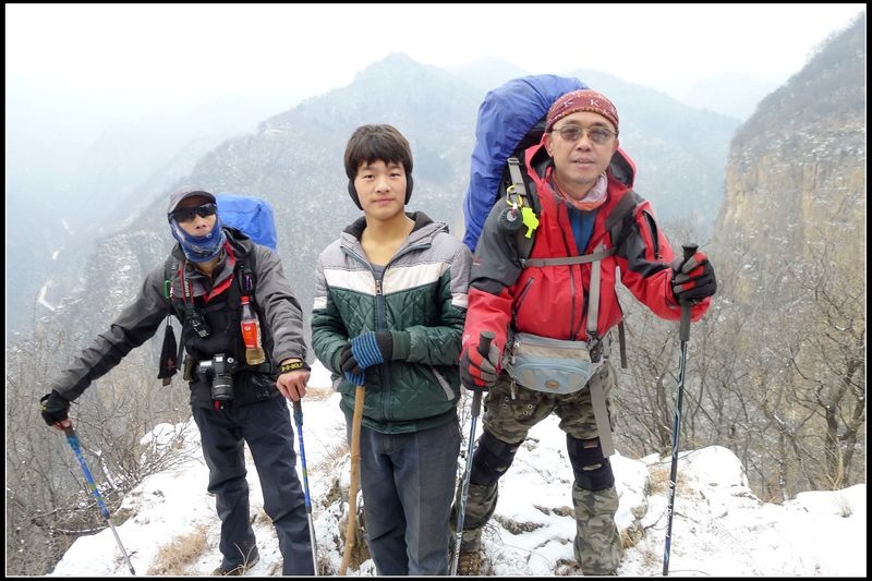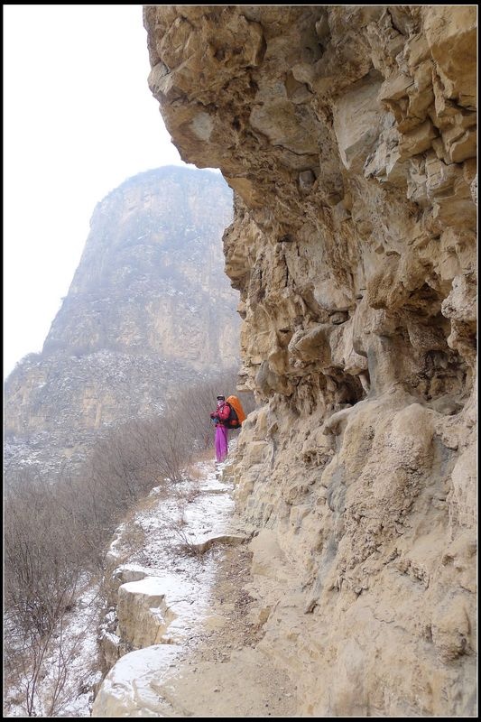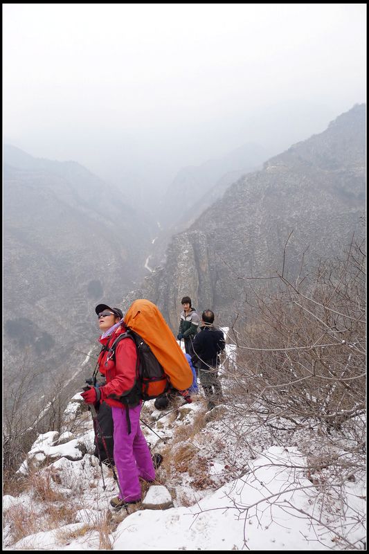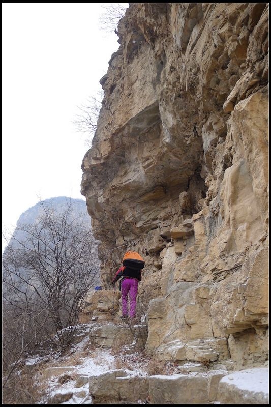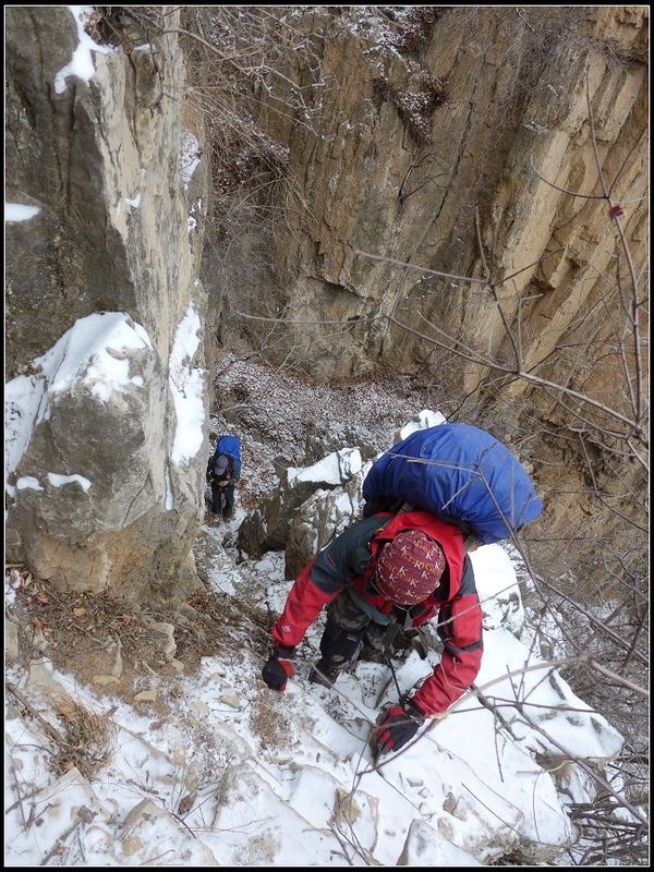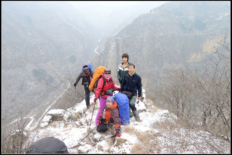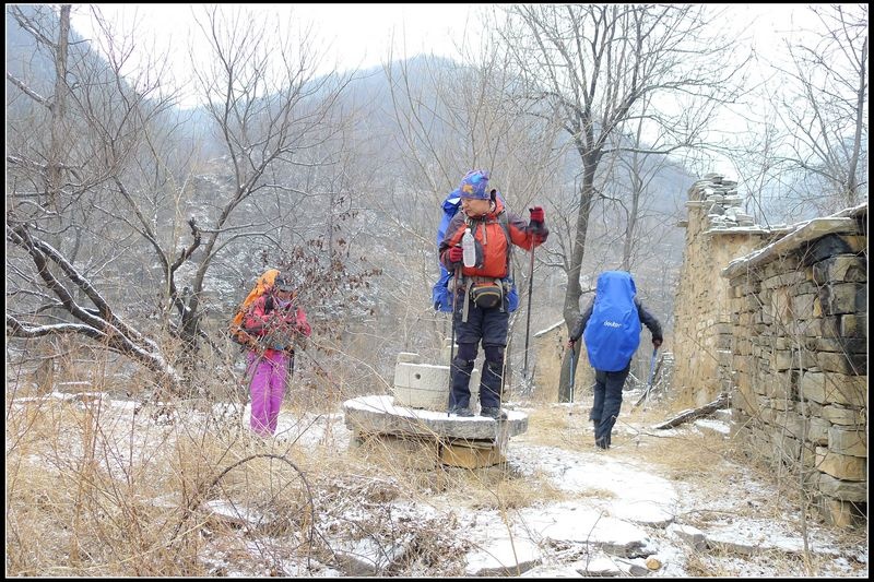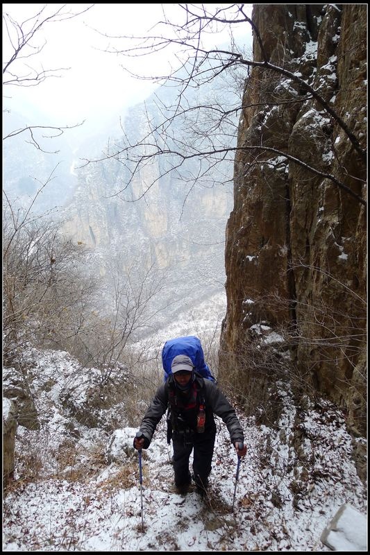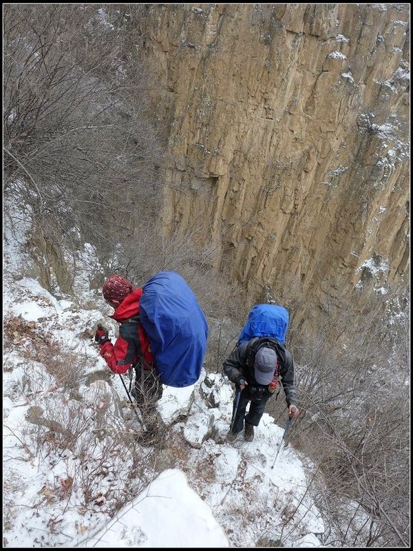简单的吃罢午餐,我们跟着小伙子上路了,小伙子领我们走了条近路,一条需要贴着崖边走的路。上路前老乡再三叮嘱我们路上慢点,注意安全。 路果然不好走,有的地方我们的脚下只有不足10来宽的石楞,如果不是小伙子走在前边,根本看不出是条路,口说无凭,还是看照片吧。咦,这是谁拍的照片?那么险的路怎么拍的气势全无呢? 拐过一个弯,又踩着崖边的石楞子硬向上爬了一截后,脚下出现了石阶,此时我们才相信我们走的真是一条路。 小伙子走的很快,他不时的停下来等等我,我则要不时的等等后边的队友,看着身后艰难上升中的队友,我突然想起了那首《蜗牛与黄鹂鸟》的歌:“蜗牛背着那重重的壳呀, 一步一步地往上爬。” 我们就是那慢慢腾腾的蜗牛,小伙子就象那黄鹂鸟。 下午3点半,我们登上崖顶,俯视脚下,让人有种直上云霄的感觉。 小伙子要回去了,他说前边没了岔路,一直走就行。“谢谢你,小伙子,来,咱们合个影吧。” 双方依依不舍的分手了,我们再三表示感谢,同时叮嘱:“下山慢点,千万注意”。刚才那条路。上山且不易,下山更难。 沿着崖边的小路,我们向前走去,覆了雪的小路上只有不知名的小动物的脚印。路一直贴着崖边走,脚下就是几十丈深的深渊,如果脚下一滑滚下去,肯定就会粉身碎骨,毫安无任何悬念。“你们先走一步,我紧一下鞋带”,细节决定成败,这些小事千万不能马虎。 雪地上,小动物的脚印 10多分钟后,我们的眼前出现了建筑,不会吧,我计划扎营的废村这么快就到了? 我们真的已经到了计划中的营地。这个村废弃的时间不算太长,多数房屋保存的不错,有的内部还很干净,一个窑内扎三四顶帐篷正好。虽说现在的时间还不到4点,扎营真的有点早,可再往前走很难找到这么好的营地了,不是有那么一句话么——过了这个村就没有这个店。我们决定就在这个店扎营了。 “水源在哪儿,先找水源。” 小伙子的父亲说这个村里有盘磨,在磨那儿就能找到泉眼。几个人进村转开了,很快就有了惊喜的喊声:“磨,磨在这里。”随后是失望的声音:“只有磨,没有水源。” 我没有进村, 我一直在沿着沟底找。很快,我在沟对面找到了一个渗出泉,被冻的梆梆硬的渗出泉。没关系,咱带着刀呢。破冰。 村里的建筑 经过比较,我们选择了村边的一座房屋做为我们的营地,那三孔窑就在路边,建筑非常完好,院里屋里也比较干净,稍加打扫就行。有人戏说,是5星级的营地。啥星不星的,咱又不是去开房,只要自己满意就行。 我们扎营的房子 刚刚5点,我们已经完成了扎营的工作,随后开始了FB活动。记忆中我还从没有这样早的休息过,这次真的是FB透顶了。 热气在窑洞内飘荡,空气中飘着浓郁的酒肉的香味,这个小山村应该好久飘荡过这样的香味了,不知我们的大餐会不会引的那些清贫惯了小动物哈啦子横流,唉,不说了,我已经撑的走不了道了。都说爬山减肥,这样FB能减肥么?