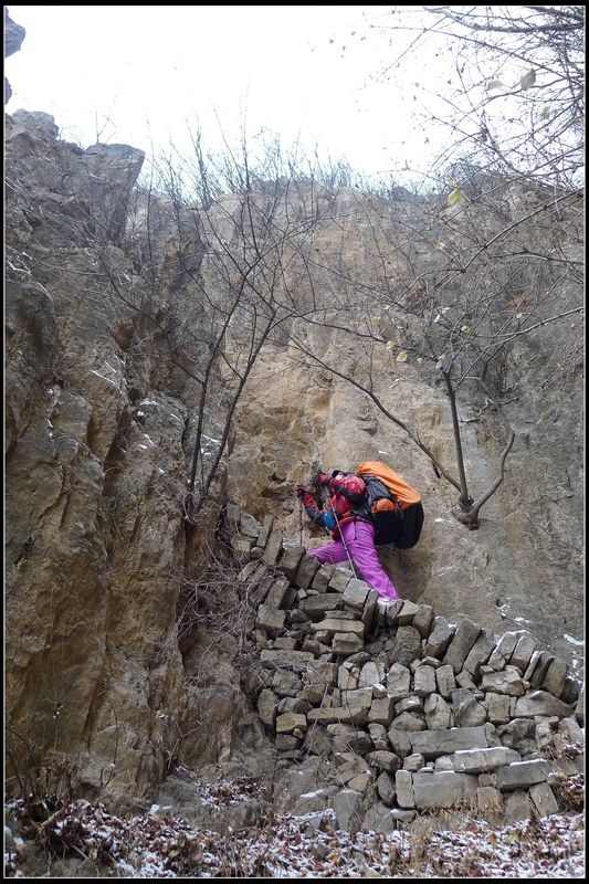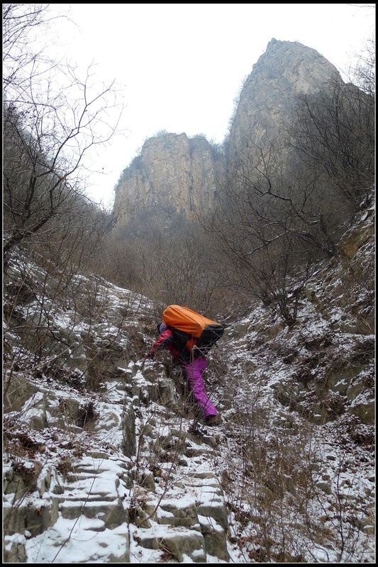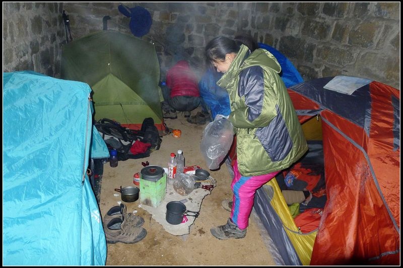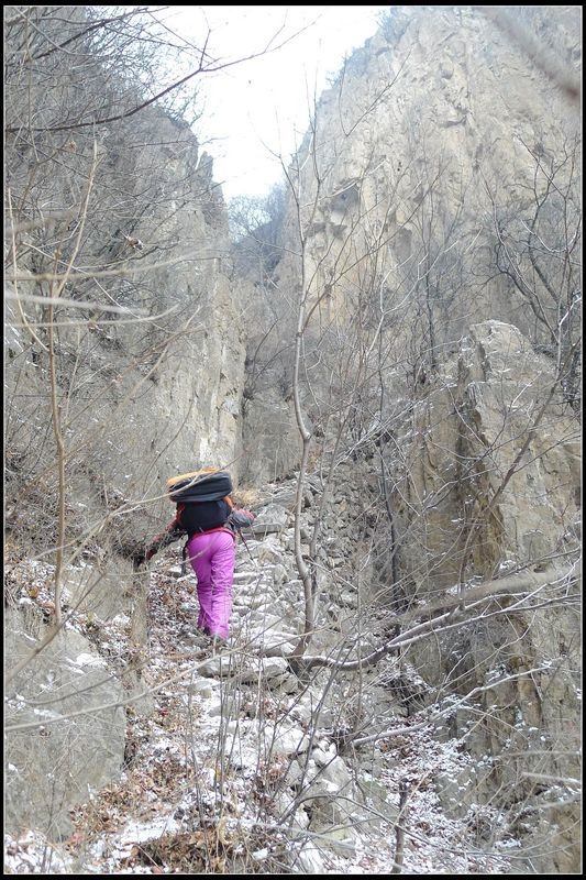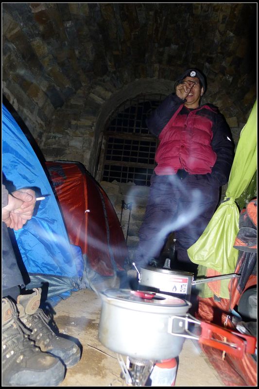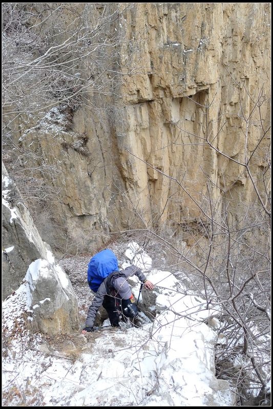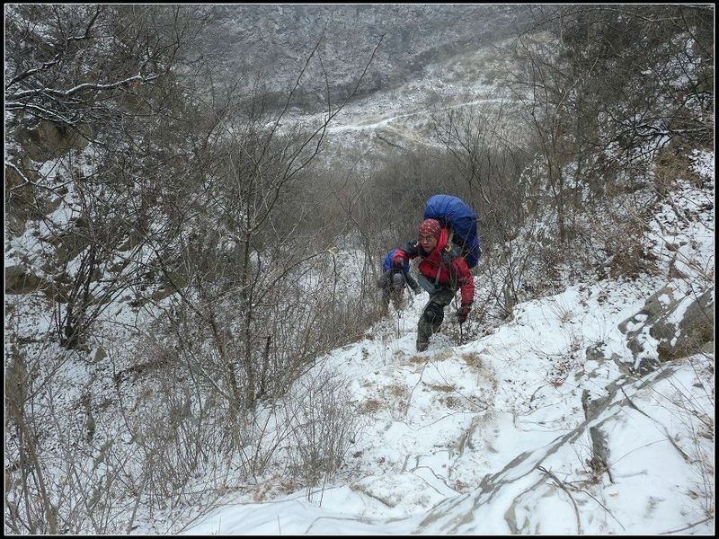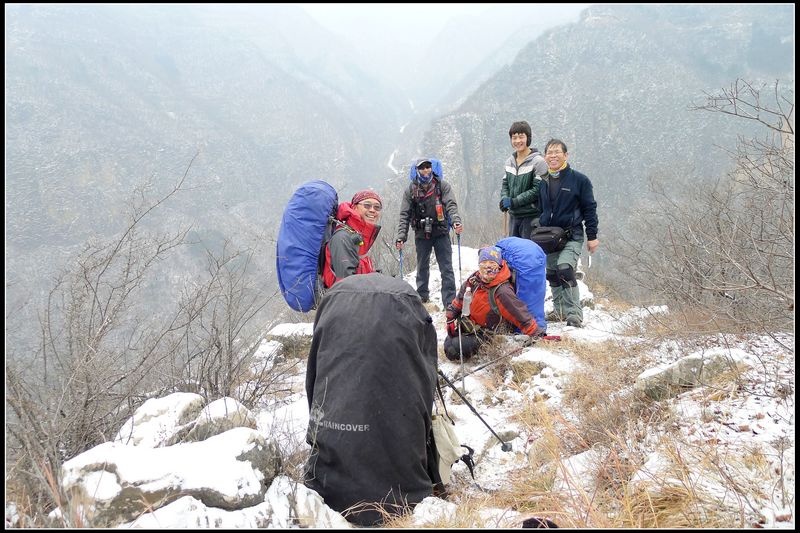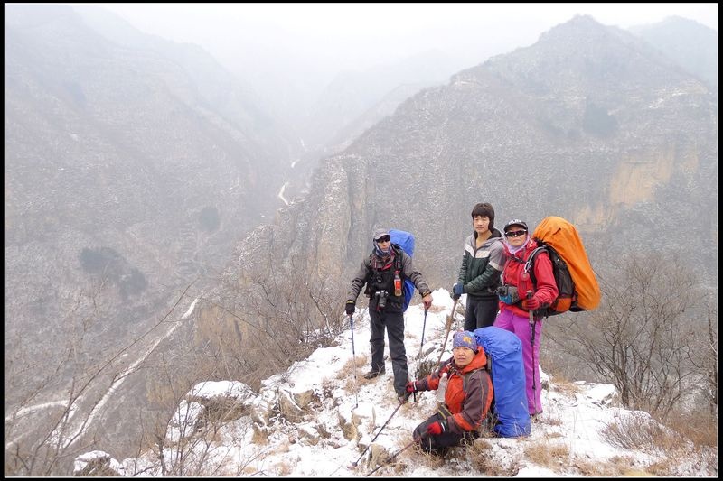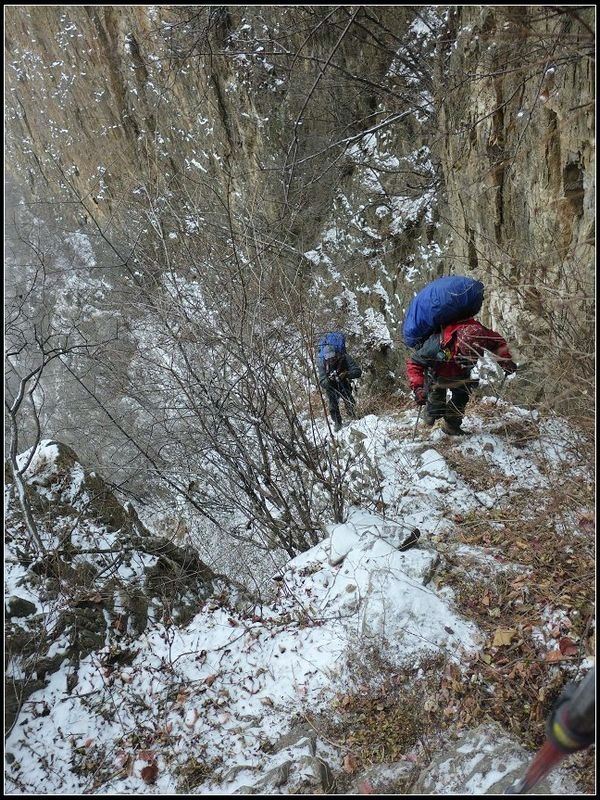 简单的吃罢午餐,我们跟着小伙子上路了,小伙子领我们走了条近路,一条需要贴着崖边走的路。上路前老乡再三叮嘱我们路上慢点,注意安全。 路果然不好走,有的地方我们的脚下只有不足10来宽的石楞,如果不是小伙子走在前边,根本看不出是条路,口说无凭,还是看照片吧。咦,这是谁拍的照片?那么险的路怎么拍的气势全无呢? 拐过一个弯,又踩着崖边的石楞子硬向上爬了一截后,脚下出现了石阶,此时我们才相信我们走的真是一条路。 小伙子走的很快,他不时的停下来等等我,我则要不时的等等后边的队友,看着身后艰难上升中的队友,我突然想起了那首《蜗牛与黄鹂鸟》的歌:“蜗牛背着那重重的壳呀, 一步一步地往上爬。” 我们就是那慢慢腾腾的蜗牛,小伙子就象那黄鹂鸟。 下午3点半,我们登上崖顶,俯视脚下,让人有种直上云霄的感觉。 小伙子要回去了,他说前边没了岔路,一直走就行。“谢谢你,小伙子,来,咱们合个影吧。” 双方依依不舍的分手了,我们再三表示感谢,同时叮嘱:“下山慢点,千万注意”。刚才那条路。上山且不易,下山更难。 沿着崖边的小路,我们向前走去,覆了雪的小路上只有不知名的小动物的脚印。路一直贴着崖边走,脚下就是几十丈深的深渊,如果脚下一滑滚下去,肯定就会粉身碎骨,毫安无任何悬念。“你们先走一步,我紧一下鞋带”,细节决定成败,这些小事千万不能马虎。 雪地上,小动物的脚印 10多分钟后,我们的眼前出现了建筑,不会吧,我计划扎营的废村这么快就到了? 我们真的已经到了计划中的营地。这个村废弃的时间不算太长,多数房屋保存的不错,有的内部还很干净,一个窑内扎三四顶帐篷正好。虽说现在的时间还不到4点,扎营真的有点早,可再往前走很难找到这么好的营地了,不是有那么一句话么——过了这个村就没有这个店。我们决定就在这个店扎营了。 “水源在哪儿,先找水源。” 小伙子的父亲说这个村里有盘磨,在磨那儿就能找到泉眼。几个人进村转开了,很快就有了惊喜的喊声:“磨,磨在这里。”随后是失望的声音:“只有磨,没有水源。” 我没有进村, 我一直在沿着沟底找。很快,我在沟对面找到了一个渗出泉,被冻的梆梆硬的渗出泉。没关系,咱带着刀呢。破冰。 村里的建筑 经过比较,我们选择了村边的一座房屋做为我们的营地,那三孔窑就在路边,建筑非常完好,院里屋里也比较干净,稍加打扫就行。有人戏说,是5星级的营地。啥星不星的,咱又不是去开房,只要自己满意就行。 我们扎营的房子 刚刚5点,我们已经完成了扎营的工作,随后开始了FB活动。记忆中我还从没有这样早的休息过,这次真的是FB透顶了。 热气在窑洞内飘荡,空气中飘着浓郁的酒肉的香味,这个小山村应该好久飘荡过这样的香味了,不知我们的大餐会不会引的那些清贫惯了小动物哈啦子横流,唉,不说了,我已经撑的走不了道了。都说爬山减肥,这样FB能减肥么?