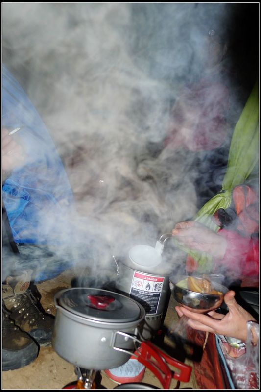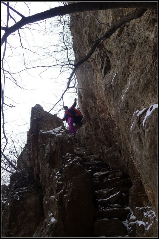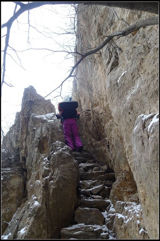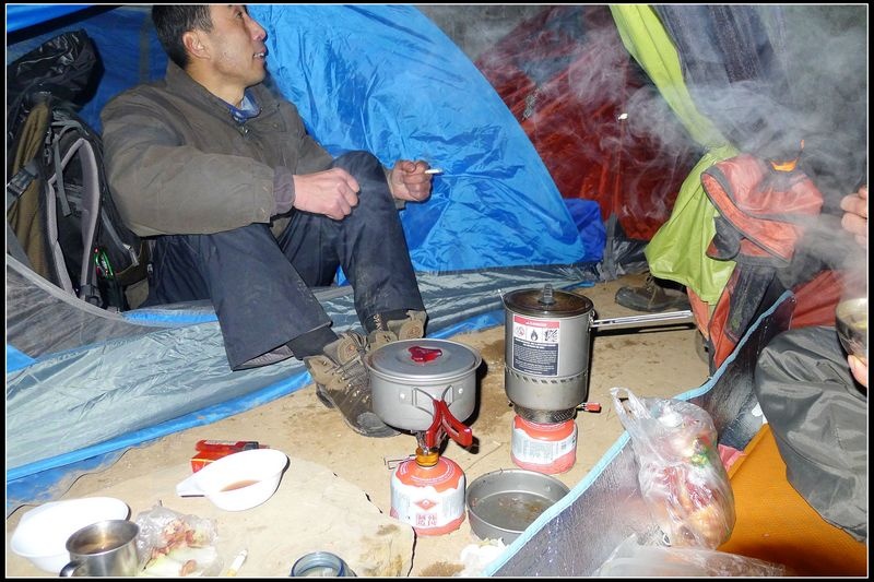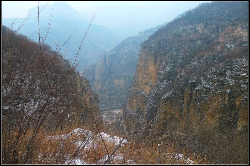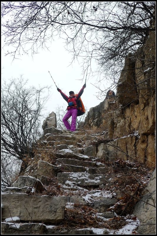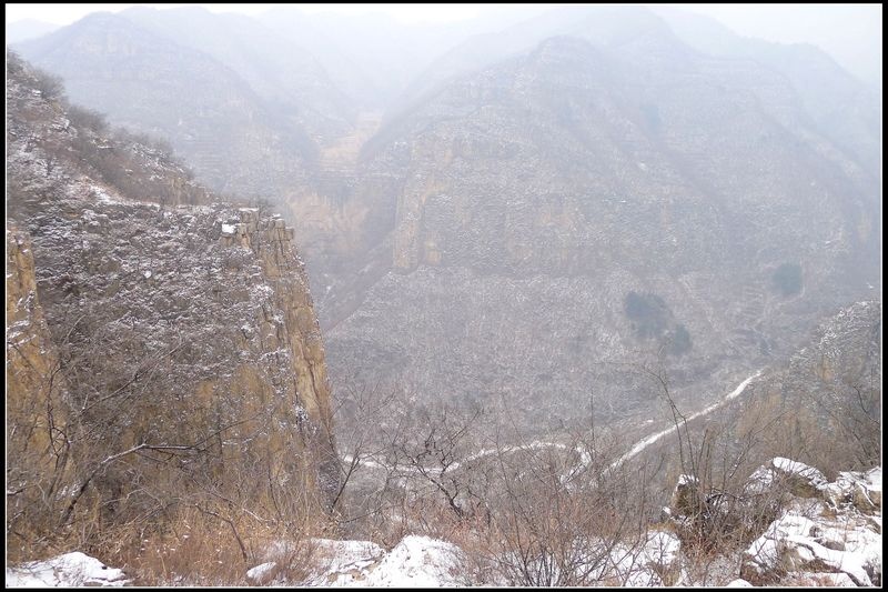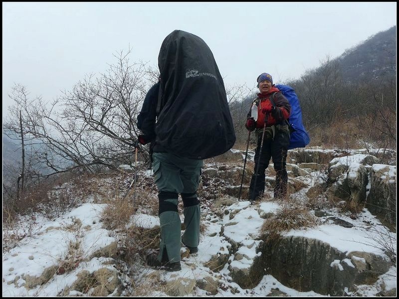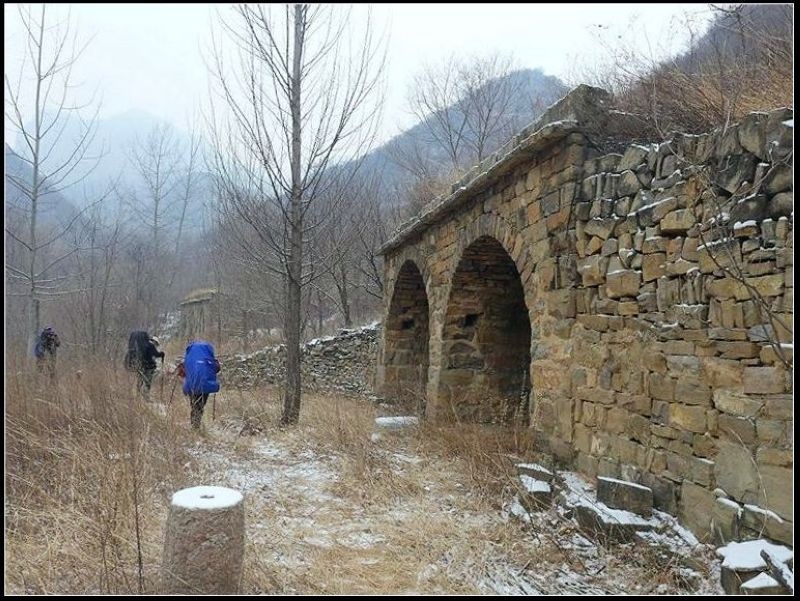 简单的吃罢午餐,我们跟着小伙子上路了,小伙子领我们走了条近路,一条需要贴着崖边走的路。上路前老乡再三叮嘱我们路上慢点,注意安全。 路果然不好走,有的地方我们的脚下只有不足10来宽的石楞,如果不是小伙子走在前边,根本看不出是条路,口说无凭,还是看照片吧。咦,这是谁拍的照片?那么险的路怎么拍的气势全无呢? 拐过一个弯,又踩着崖边的石楞子硬向上爬了一截后,脚下出现了石阶,此时我们才相信我们走的真是一条路。 小伙子走的很快,他不时的停下来等等我,我则要不时的等等后边的队友,看着身后艰难上升中的队友,我突然想起了那首《蜗牛与黄鹂鸟》的歌:“蜗牛背着那重重的壳呀, 一步一步地往上爬。” 我们就是那慢慢腾腾的蜗牛,小伙子就象那黄鹂鸟。 下午3点半,我们登上崖顶,俯视脚下,让人有种直上云霄的感觉。 小伙子要回去了,他说前边没了岔路,一直走就行。“谢谢你,小伙子,来,咱们合个影吧。” 双方依依不舍的分手了,我们再三表示感谢,同时叮嘱:“下山慢点,千万注意”。刚才那条路。上山且不易,下山更难。 沿着崖边的小路,我们向前走去,覆了雪的小路上只有不知名的小动物的脚印。路一直贴着崖边走,脚下就是几十丈深的深渊,如果脚下一滑滚下去,肯定就会粉身碎骨,毫安无任何悬念。“你们先走一步,我紧一下鞋带”,细节决定成败,这些小事千万不能马虎。 雪地上,小动物的脚印 10多分钟后,我们的眼前出现了建筑,不会吧,我计划扎营的废村这么快就到了? 我们真的已经到了计划中的营地。这个村废弃的时间不算太长,多数房屋保存的不错,有的内部还很干净,一个窑内扎三四顶帐篷正好。虽说现在的时间还不到4点,扎营真的有点早,可再往前走很难找到这么好的营地了,不是有那么一句话么——过了这个村就没有这个店。我们决定就在这个店扎营了。 “水源在哪儿,先找水源。” 小伙子的父亲说这个村里有盘磨,在磨那儿就能找到泉眼。几个人进村转开了,很快就有了惊喜的喊声:“磨,磨在这里。”随后是失望的声音:“只有磨,没有水源。” 我没有进村, 我一直在沿着沟底找。很快,我在沟对面找到了一个渗出泉,被冻的梆梆硬的渗出泉。没关系,咱带着刀呢。破冰。 村里的建筑 经过比较,我们选择了村边的一座房屋做为我们的营地,那三孔窑就在路边,建筑非常完好,院里屋里也比较干净,稍加打扫就行。有人戏说,是5星级的营地。啥星不星的,咱又不是去开房,只要自己满意就行。 我们扎营的房子 刚刚5点,我们已经完成了扎营的工作,随后开始了FB活动。记忆中我还从没有这样早的休息过,这次真的是FB透顶了。 热气在窑洞内飘荡,空气中飘着浓郁的酒肉的香味,这个小山村应该好久飘荡过这样的香味了,不知我们的大餐会不会引的那些清贫惯了小动物哈啦子横流,唉,不说了,我已经撑的走不了道了。都说爬山减肥,这样FB能减肥么?