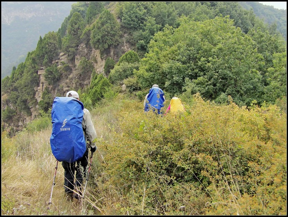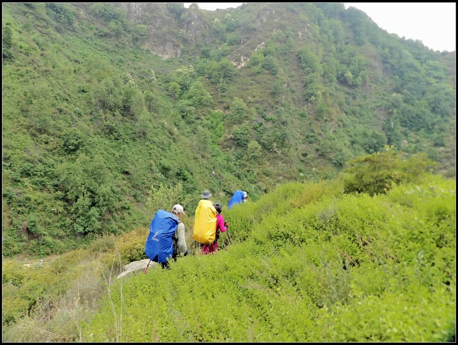 行无多远,又是一个垭口,路又一次的向右边的沟里,不,是向右边的一条岔脊拐去。而正前方是一个很陡的山头。“龙哥, 前边没路了,下不下沟”? “没路了就下沟吧”。此时,我确认从这儿下去就是串上。我想抓紧时间下赶到串上,争取今晚能翻到牛圈坪或石沟寨去。 一行人向下走去,然而,在我们到达串上后,我们并没有继续往前走,而是就地扎了营,早早的扎了营。此时我好后悔,早知如此, 还不如在山上不下来,沿山脊继续向西走呢,哪里怕走不通,耽误会时间,再原路退回来也行。可世上有卖后悔药的么? 小路迅速的降了下去,这是一个不大的小山腿。让人想不到的是,很清楚很清楚的路在山脊上又消失了。脚下是一条沟,沟底有废弃的梯田,有明显的路, 沟的对面就是那道通向杏树尖的山脊,我们决定尽快下沟,尽管沟边地势很陡,很难下去, 但只要我们下到沟底,以后的路就象玩一样了。 下降中又找到一条路,一条几乎分辨不出来的路,这虽然不是我们走丢的那条路,但有路总比没路好走,我们沿着这条小路来回的拐着,向沟底走去。 沟对面,通往杏树尖的那道山脊,貌似并不难走