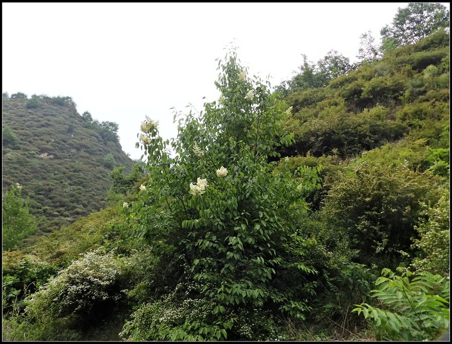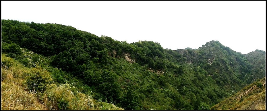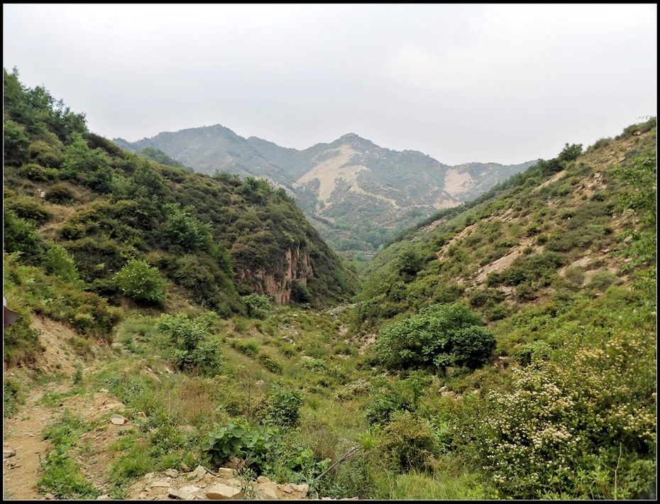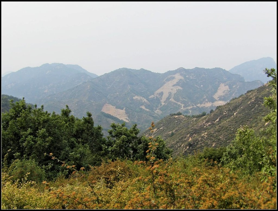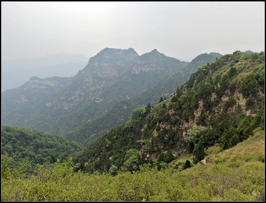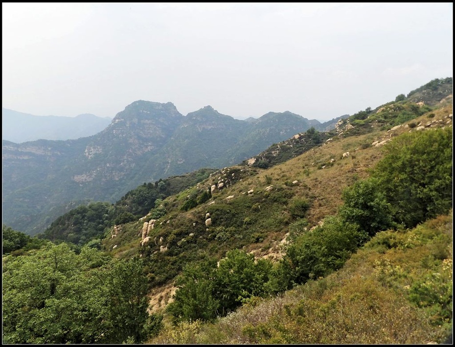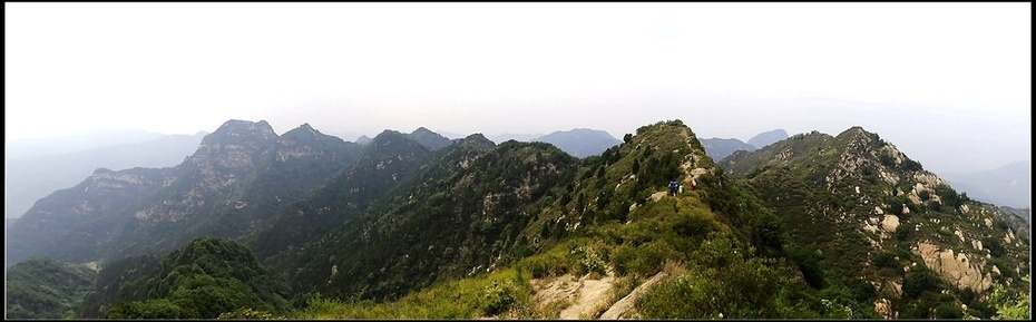 从地图上看那座山应该是杏树尖。杏树尖是百度地图上标着名的山,它位在山西界内,不是晋冀两省的界山,因此我们这次不走杏树尖,只会与它擦尖而过。尽管如此,遥看着杏树尖,我内心有一种强烈的燥动,真想穿过去近距离的认识一下那座山。可这次没有这个计划,也没有那个时间。唉,时间,时间怎么总是不够用呢 从不同的位置看杏树尖 来张宽银幕的大图