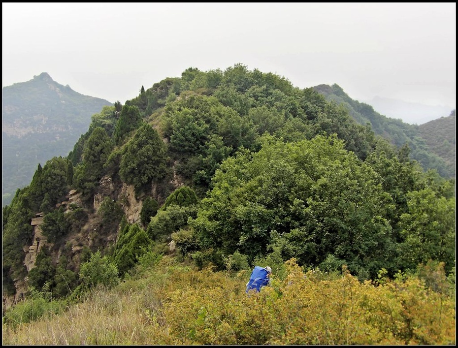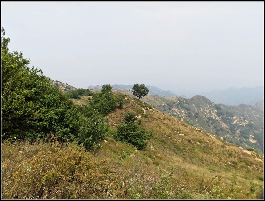 只顾拍照,前边,已走出去老远的队友们停了下来,原来那个垭口有条岔路,有条向右下沟的岔路,这是我们在山上看到的第一条下山路。我分辨不清这条路下的是不是串上,更主要的原因,我还想继续沿山脊向前走,向杏树尖方向走,哪怕走不到杏树尖,能走的近一点也行,因为在我心中,那道巍峨的山脊才是晋冀两省的界山。 “不下沟,继续走山脊”。一行人沿山脊继续向西。
