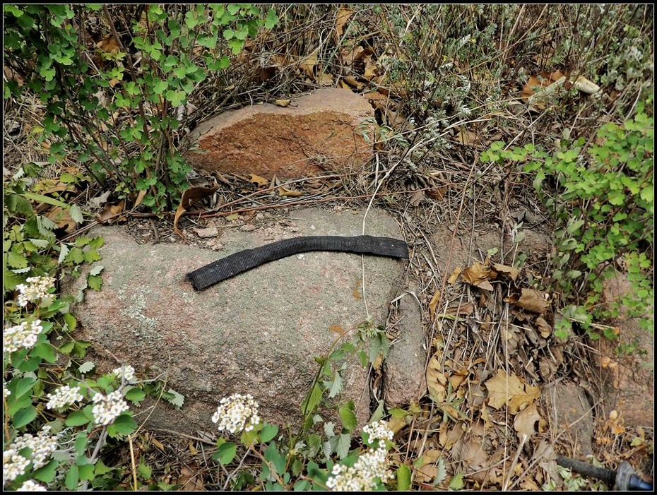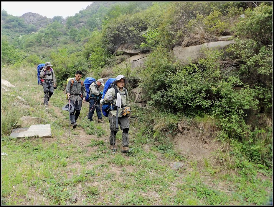 不知不觉中,山脊折向了西北,隔着深沟,我们的左手出现了一座巍峨险峻的大山。“龙哥,咱们不会往那座山穿吧”?有人问道。“不会的,咱们要一直顺山脊走,那座山跟咱们隔着沟呢,怎么穿也穿不到那座山去”。“我满有把握的回答。 说不清从什么时候开始,脚下的路清楚一些了,不仅如此,路边还出现了少量垃圾,其中最具代表性的垃圾是一截黑色的织带,象是包上的提带,这儿莫非有驴友来过?要不然的话,怎么会出现这种垃圾?后来串上的老乡说,这一带的确偶尔的有阳泉的驴友来。