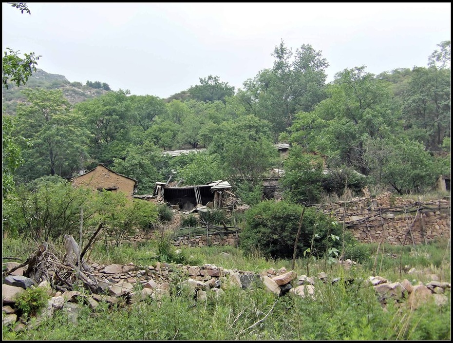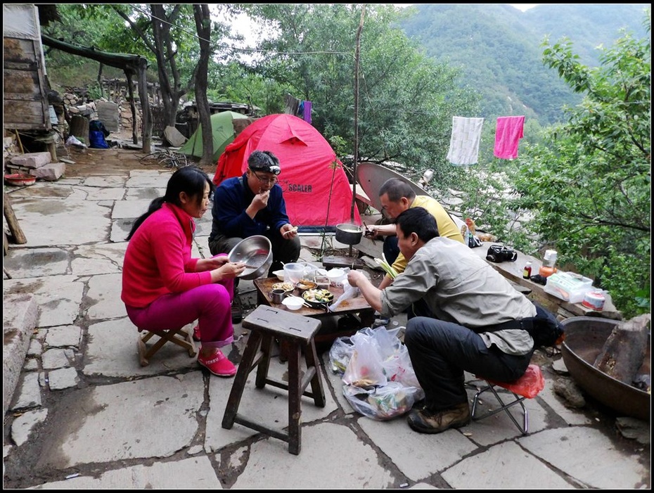 从地图上看,从串上向北走,翻上村北的山脊,再沿山脊向北走是石沟寨,再往北是花果山,这两座山都是山西、河北的界山,这是我最想走的路线。如果不往石沟寨走,直接顺沟下山可到牛圈坪,然后我们可以顺沟到石家塔,从石阎路上坐车回家;也可以从牛圈坪再翻花果山河北的四里铺或猴吻坐车回家。另外,我们还可以从串上还可以顺沟往东走,经小岭、大柳树到九里铺。也可以从串上向西走,翻一个小梁到下松川。总之选择很多, 我准备去村里问一下路,再决定往哪里边走。正在这时铃铛说话了:“龙哥,别走了,在这儿扎营吧,我有点累了”。铃铛会累?不可能,她应该是在考虑老吴,老吴这次出来状态不太好,虽然老吴自己没说累,但路上走着有点吃力。“好吧,不走了,在这儿扎营”。现在的时间刚刚3点半,用海天的话说:在农村,这个时间正是人们歇够了晌,下地干活的时间,可我们却要扎营了,回想起来,玩户外10多年了,这是扎营最早的一次。特殊一回吧,就当是过年了。 我们在村口犹豫