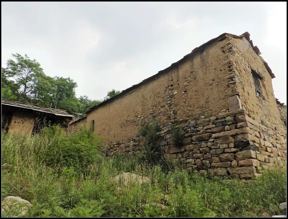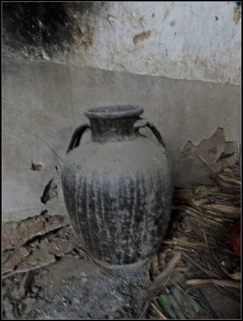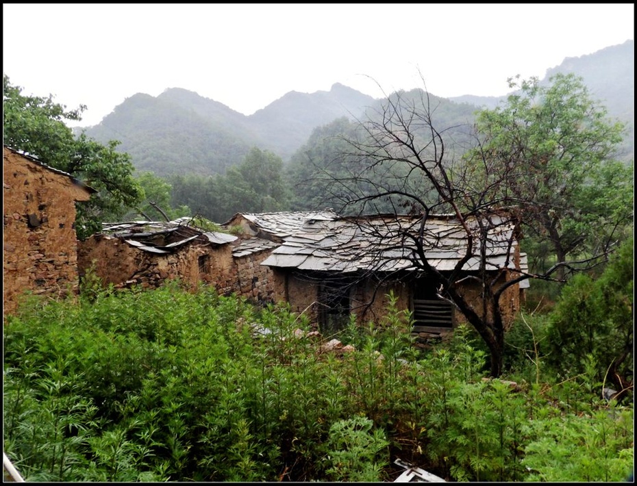 老乡非常热情,见我们没有进村,女主人自己迎了过来。原来串上现在只住着一户人家,主人姓梁。老梁有四个孩子,四个孩子都在外边,或打工或上学,家里只有老夫妻两人,主要靠刨药为生。问起翻山的路,女主人说她娘家就是牛圈坪的,但现在娘家人都搬出去了,所以她20年没走回牛圈坪的小路了,“不好走,路全被枝子忽死了”。这是意料之中的。 串上的老房子 老乡答应我们到他家的小院扎营。然而,象大多数山村一样,老梁家的小院不大,扎3顶帐篷还行,再多人就转不开圈了。最终,老吴、涵冰把帐篷把在老梁的小院里,我和奔雷、海天谢绝老乡的好意,决定把帐篷扎到村口的沙地上。铃铛呢?铃铛住的是农家乐。 准备下去扎营。刚到村口,一阵急雨袭来,急忙跑一弃屋去避雨,还不错,雨仅下了不到半小时,它要是下个没完,扎营可就麻烦了。避雨时拍的弃屋,仔细看能看见屋顶流下来的水线 弃屋里的双耳陶罐