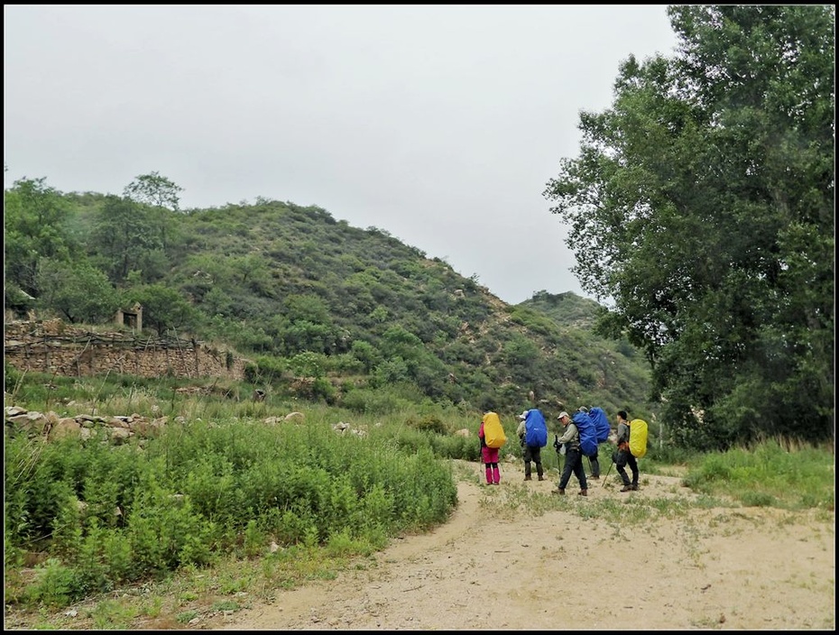 走在大路上的队友 一直走出沟口才看见房屋,这是个不大的小山村,看规模最多5、6户人家。它是串上么,应该是,但谁知道我的判断是对还是错。更主要的是下一步我们应该往哪里儿走,要是有老乡问一问就好了。 村里传来狗叫,“有人“。于是几个人冲着村子大喊起来:“老乡——,老乡——”。"有人么,这是什么村呀"。良久,村里传来回声:“是串上”。