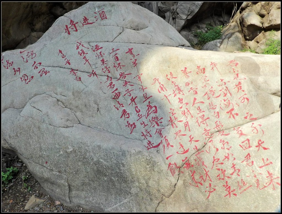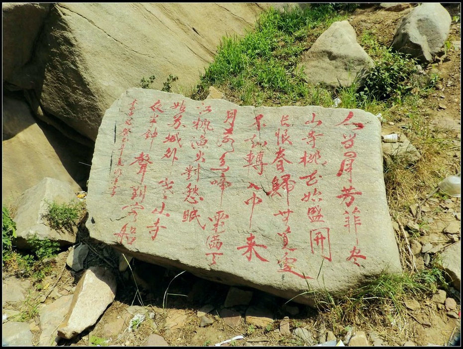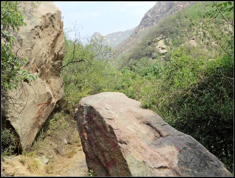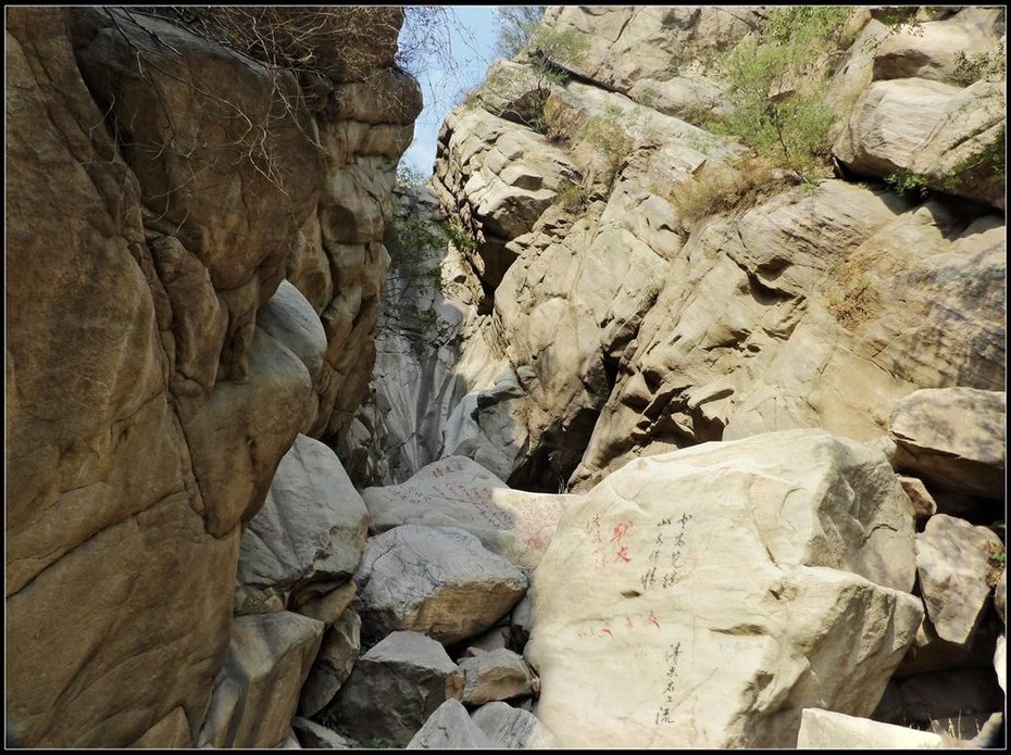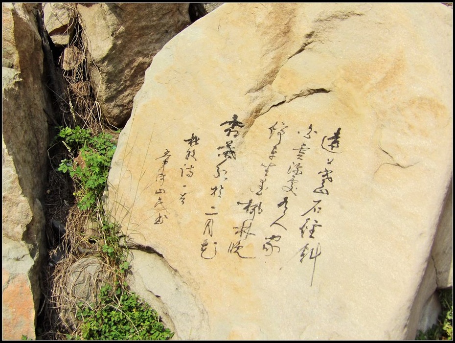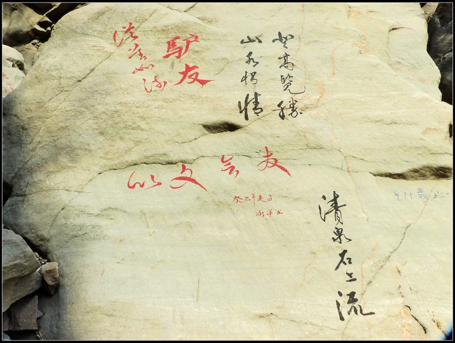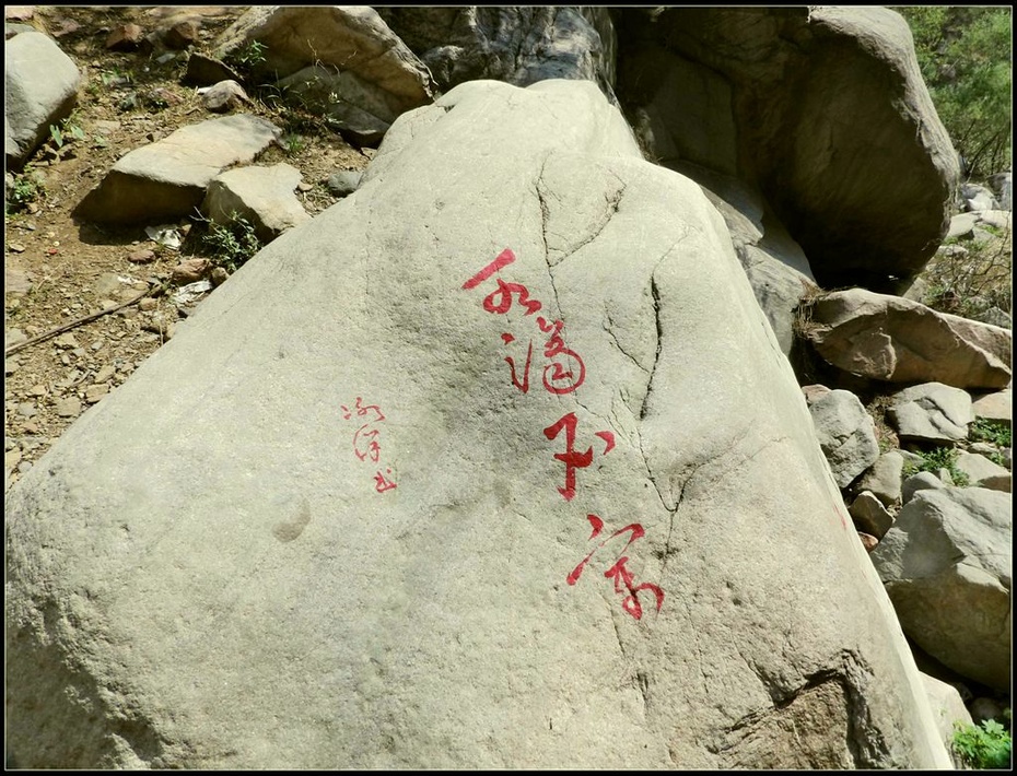 路过的一小断层 过小水库不远沟分两岔,左手的岔沟是一条嶂谷,尽头是一十几米高的小瀑布,若是有水,这儿绝对是一处上佳之景,可惜现在瀑布干干的,我只能从昔日的模糊记忆及岩壁上水流冲涮的痕迹来臆想它往日的辉煌了。 小瀑布前的岩石上,不知什么人留下了很多墨迹,从色彩上看,这些字出现的时间并不太长,当是今年才出现的。用我的拙眼看,那些字如行云流水一般,绝对称的上是大家之作。说起来户外的字大体分为两类,一种某些不知天高地厚的人的涂鸦,比如那些张三李四到此一游类的胡写乱画,毫无美感不说,还只能污染别人的眼球。这种东西越少越好,最好能从根本上杜绝;还有一种是文人墨客的题字,这样的题字很有艺术性,能增加大自然的美,可以适当有一些。现在的这些字,就属后一类吧。