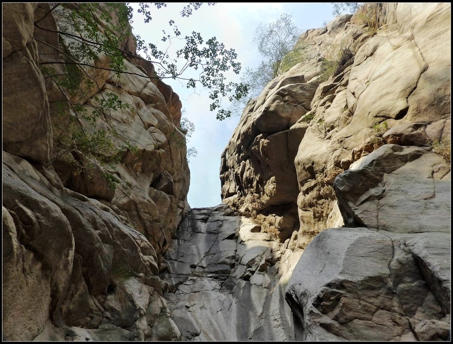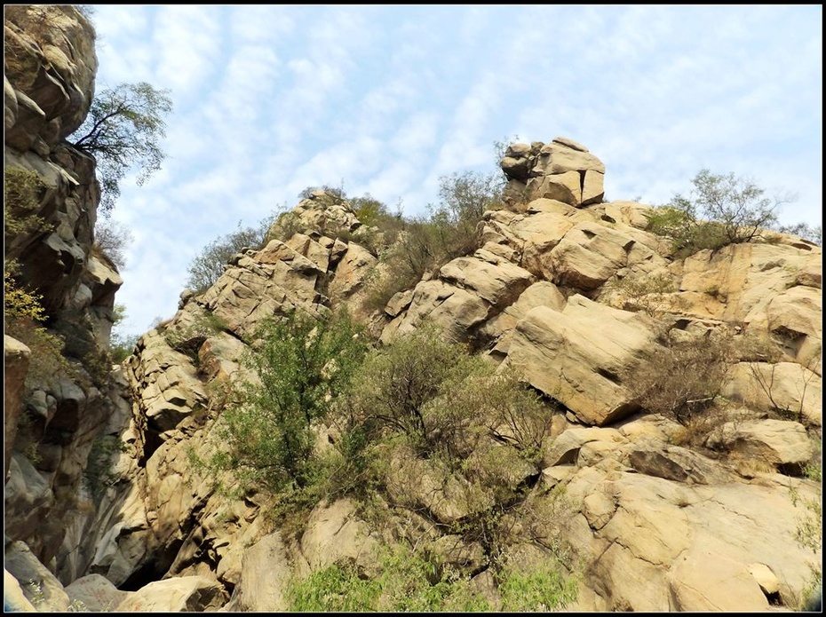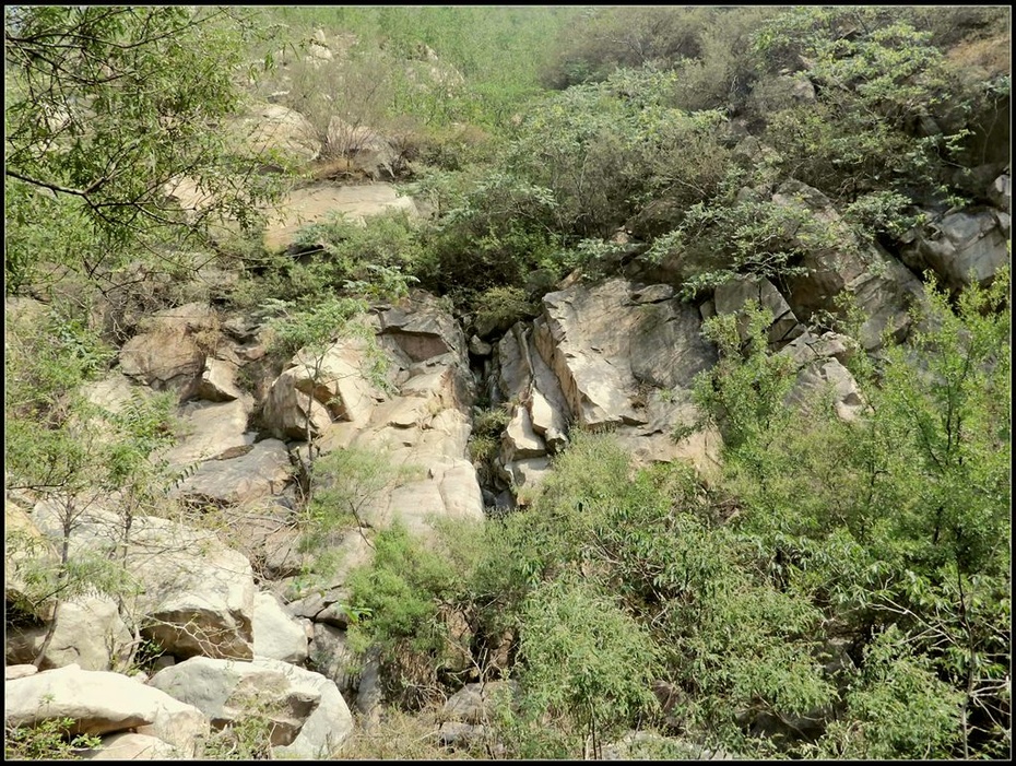 现在,我们应该反过来说一说五峰山了。在石家庄近郊的山中,五峰山是一座普通的山,却又是一座不寻常的山。说它普通是因为它即不是什么历史文化名山,也非什么风景名胜区,它就是一座普普通通的山,是一座普通的在石家庄地图上都找不到的山,若不是这几年户外运动的兴起,有几个石家庄人会知道他的身边有这么一座山呢?说它不寻常是因为五峰山不同于它周边的其它山,五峰山比较险,它四面悬崖,只有东、南两条羊肠小路可以登顶,虽不敢说登五峰山难于上青天,但也绝非胆小之人敢于登攀的。险山多恶石,五峰山有各种各样的石墙、石脊、石峰、石岩,它们构成了山的骨架、山的灵魂,让这座山能在周边的山群中脱颖而出。不过,单纯说险五峰山并无绝对的优势,在石家庄市近郊,以险制胜的山并非五峰山下一座,如天下闻名的抱犊寨、红色圣山挂云山,其险其恶并绝不在五峰山话下,甚至比五峰山有过之而无不及。五峰山除了险之外还有另一个优势:水,我走的这条沟眼下虽然没有一滴水,但往年可有一股涓涓细流的,虽说水流有点小,但你别忘记了这儿是浅山区,是平原与山区交界的浅山区,这样的地方绝大多数的山都是干巴巴的秃山,有几个有水的?更何况这条沟里的水常年不枯,还有两个不大不小的瀑布呢。能将险峻与流泉水集于一身,加上还说的过去的植被,在户外运动方兴未艾的今天,五峰山想不火都难。 五峰山的石