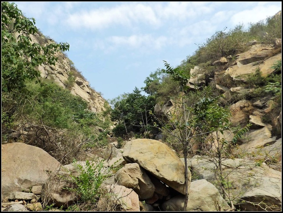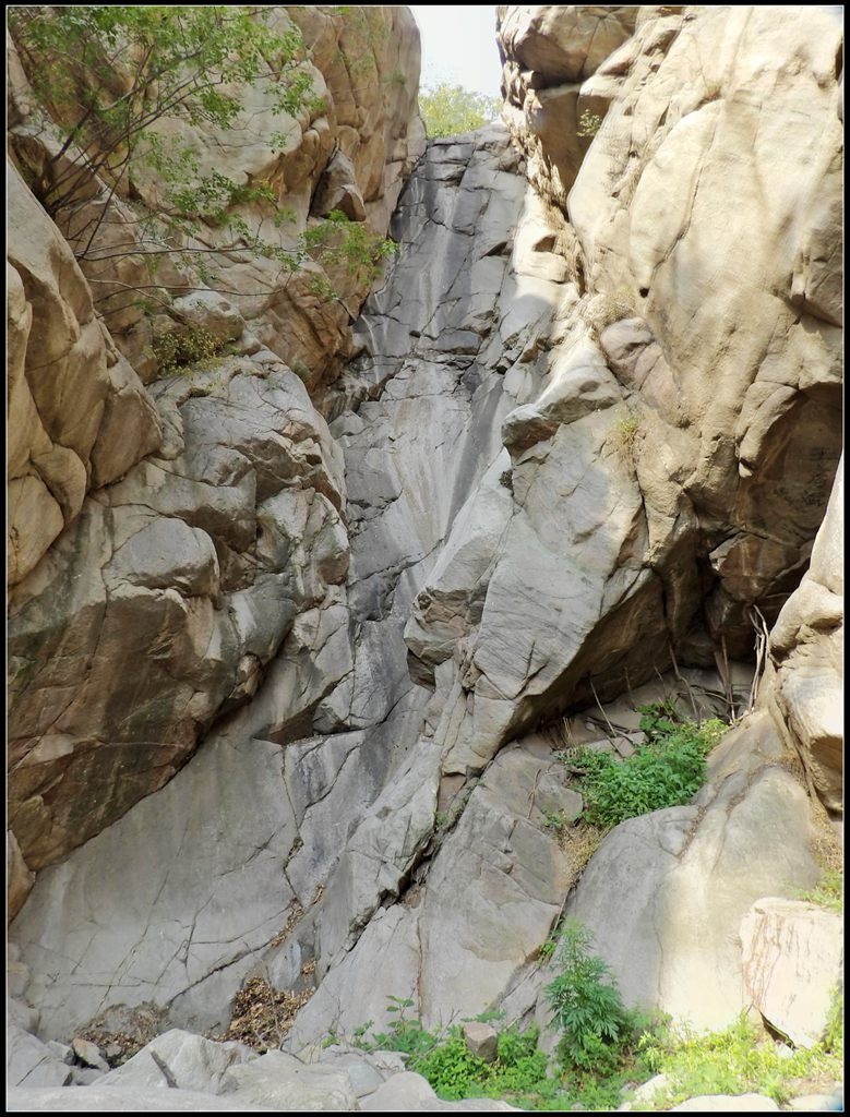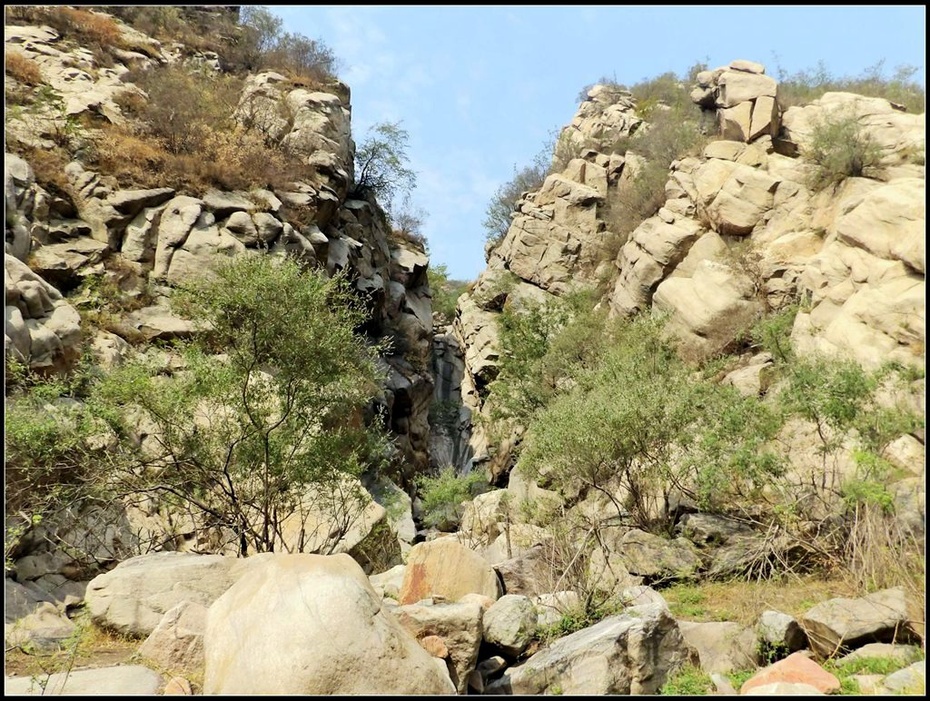 小瀑布右侧的崖壁上有一条险路,一条有惊无险的小路,如果你胆子够大,你就可以沿这条路攀到瀑布上边,再沿沟登上五峰山。 我这次没走这条险路,我选择了走右手的沟。那条沟里的路有一段我没有走过。 小瀑布一侧的崖壁,你能看出来路在哪儿么?