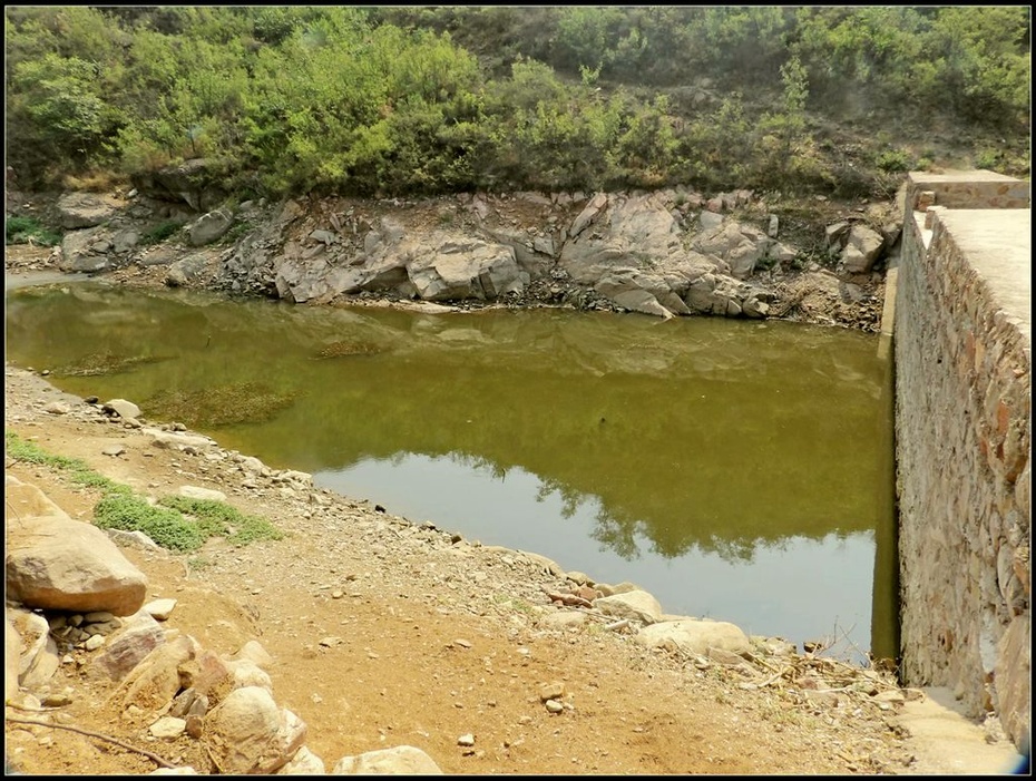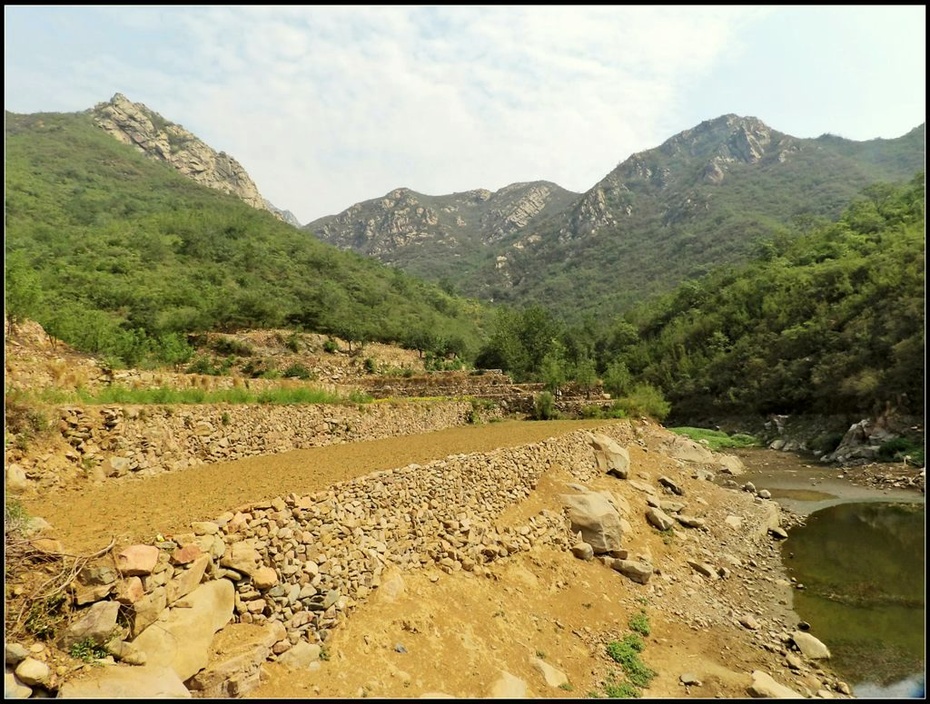 右手的沟走不远就是常河水库。我第一次见它时,它是一汪碧水,犹如绿宝石般的一汪碧水,让我们那些沿沟一路上行的人眼前突然一亮,差点亮瞎了双眼,在原本秃乎乎的沟里,突然出现这第一汪绿树掩映下的碧水,那景色真的让人有点陶醉。今天,我看到的只是一小片黄褐色的泥汤汤,这还是刚刚下了一场雨之后,如果没有那场雨,这个小水库还不干的底都朝了天?哎,天太旱了,如果你看过我的前两篇游记,你会注意到,我在前两篇游记中已几次说到这点了,山上的草旱的都发不了芽,根系浅的灌木旱的都快枯死了,水库里焉能有水?只是这样一来,藏在心底的美好记忆被眼前的现实完全击碎了。