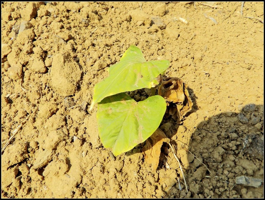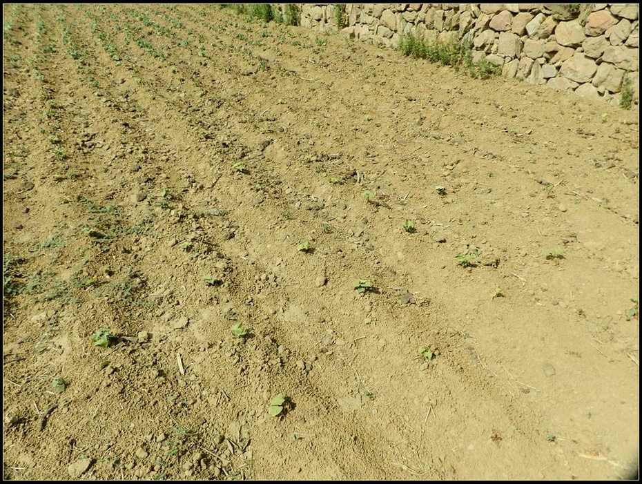 水库大坝下有个羊圈,在这儿,我意外的见到了放羊人,他“上班"可够自由的,都这会了还没把羊赶出圈呢,城里的上班族哪有这种待遇呀。双方搭讪起来,说到他的羊,放羊人自豪的说:“100只?116只呢”。那声音,颇有几分自豪感。看的出,老乡对自己的"工作"还是很知足的。呵呵,知足常乐,有良好的心态,生活怎能不幸福。你幸福么? 站在小水库的大坝上向上游看 地里的豆苗,由于干旱,小苗没精打彩的,呈出一付病态的黄