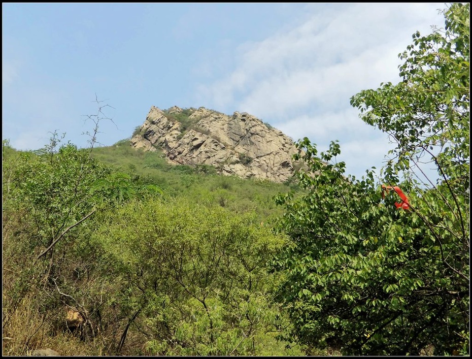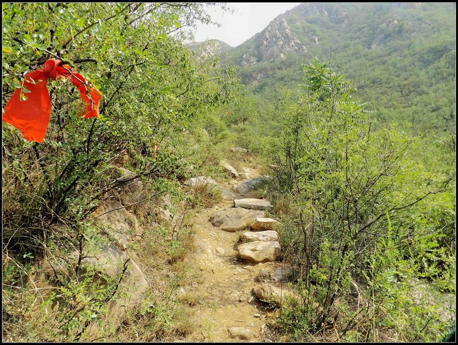 由水库开始,路变成了的的道道的小路,几年没走这段路了,现在那路比我们第一次走时成熟多了。不仅路线更清晰,沿路还有无数的路标,火红的路标在绿树的衬托下是那样的鲜艳,那样的醒目。对于这种路标,我是又恨又爱,爱这些路标的原因就不用说了。恨它们的原因是:有了路标,好多不具备驴友素质的游人就可以轻而易举的循着路标来到原本很少有人来,原本很清静的山野里,如果他们只是来寻找并享受美,我们应该高兴,应该鼓励才是,问题是大量游人的到来,结果不仅仅是留下了脚印,往往还会留下或多或少的垃圾。从而破坏了大自然的美。久而久之,驴友成了环境的破坏者。这让人如何能不愤恨,不伤悲。