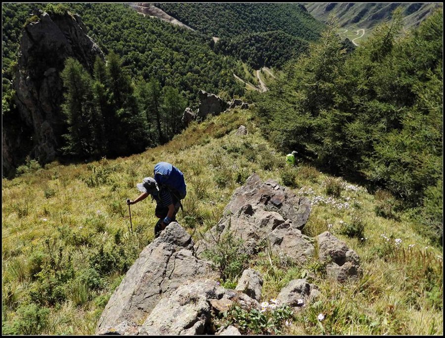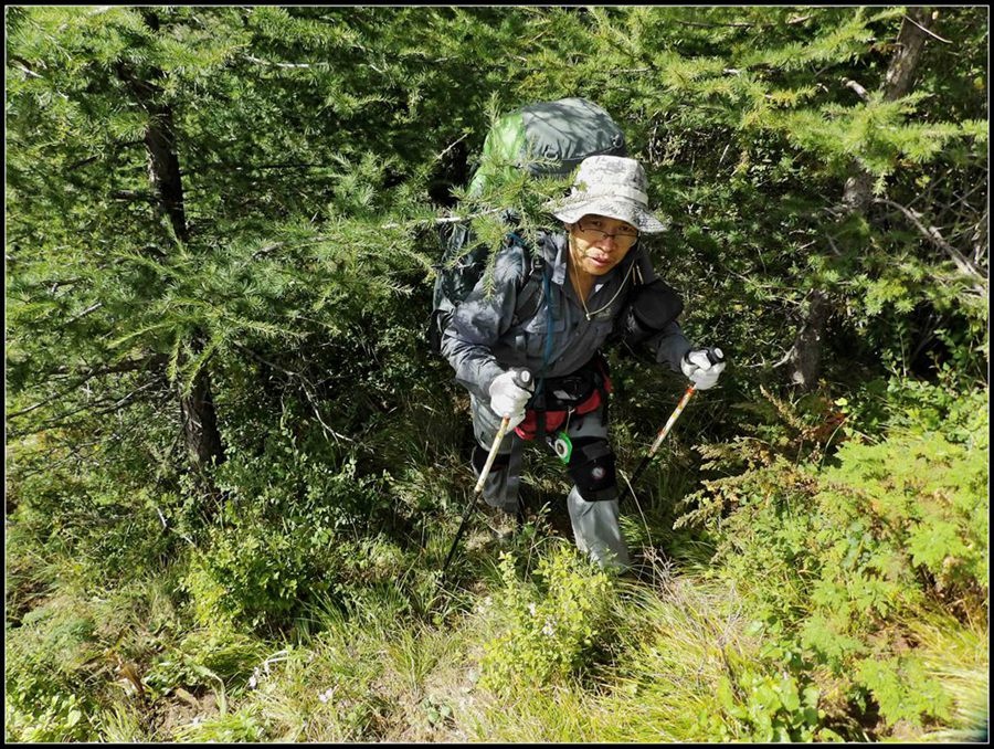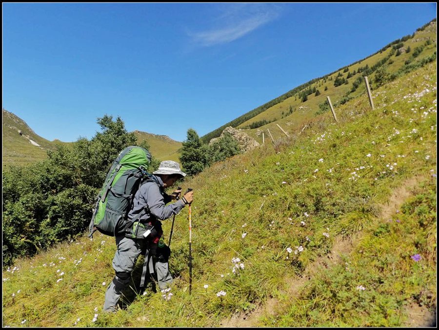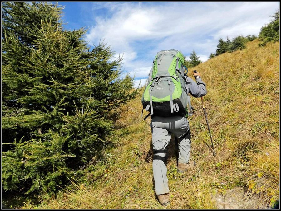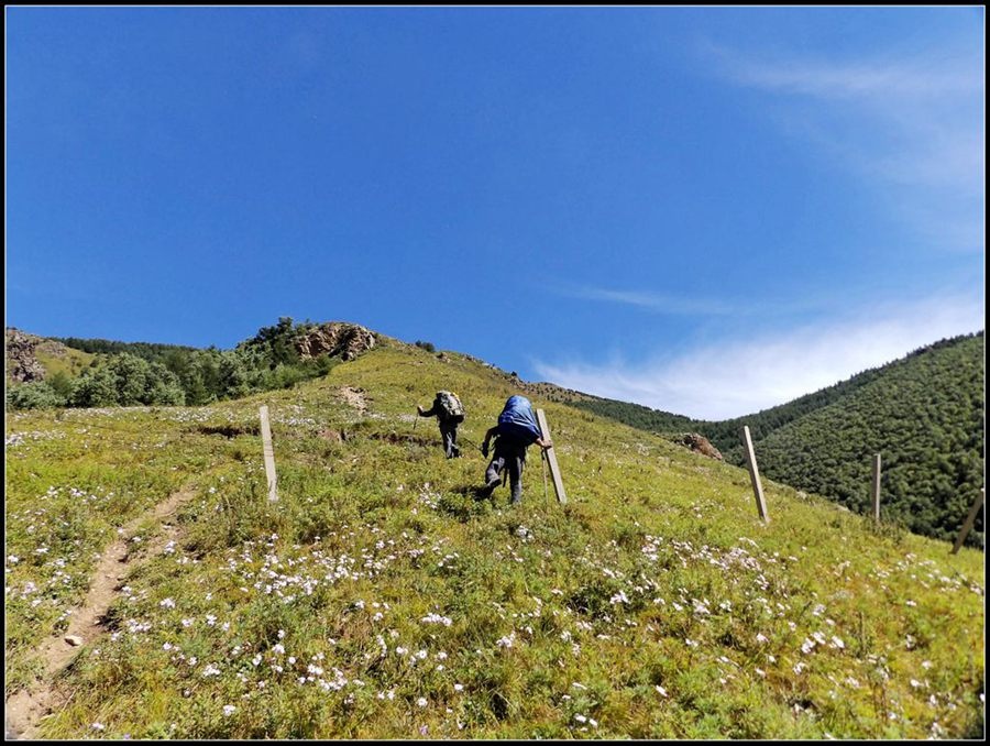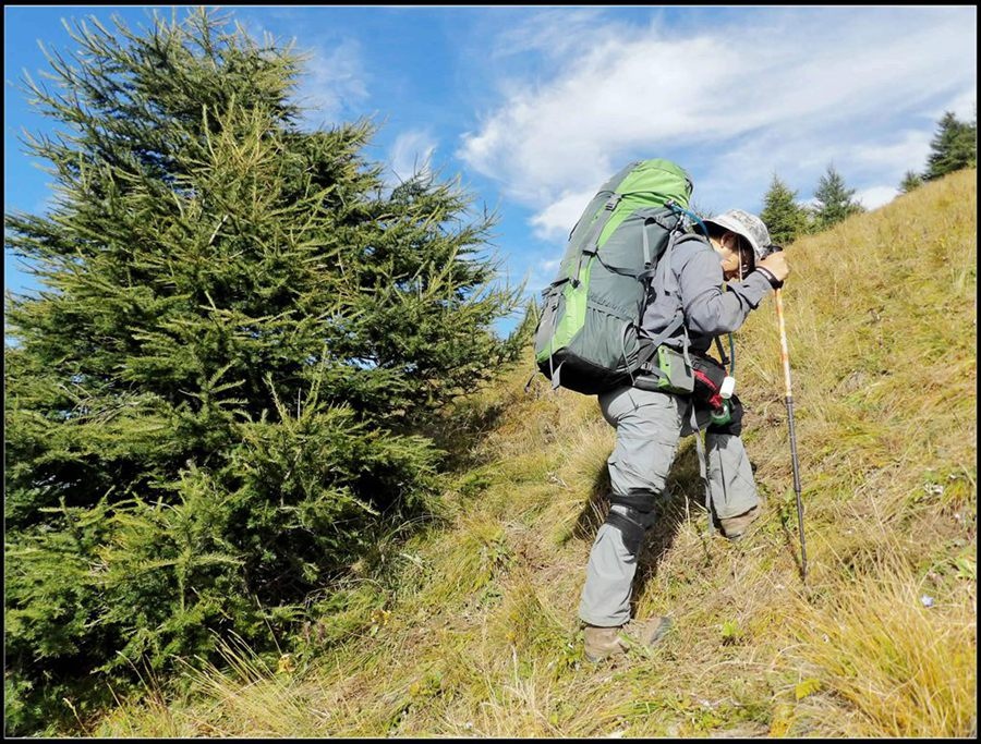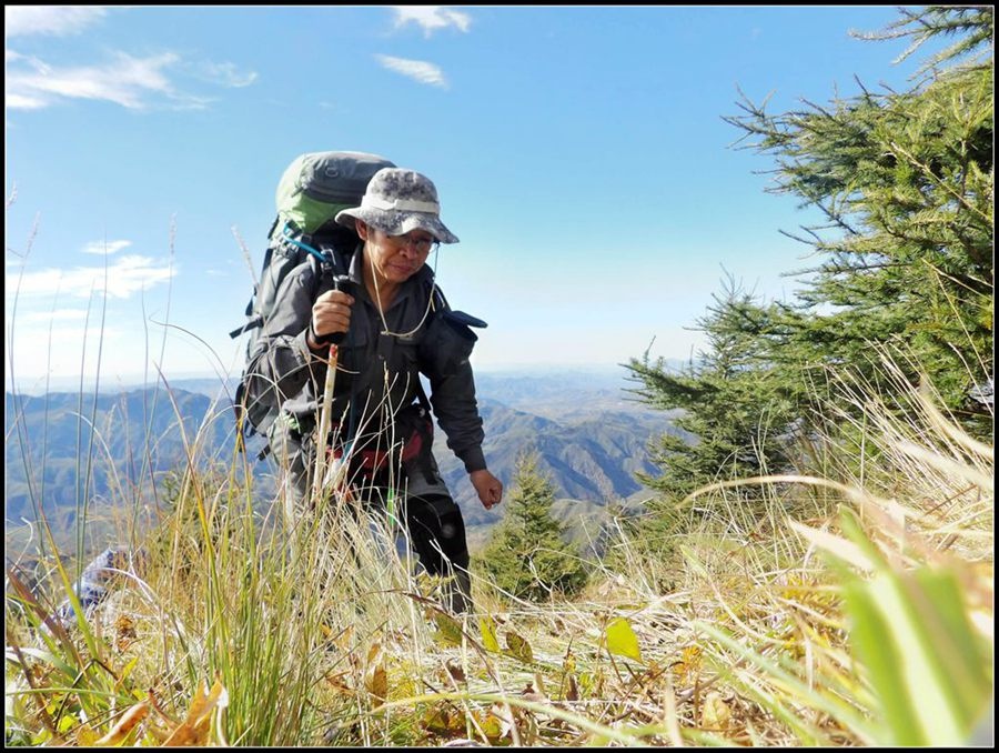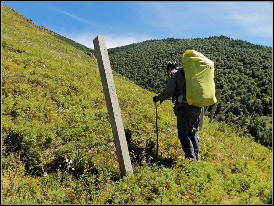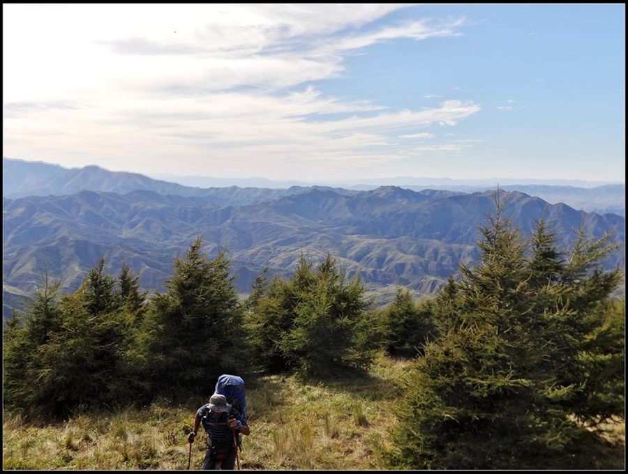 午餐之后,我们又上路了,目标——灵山之颠;路线——沿这条山脊一直向上走。应该说,这才是我们今天真正的任务,才是今天的重头戏,相比下边我们要走的路,今天上午的几个小时只是一场毛毛雨哈。 午餐点再向上是一道防护网,那网虽然形同虚设,根本拦不住人,但它却提醒我们:你进入保护区了,一定要注意防火安全,还要注意保护环境, 只有这样,你才对的起驴友的称呼,你才对的起这座山。 1 上升途中回看对面山脊上的山口和之字形的公路 民谣称:百花山,高入天,它在灵山的半中间,西灵山高过天,它在灵山头顶间。灵山之高大由此可见一斑。灵山,山体高大,山形秀美,地势复杂,树高林密,,连当地的放着人放羊一般也只上到半山,很少登顶。而北京 驴友登灵山多走大木场或孔涧,很少走我们这条路,这样一来,这条路更有一些神秘感了,现在的山坡上路很明显,但一会儿还会有路么,小路显不显,岔路多不多,我们会不会因走错路而耽误时间,能不能顺利的登顶?这些都是悬念。 果然,饶过一个陡崖后,路渐渐的变小了,逐渐小的难以分辨了。老慢远远的走在前边,他喊了一声:“没路了”,转身向上攀去,很快消失山坡上的乱石间。 走在前边的老慢 我感觉我们又走错路了,真正的路应该在山脊上,于是没走老慢走的那条“路",而是沿着断断续续的路径直接向山脊上攀去。后边几个人也都跟了过来。 沿陡坡向山脊攀升的队友 穿过最后一片荆棘,我们登上了山脊。山脊上有茂密的松林,林子中果然有一条路,只是那路要不时的猫下腰来钻,我们背着大包并不好走。不过只要有路心里就有底儿,我们沿着它向上走去。 林子外的风景 客观的说,山脊上的路并不太陡,也不太荒,更不险,与我们前两天走过的路相比好走多了,只是钻林子时要屡屡的低头,现在的关健,走到今天,走到现在我们的体力都不足了,体力才是最大的问题,尤其是不锈钢和葫芦岛,他俩一直拉在最后边,两人象一对好基友,又象相临为伴多少年的老临居,象村里的大爷大妈,一边走,一边叨叨咕咕的说个不停,天南海北,海阔天空。至于说了些啥我是不知道,因为我离他俩一直有几十米远。 我们所走的山脊是林子的边缘,走过一片林子是一片草地,走不了几步又是一片林子,路就这样在密林与草地中交错前进。时间一分一秒的消失了,然而,没有穷尽的林子一直遮档着我们的视线,灵山的顶在哪儿一直看不见。尽管如此,我们还是相信走一步就会近一步,只要你不停的走下去,迟早会登顶的。就是不知老天爷给我们留下那么多的时间没有。 老慢早就不见了踪影,从他翻上山脊前我们最后一次看见他,在这之后就再也没看到过他的影子,这可不行,一会儿见了面得说说他,一支队伍,要保持紧凑的队形,不能只是自己往前边跑,万一要是有个灰太狼或者美女蛇把你收走了,你在哪里儿丢的我们都 不知道,你LP要是朝我们要人可怎么办? 老鬼的体力不错,他一直和我不离左右,本来我俩能走的再稍微快一点,但因为要不时的等不锈钢他们,我们无法走的更快。 饶过一座石峰后视线赫然开朗,我们看见了久违的灵山,看样子至少一个小时之内我们还是登不了顶。看着一分一秒流失的时间,看着似乎永远也走不到的灵山,我真着急:如果登顶太晚,今天下不了山,明天的行程就全打乱了。因为后天大多数人都要上班,凌晨之前我们必须赶回家。今天要是下不了山,明天就没有时间再往东灵走,我们就只能在孔涧结束活动。那么一来,孔涧到东灵山一段路就甩下了,就无法和我以前走过的下观威-九山-沿河城、黄草梁-爨底的线路连起来,以后再抽时间走那一段路,又有点不值。不走,我走太行的活动中就缺了一环, 就是一个遗憾。可我着急归着急, 又一点办法也没有,我们已是强弩之末,个个心有余而力不足,想加快步伐也快不了,根本做不到。 远处,白云蓝天下的灵山 身后不时停下来休息的不锈钢和葫芦岛 回看身后,小五台清楚的出现在我们的视线中,我们就是从那个方向一步一步走过来的,想一想,那么远的距离,那么多道山脊。我们一路走过来,真的不容易。现在看,这条路线比想象的要难,强度也不亚于五台连穿。加上我们第一天走错了路,现在的强度甚至要大于五台连穿。一想到这,我又为我的队友们自豪,辛苦了,兄弟们。你们是好样的。 透过树尖远眺小五台,能分辨出来的有北、东台、三岔,还有有小五第六台之称的牛见草山 把相机放在地上,自拍的一张照片 走上连续的大草坡了,身边的松树稀稀拉拉的散落着已经不成片。根据从远处观察到的情况,我们离顶不远了,让老鬼给我拍了两张照片,我加速向上冲去。这次出行我可过足了臭美的瘾,几天中拍的照片比过去几年都多,都是测评惹的“惹的祸”。 山顶上盘旋的鹰 4点整,午餐之后大约两个半小时,我登上了灵山的次峰——西灵的山顶,这个速度比我估计的略快。按这个时间推算,如果从村里一路走上来,登顶大约需要将近5小时, 现在,让我们感受一下一览众山小的气势 前边说过,灵山共有三个尖,主峰叫石城,石城西北的另一尖被称为西灵,石城西南也有一个更低一些的尖,有人称之为南灵。登灵山,一般是登西灵和石城两个尖。我们现在登上的就是西灵,山顶的标志是两个玛尼堆,历史上西灵顶上曾有一小庙,如今庙宇全毁,只剩了残砖碎石,被人垒成了两个玛尼堆。 从正面看西灵顶上的玛尼堆 比我早了足