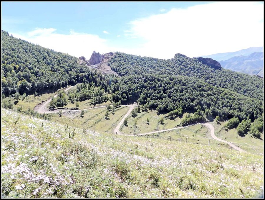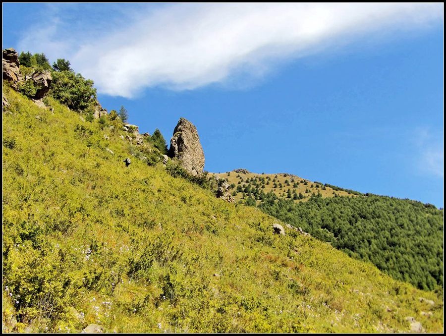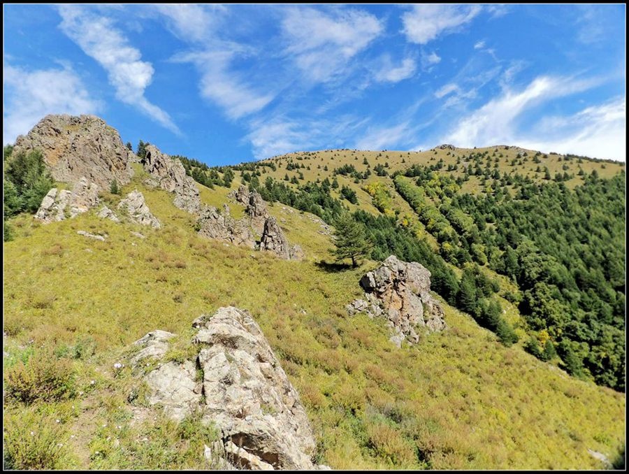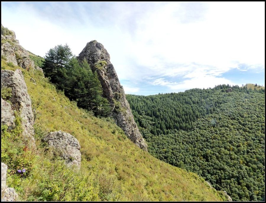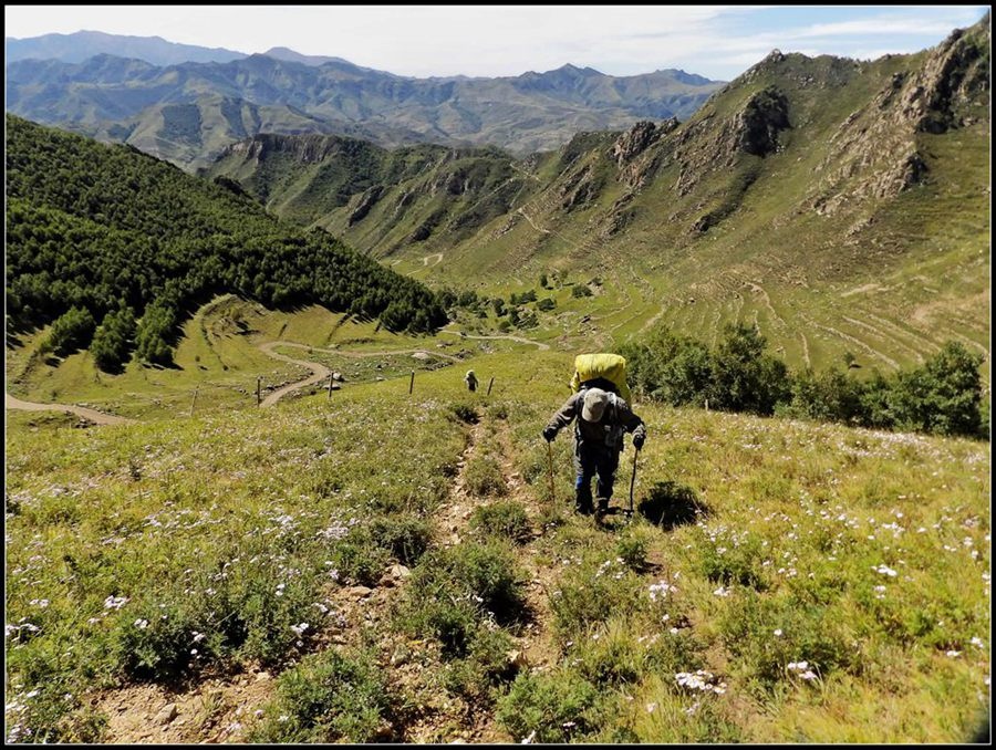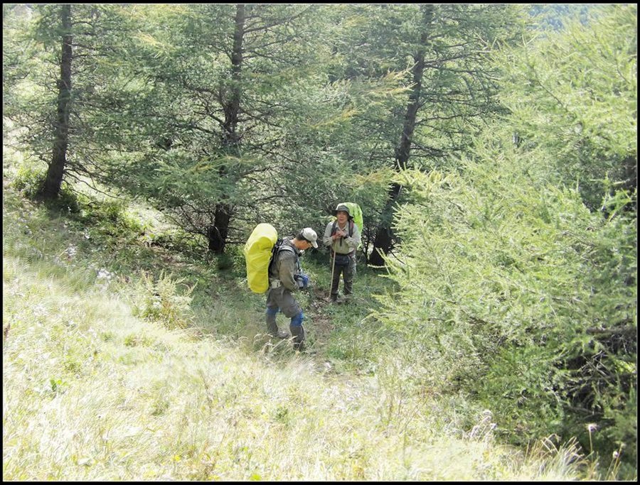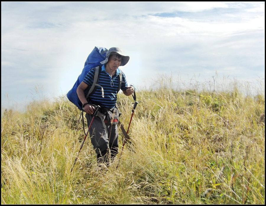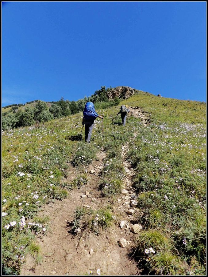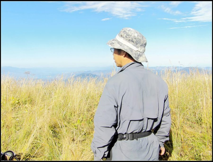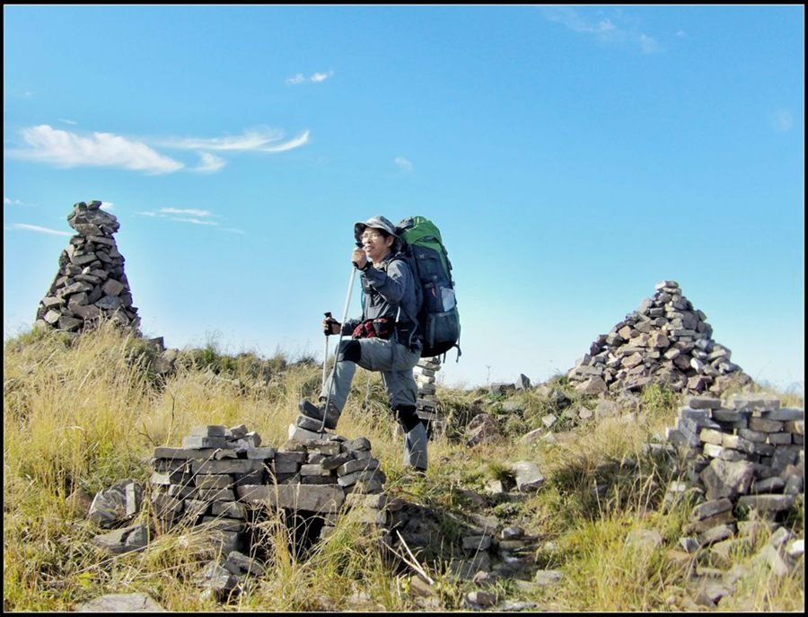 午餐之后,我们又上路了,目标——灵山之颠;路线——沿这条山脊一直向上走。应该说,这才是我们今天真正的任务,才是今天的重头戏,相比下边我们要走的路,今天上午的几个小时只是一场毛毛雨哈。 午餐点再向上是一道防护网,那网虽然形同虚设,根本拦不住人,但它却提醒我们:你进入保护区了,一定要注意防火安全,还要注意保护环境, 只有这样,你才对的起驴友的称呼,你才对的起这座山。 1 上升途中回看对面山脊上的山口和之字形的公路 民谣称:百花山,高入天,它在灵山的半中间,西灵山高过天,它在灵山头顶间。灵山之高大由此可见一斑。灵山,山体高大,山形秀美,地势复杂,树高林密,,连当地的放着人放羊一般也只上到半山,很少登顶。而北京 驴友登灵山多走大木场或孔涧,很少走我们这条路,这样一来,这条路更有一些神秘感了,现在的山坡上路很明显,但一会儿还会有路么,小路显不显,岔路多不多,我们会不会因走错路而耽误时间,能不能顺利的登顶?这些都是悬念。 果然,饶过一个陡崖后,路渐渐的变小了,逐渐小的难以分辨了。老慢远远的走在前边,他喊了一声:“没路了”,转身向上攀去,很快消失山坡上的乱石间。 走在前边的老慢 我感觉我们又走错路了,真正的路应该在山脊上,于是没走老慢走的那条“路",而是沿着断断续续的路径直接向山脊上攀去。后边几个人也都跟了过来。 沿陡坡向山脊攀升的队友 穿过最后一片荆棘,我们登上了山脊。山脊上有茂密的松林,林子中果然有一条路,只是那路要不时的猫下腰来钻,我们背着大包并不好走。不过只要有路心里就有底儿,我们沿着它向上走去。 林子外的风景 客观的说,山脊上的路并不太陡,也不太荒,更不险,与我们前两天走过的路相比好走多了,只是钻林子时要屡屡的低头,现在的关健,走到今天,走到现在我们的体力都不足了,体力才是最大的问题,尤其是不锈钢和葫芦岛,他俩一直拉在最后边,两人象一对好基友,又象相临为伴多少年的老临居,象村里的大爷大妈,一边走,一边叨叨咕咕的说个不停,天南海北,海阔天空。至于说了些啥我是不知道,因为我离他俩一直有几十米远。 我们所走的山脊是林子的边缘,走过一片林子是一片草地,走不了几步又是一片林子,路就这样在密林与草地中交错前进。时间一分一秒的消失了,然而,没有穷尽的林子一直遮档着我们的视线,灵山的顶在哪儿一直看不见。尽管如此,我们还是相信走一步就会近一步,只要你不停的走下去,迟早会登顶的。就是不知老天爷给我们留下那么多的时间没有。 老慢早就不见了踪影,从他翻上山脊前我们最后一次看见他,在这之后就再也没看到过他的影子,这可不行,一会儿见了面得说说他,一支队伍,要保持紧凑的队形,不能只是自己往前边跑,万一要是有个灰太狼或者美女蛇把你收走了,你在哪里儿丢的我们都 不知道,你LP要是朝我们要人可怎么办? 老鬼的体力不错,他一直和我不离左右,本来我俩能走的再稍微快一点,但因为要不时的等不锈钢他们,我们无法走的更快。 饶过一座石峰后视线赫然开朗,我们看见了久违的灵山,看样子至少一个小时之内我们还是登不了顶。看着一分一秒流失的时间,看着似乎永远也走不到的灵山,我真着急:如果登顶太晚,今天下不了山,明天的行程就全打乱了。因为后天大多数人都要上班,凌晨之前我们必须赶回家。今天要是下不了山,明天就没有时间再往东灵走,我们就只能在孔涧结束活动。那么一来,孔涧到东灵山一段路就甩下了,就无法和我以前走过的下观威-九山-沿河城、黄草梁-爨底的线路连起来,以后再抽时间走那一段路,又有点不值。不走,我走太行的活动中就缺了一环, 就是一个遗憾。可我着急归着急, 又一点办法也没有,我们已是强弩之末,个个心有余而力不足,想加快步伐也快不了,根本做不到。 远处,白云蓝天下的灵山 身后不时停下来休息的不锈钢和葫芦岛 回看身后,小五台清楚的出现在我们的视线中,我们就是从那个方向一步一步走过来的,想一想,那么远的距离,那么多道山脊。我们一路走过来,真的不容易。现在看,这条路线比想象的要难,强度也不亚于五台连穿。加上我们第一天走错了路,现在的强度甚至要大于五台连穿。一想到这,我又为我的队友们自豪,辛苦了,兄弟们。你们是好样的。 透过树尖远眺小五台,能分辨出来的有北、东台、三岔,还有有小五第六台之称的牛见草山 把相机放在地上,自拍的一张照片 走上连续的大草坡了,身边的松树稀稀拉拉的散落着已经不成片。根据从远处观察到的情况,我们离顶不远了,让老鬼给我拍了两张照片,我加速向上冲去。这次出行我可过足了臭美的瘾,几天中拍的照片比过去几年都多,都是测评惹的“惹的祸”。 山顶上盘旋的鹰 4点整,午餐之后大约两个半小时,我登上了灵山的次峰——西灵的山顶,这个速度比我估计的略快。按这个时间推算,如果从村里一路走上来,登顶大约需要将近5小时, 现在,让我们感受一下一览众山小的气势 前边说过,灵山共有三个尖,主峰叫石城,石城西北的另一尖被称为西灵,石城西南也有一个更低一些的尖,有人称之为南灵。登灵山,一般是登西灵和石城两个尖。我们现在登上的就是西灵,山顶的标志是两个玛尼堆,历史上西灵顶上曾有一小庙,如今庙宇全毁,只剩了残砖碎石,被人垒成了两个玛尼堆。 从正面看西灵顶上的玛尼堆 比我早了足