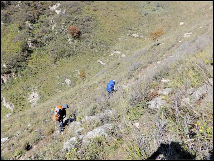 正如在山口看到的,山口对面的山头并不高,但山势陡峭,就连山西一侧的坡也越来越陡,十分难得的有了险恶之感。这一带经常有老乡放羊,山坡上横路较多,但每条路都很小,小的连一只脚都放不平,路沿着陡坡向前延伸,我们沿不同的高度前进,抓机会,我居高临下拍下了队友行进中的镜头。