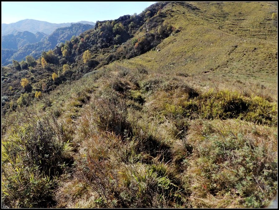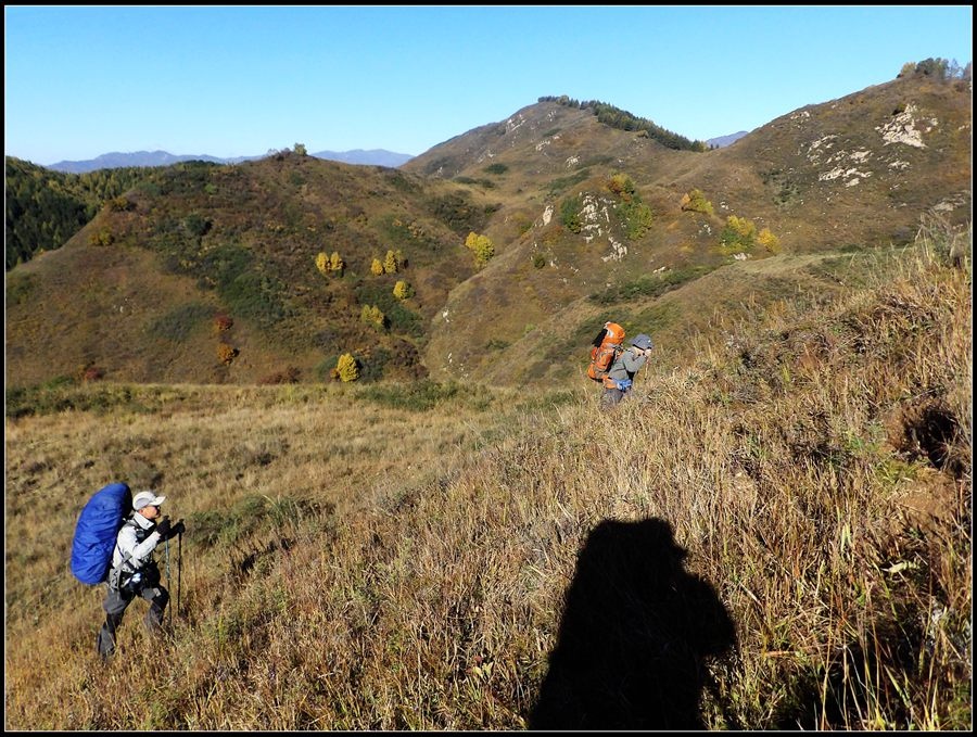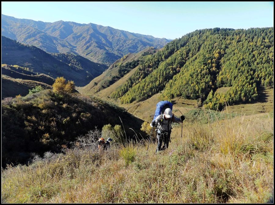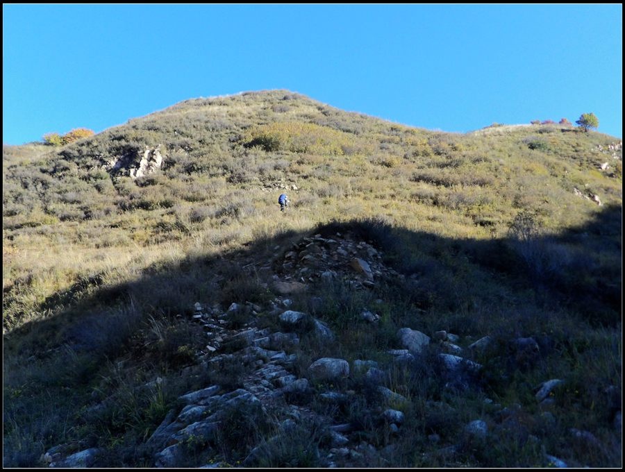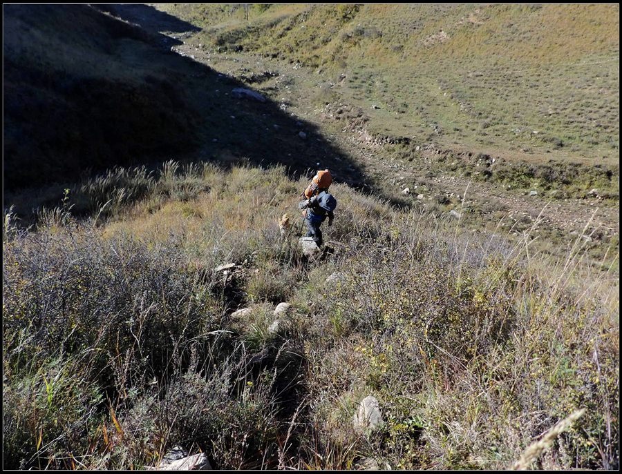 翻上一个小山脊前面是一大片沙棘林,这一带的山上沙棘很多,这两天我们已经饱受其苦了,现在这看沙棘更是密的吓人,我们只能绕行。路时断时续,明明脚下没路,但走着走着又有了路,可你高兴劲还没下去,路又没了。因为这些所谓的路全是羊或牛走出来的,现在没人放羊或牛了,路也就逐渐消失了。其实,即便有路我们也不能完全按路走,羊或牛吃草时多是在山坡上横切,它们并不一定上山脊。我们的目标可是主山脊,好在这一带的山坡度不算陡,有路没路都没有关系,我们只须挑着坡度缓的地方往上走就是了。
