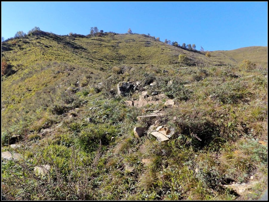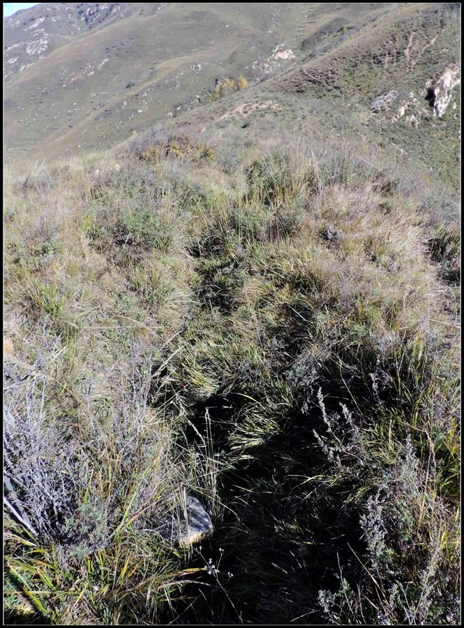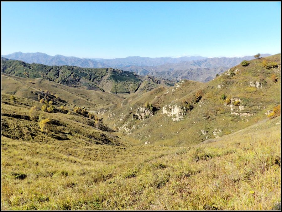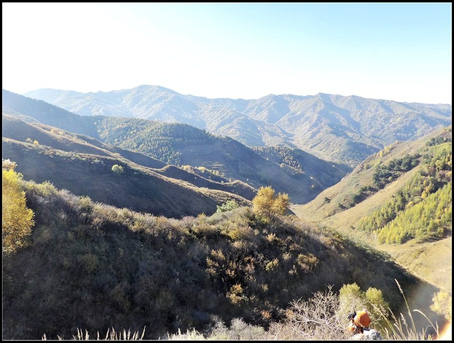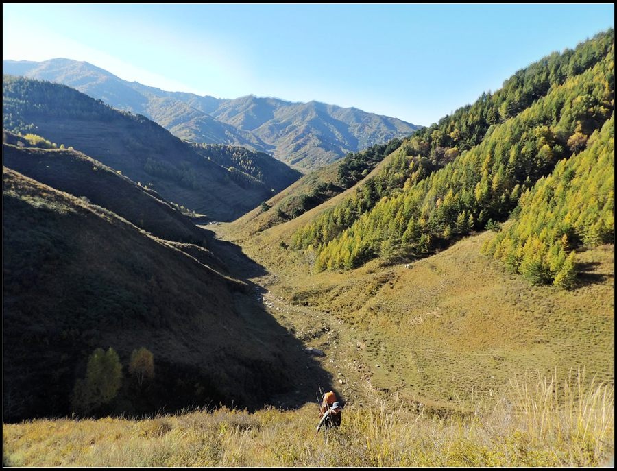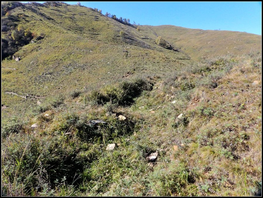 翻上一个小山脊前面是一大片沙棘林,这一带的山上沙棘很多,这两天我们已经饱受其苦了,现在这看沙棘更是密的吓人,我们只能绕行。路时断时续,明明脚下没路,但走着走着又有了路,可你高兴劲还没下去,路又没了。因为这些所谓的路全是羊或牛走出来的,现在没人放羊或牛了,路也就逐渐消失了。其实,即便有路我们也不能完全按路走,羊或牛吃草时多是在山坡上横切,它们并不一定上山脊。我们的目标可是主山脊,好在这一带的山坡度不算陡,有路没路都没有关系,我们只须挑着坡度缓的地方往上走就是了。