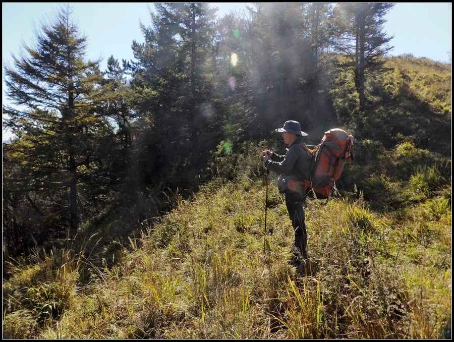 沿着昨天侦察好的路,我们向上攀去。路还算明显,只是起步的坡度很大,我笑称:起步就是一个下马威。
