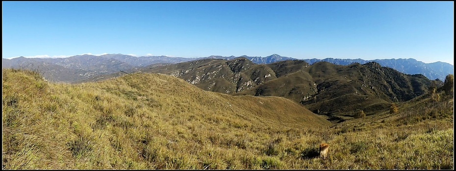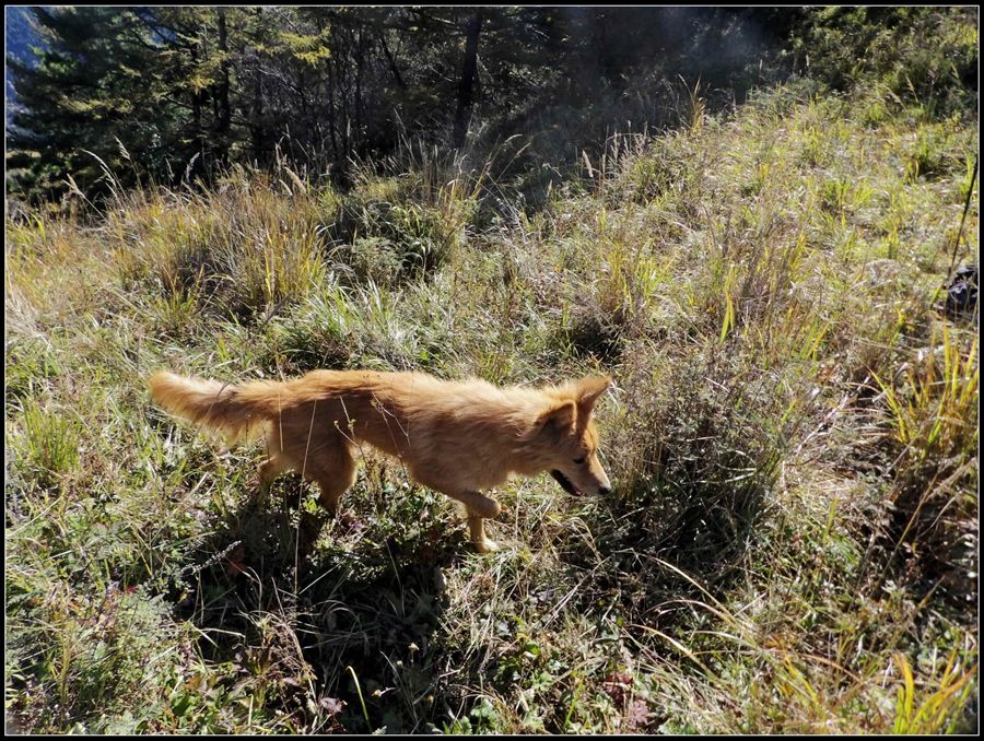 大黄围着我们跑来跑去,我第一次专门为它拍了一张。我前边说过,此行我带了三块刚刚充过电的电池 ,结果一块连开机都开不了。另一块在昨天上午,在我们离开辽道背、登上山脊不久就没电了,剩下的时间里我只有一块电池了,所以要省着用。这两天我照的照片很少,比平时少多了,为大黄单独拍照的仅此一张。555。