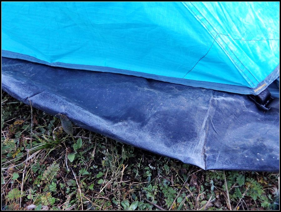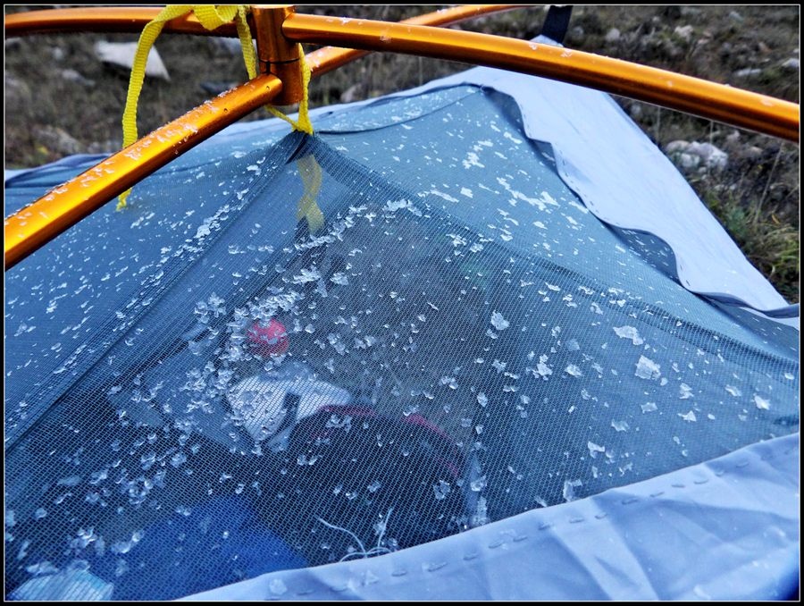 后半夜感到了丝丝寒意,收紧睡袋的帽口继续睡,再醒来又是6点多。起“床”,钻出帐篷发现外帐和地布上都是霜,外帐内侧的凝水更是结成了无数小冰块,气温已经到零下了。