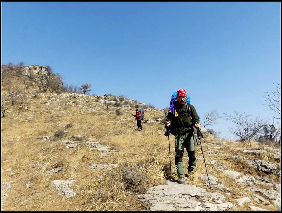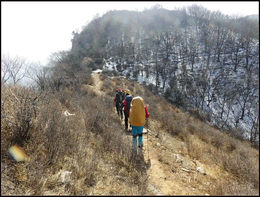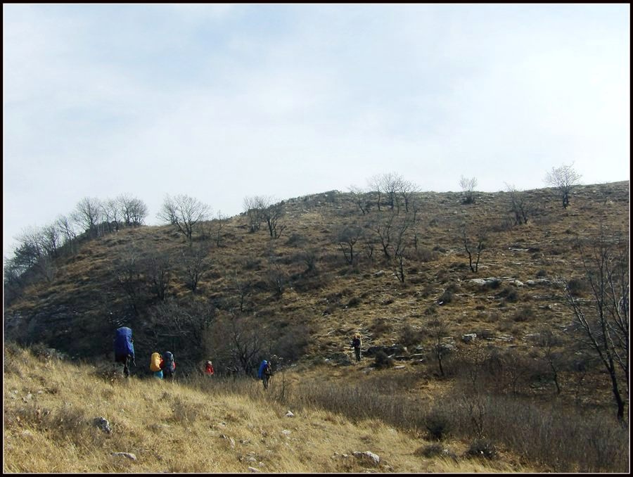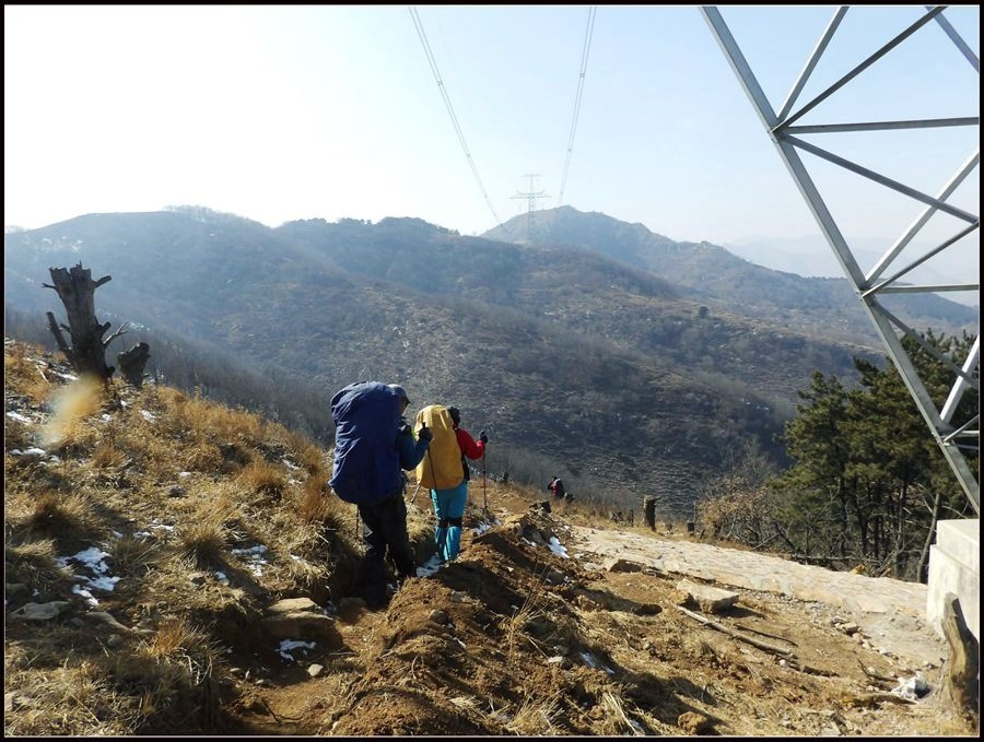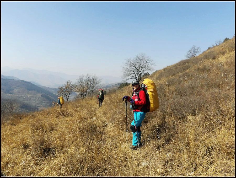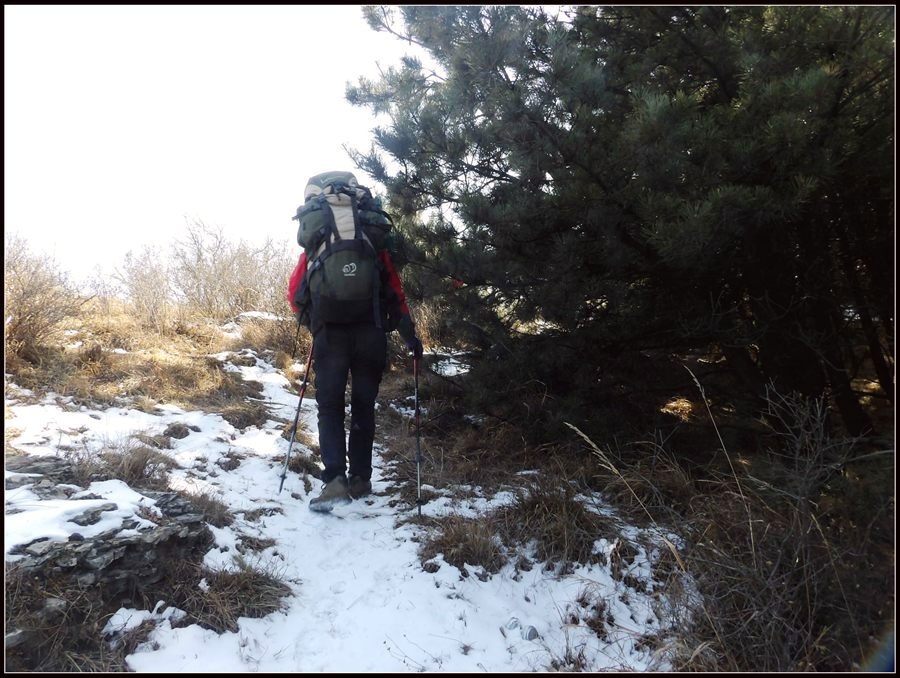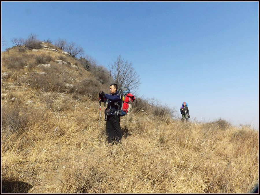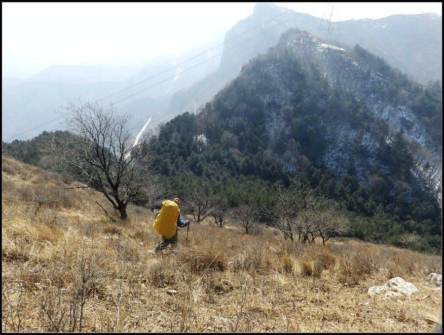 送走乐行,我们准备继续上路,前边是一个不小的爬升。刚刚走了几步,有人提议吃午餐。“吃饭?这才几点就吃饭”?“几点?都12点多了”。我一看表,可不是12点多了,今天上午过的真快,我还以为刚10点多呢。“那就开饭,把食物装到肚子里,不背在身上了”。于是,刚刚背上的包又卸了下来。 前边又是一不小的爬升 午餐进行中 刚刚吃了午餐后,不等大家喘口气儿,我就催着大伙上路了。从邢台驴友的游记中知道,大雨门到上龙门(即小董坪)的穿越,一路都是走山脊,一共要翻15个山头。现在半天时间过去了,我们只翻了一个座大山,好象是3个山头,也就是说,如果单纯看山头数量的话,我们刚走了1/5的路,后边任重而道远。听我这么一说,大家也着急了,老王讲话:“那还真得抓紧点时间”。如果天黑我们走不到小董坪,我们就得在山上扎营。山上扎营最大的问题是水,现在我们每个人平均只有1L的水,这点水路上喝可以,扎营肯定是不行的。 行走在林中小路上 一阵急升,我们又翻上了一座大山。顺着山坡上的小路,不长的时间就过了三个不高的小山头。路开始了长距离的下降。老王开始得瑟了:“看来不用紧赶,路没你说的那么远,这不一眨眼的功夫已经过了三个山头了”。我一瓢水泼过去:“你知这三个小山头算一个山还是三个山?没准这三个小山头只算一个山头呢"。"你说的,地图精度能那么低呀”?“20米一个等高线,那仨山头没多高,真可能在等高线上反应不出来”。 走在长长的下降路上 路边的风景 俯视邢和公路 走在长长的下降 路上,远远的就能看到沟里的有条大路直通上来,通到山脊上的山口处。那个山口莫非是风门口?风门口是阎王边南侧的晋冀两省间的又一通道,是内长城上的又一个关口,据说关口处还有一个古碑。我不知风门口的准确位置,只知道大概就在这一带。因为从地图上看,这儿有座山叫风门岭。 走到山口跟前,却发现山口的那边根本没有路同,所谓的山口其实是一狭窄的石缝,比上午我们走过的那个石缝更窄、更险的一道石缝,几乎直上直下的一道石缝,别说是人,就是岛儿也无法飞跃。石峰处砌有水泥平台,地面残留有少量煤炭,石缝上还横着一根大木头,种种迹象表明,这儿是一个溜煤场,老乡把石缝改造成了天然的运煤滑梯,代替了漫长的盘山公路。这可是一个多快好省的运输方式。 垭口那边又是一个不小的爬升,我们开始了新的攀升,铺满松针的小路如同松软的地毯,走在上边让人心旷神移。 上升、侧切、下降,又上升、再侧切、又下降,始而复返。草地、松林,松林、草地,不停变幻。时间一长,我们已忘记了数自己究竟翻过了多少个山头。 翻过一个山头,我看到对面山头上的铁塔,那是个高压输电线塔。早在中午,早在东沟垭口,在我们和乐行分手时,我就远远的看到了的那个铁塔,当时乐行问我小董坪有多远,我指着远处的高压线塔说:“就在那那个铁塔那边”。其实我只是泛泛的一指,泛泛的一说,我并没有走过这条线,小董坪究竟在何处,距那个铁塔又有多远,我根本不就不清楚。我只是根据方位猜测,小董坪距那个线塔不太远。现在,我们终于走到那条高压线近前了,远处看到的那个铁塔就在前眼前的小山包上,可小董坪离我们还有多远呢?凭直觉,铁塔那边绝对不是小董坪,小董坪离我们还有不近的路程。 不管小董坪离我们还有多远,眼前的山都是要翻的,翻一座就少一座。一行人刚刚下了一座山,又马不停蹄的向另一座山攀去,向铁截塔所在的山上攀去。 俯视山下,我们能看到两条公路, 较低处,宽大而明亮的是近年新修的邢和公路,邢和公路上方还有一条颜色暗淡又窄小的公路,那条在山坡上拐了好几道之字弯的公路是旧邢和公路,现在已经废弃了。 渐行渐高,现在我们已来到了高压线的正下方,能清楚的听到高压线的电离现象产生的“霹霹叭叭”的声音,那声音让人头皮有些发麻。我开玩笑的对大家说:“千万别把登山杖向上举,小心被吸上去"。这一说让人心情更紧张了,两个女驴甚至连大气都不敢出了,她们屏气息声的向前走着,周围一下子寂静下来,耳边传来的是更清晰的电离声:“霹霹、叭叭”、“霹霹、叭叭”。 走在侧切路上 路边的风景 穿过一片树林 转过一个山又是一垭口,这个垭口地貌有点特殊:垭口的两边,方正的巨石象人工垒砌的城障一样。这是风门口么?邢台驴友说,风门口关口处有石碑,那个石碑是风门口的标志物。从阎王边过来,每到一个垭口我都以为是风门口,都要找寻一番石碑,可一次次后是一次次的失望。现在这个垭口,岩石形成了天然的石门,从地貌上说,是我们走过的垭口中,最符合门口特征的垭口。那么,它是不是风门口呢? 站在垭口四处环顾,视线中根本没有什么石碑。只见一条大道由沟里爬上来,过垭口,拐下了河北一侧。我不死心,顺路向垭口下边走去。除了正在查看GPS的飞熊外,其它驴友也跟着我向下边走去。 正在查看GPS的飞熊 跟着我走下垭口的队友 垭口下边,山路拐弯处有一个石屋,应该是个“庙",却没有我期盼的石碑 再向下行是一道残墙,这儿原来应该是一个城门,然而城墙内外仍不见石碑 又往下走了几米,仍不见有石碑,我死心了,莫非那个石碑被人盗走了?有可能,这两年文物贩子横行,常为一已私利盗窃文物。说不定那个石碑被这些鼠辈们偷走了呢。也有可能这儿根本不就不是风门口。既然如此,还是研究一下
