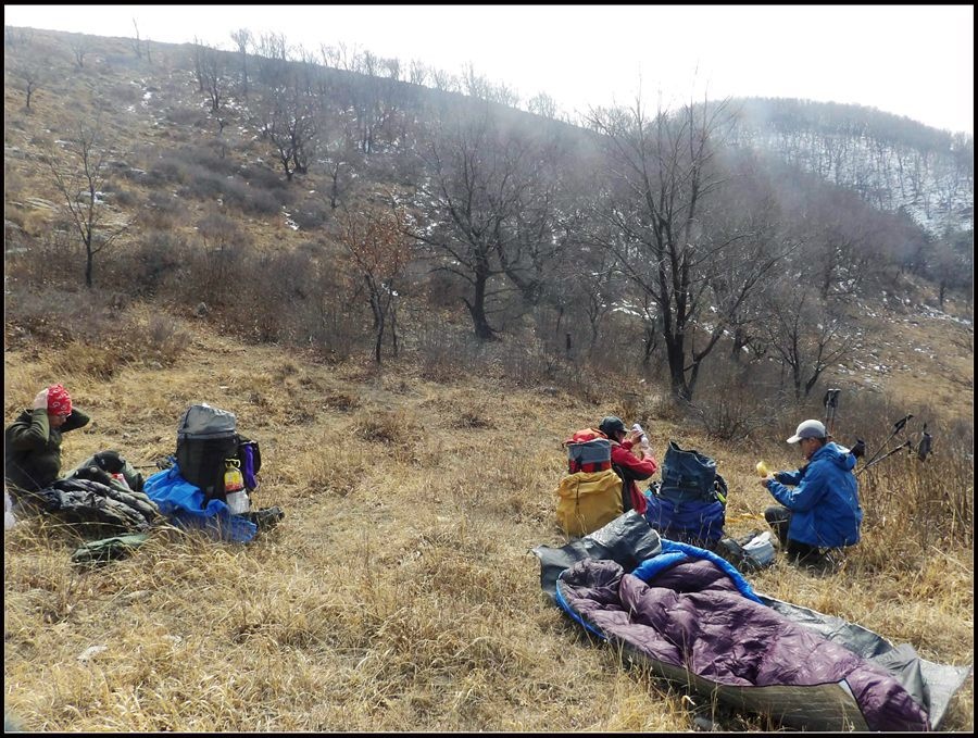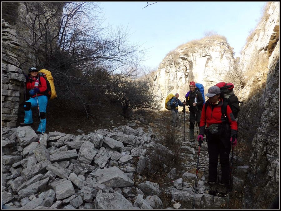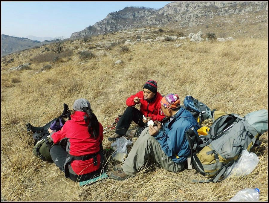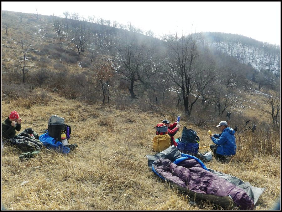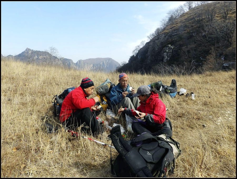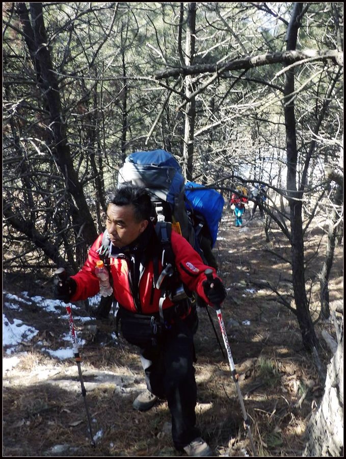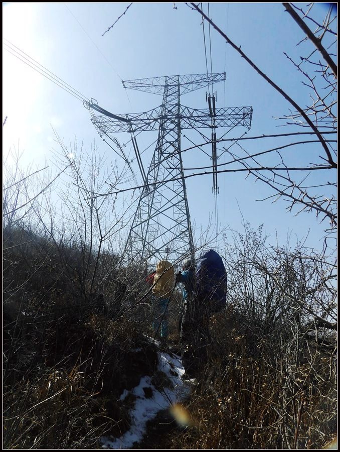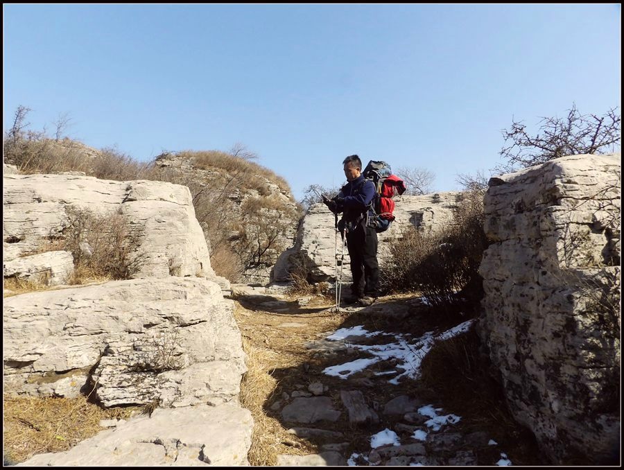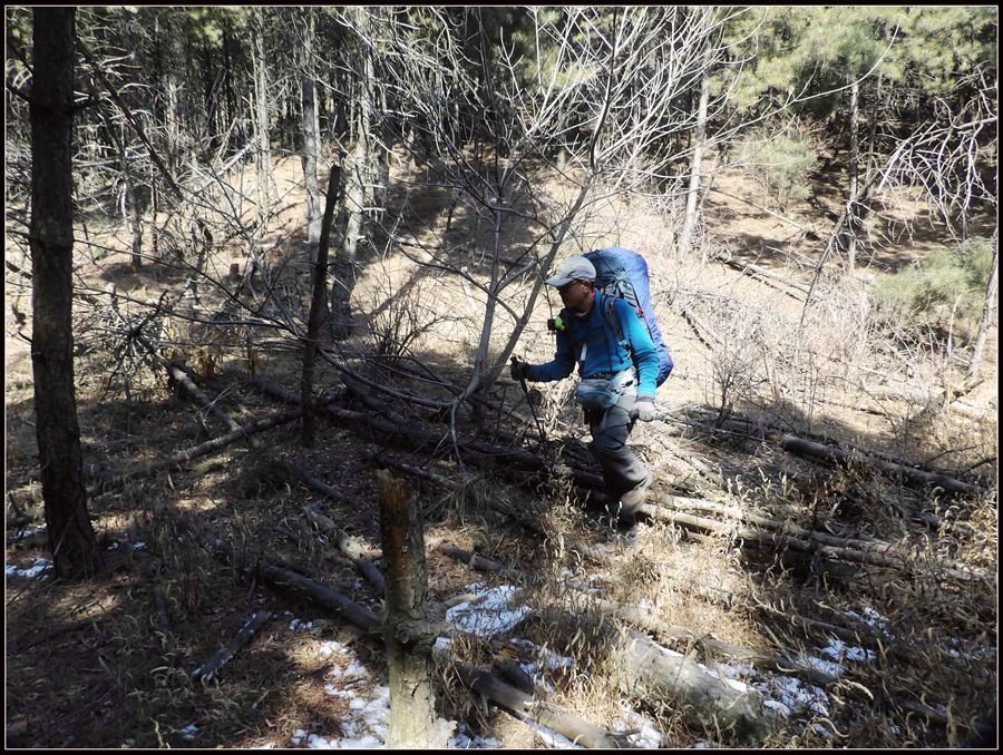 送走乐行,我们准备继续上路,前边是一个不小的爬升。刚刚走了几步,有人提议吃午餐。“吃饭?这才几点就吃饭”?“几点?都12点多了”。我一看表,可不是12点多了,今天上午过的真快,我还以为刚10点多呢。“那就开饭,把食物装到肚子里,不背在身上了”。于是,刚刚背上的包又卸了下来。 前边又是一不小的爬升 午餐进行中 刚刚吃了午餐后,不等大家喘口气儿,我就催着大伙上路了。从邢台驴友的游记中知道,大雨门到上龙门(即小董坪)的穿越,一路都是走山脊,一共要翻15个山头。现在半天时间过去了,我们只翻了一个座大山,好象是3个山头,也就是说,如果单纯看山头数量的话,我们刚走了1/5的路,后边任重而道远。听我这么一说,大家也着急了,老王讲话:“那还真得抓紧点时间”。如果天黑我们走不到小董坪,我们就得在山上扎营。山上扎营最大的问题是水,现在我们每个人平均只有1L的水,这点水路上喝可以,扎营肯定是不行的。 行走在林中小路上 一阵急升,我们又翻上了一座大山。顺着山坡上的小路,不长的时间就过了三个不高的小山头。路开始了长距离的下降。老王开始得瑟了:“看来不用紧赶,路没你说的那么远,这不一眨眼的功夫已经过了三个山头了”。我一瓢水泼过去:“你知这三个小山头算一个山还是三个山?没准这三个小山头只算一个山头呢"。"你说的,地图精度能那么低呀”?“20米一个等高线,那仨山头没多高,真可能在等高线上反应不出来”。 走在长长的下降路上 路边的风景 俯视邢和公路 走在长长的下降 路上,远远的就能看到沟里的有条大路直通上来,通到山脊上的山口处。那个山口莫非是风门口?风门口是阎王边南侧的晋冀两省间的又一通道,是内长城上的又一个关口,据说关口处还有一个古碑。我不知风门口的准确位置,只知道大概就在这一带。因为从地图上看,这儿有座山叫风门岭。 走到山口跟前,却发现山口的那边根本没有路同,所谓的山口其实是一狭窄的石缝,比上午我们走过的那个石缝更窄、更险的一道石缝,几乎直上直下的一道石缝,别说是人,就是岛儿也无法飞跃。石峰处砌有水泥平台,地面残留有少量煤炭,石缝上还横着一根大木头,种种迹象表明,这儿是一个溜煤场,老乡把石缝改造成了天然的运煤滑梯,代替了漫长的盘山公路。这可是一个多快好省的运输方式。 垭口那边又是一个不小的爬升,我们开始了新的攀升,铺满松针的小路如同松软的地毯,走在上边让人心旷神移。 上升、侧切、下降,又上升、再侧切、又下降,始而复返。草地、松林,松林、草地,不停变幻。时间一长,我们已忘记了数自己究竟翻过了多少个山头。 翻过一个山头,我看到对面山头上的铁塔,那是个高压输电线塔。早在中午,早在东沟垭口,在我们和乐行分手时,我就远远的看到了的那个铁塔,当时乐行问我小董坪有多远,我指着远处的高压线塔说:“就在那那个铁塔那边”。其实我只是泛泛的一指,泛泛的一说,我并没有走过这条线,小董坪究竟在何处,距那个铁塔又有多远,我根本不就不清楚。我只是根据方位猜测,小董坪距那个线塔不太远。现在,我们终于走到那条高压线近前了,远处看到的那个铁塔就在前眼前的小山包上,可小董坪离我们还有多远呢?凭直觉,铁塔那边绝对不是小董坪,小董坪离我们还有不近的路程。 不管小董坪离我们还有多远,眼前的山都是要翻的,翻一座就少一座。一行人刚刚下了一座山,又马不停蹄的向另一座山攀去,向铁截塔所在的山上攀去。 俯视山下,我们能看到两条公路, 较低处,宽大而明亮的是近年新修的邢和公路,邢和公路上方还有一条颜色暗淡又窄小的公路,那条在山坡上拐了好几道之字弯的公路是旧邢和公路,现在已经废弃了。 渐行渐高,现在我们已来到了高压线的正下方,能清楚的听到高压线的电离现象产生的“霹霹叭叭”的声音,那声音让人头皮有些发麻。我开玩笑的对大家说:“千万别把登山杖向上举,小心被吸上去"。这一说让人心情更紧张了,两个女驴甚至连大气都不敢出了,她们屏气息声的向前走着,周围一下子寂静下来,耳边传来的是更清晰的电离声:“霹霹、叭叭”、“霹霹、叭叭”。 走在侧切路上 路边的风景 穿过一片树林 转过一个山又是一垭口,这个垭口地貌有点特殊:垭口的两边,方正的巨石象人工垒砌的城障一样。这是风门口么?邢台驴友说,风门口关口处有石碑,那个石碑是风门口的标志物。从阎王边过来,每到一个垭口我都以为是风门口,都要找寻一番石碑,可一次次后是一次次的失望。现在这个垭口,岩石形成了天然的石门,从地貌上说,是我们走过的垭口中,最符合门口特征的垭口。那么,它是不是风门口呢? 站在垭口四处环顾,视线中根本没有什么石碑。只见一条大道由沟里爬上来,过垭口,拐下了河北一侧。我不死心,顺路向垭口下边走去。除了正在查看GPS的飞熊外,其它驴友也跟着我向下边走去。 正在查看GPS的飞熊 跟着我走下垭口的队友 垭口下边,山路拐弯处有一个石屋,应该是个“庙",却没有我期盼的石碑 再向下行是一道残墙,这儿原来应该是一个城门,然而城墙内外仍不见石碑 又往下走了几米,仍不见有石碑,我死心了,莫非那个石碑被人盗走了?有可能,这两年文物贩子横行,常为一已私利盗窃文物。说不定那个石碑被这些鼠辈们偷走了呢。也有可能这儿根本不就不是风门口。既然如此,还是研究一下
