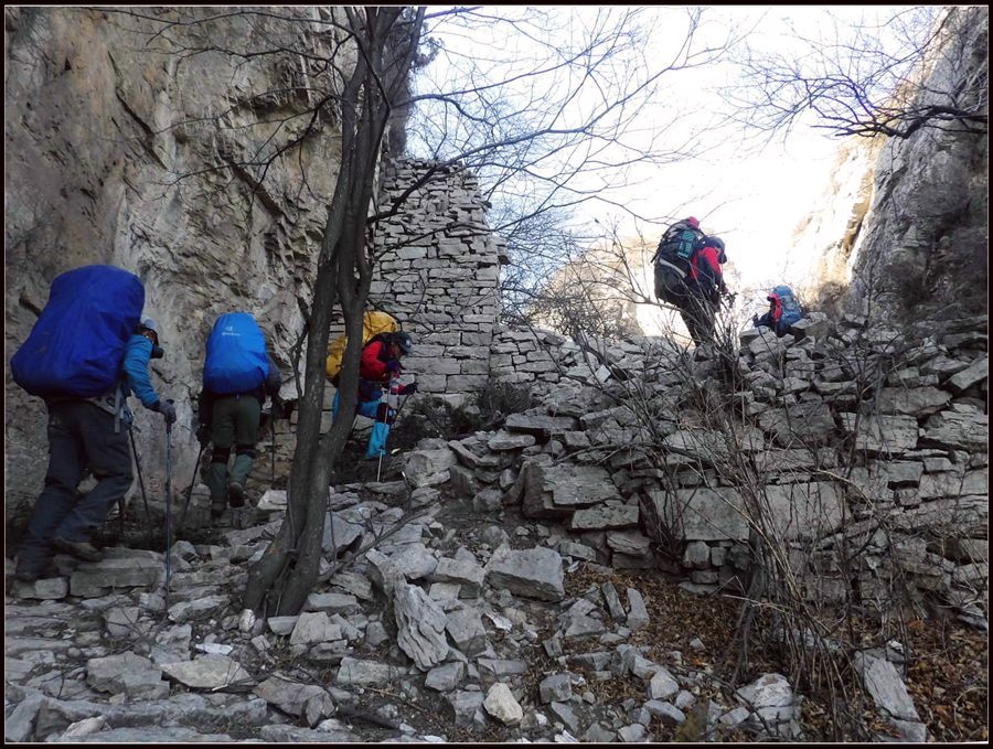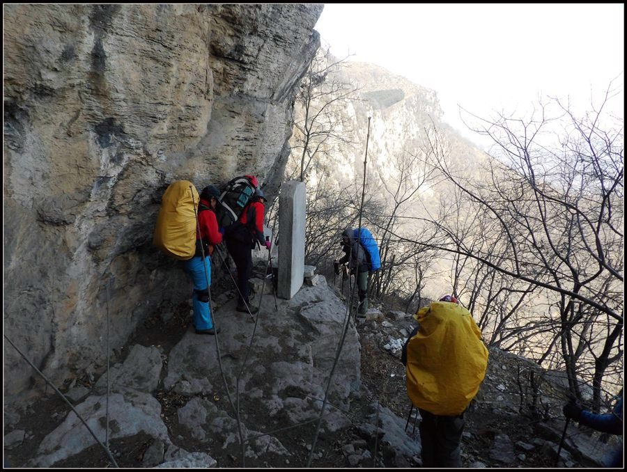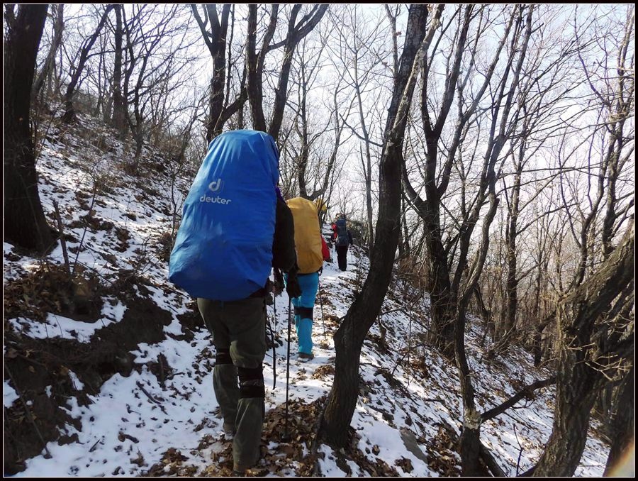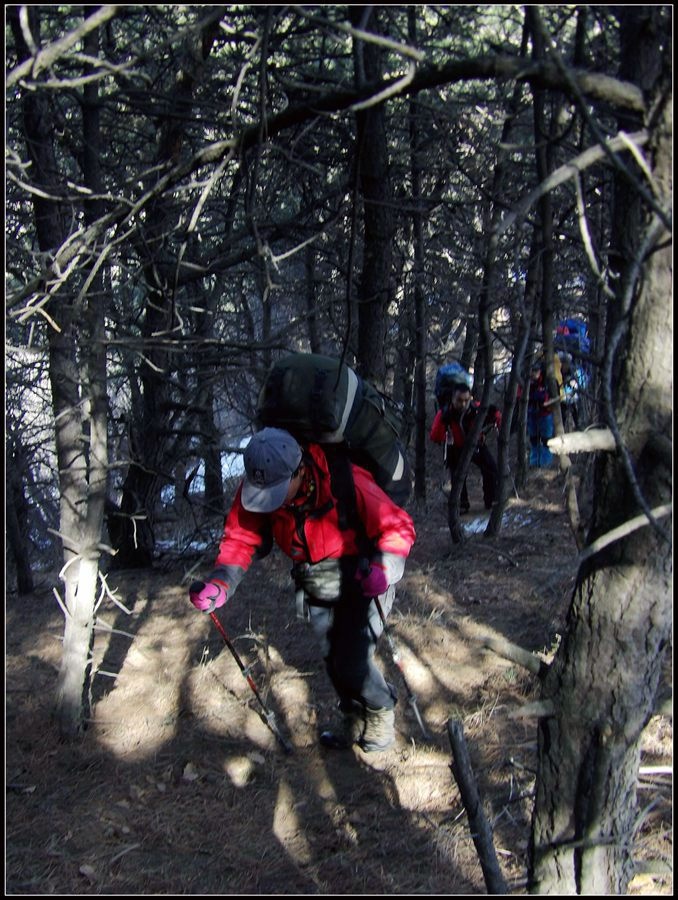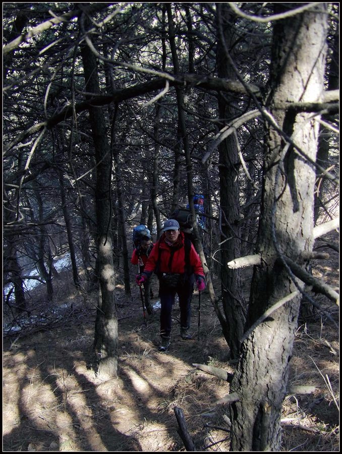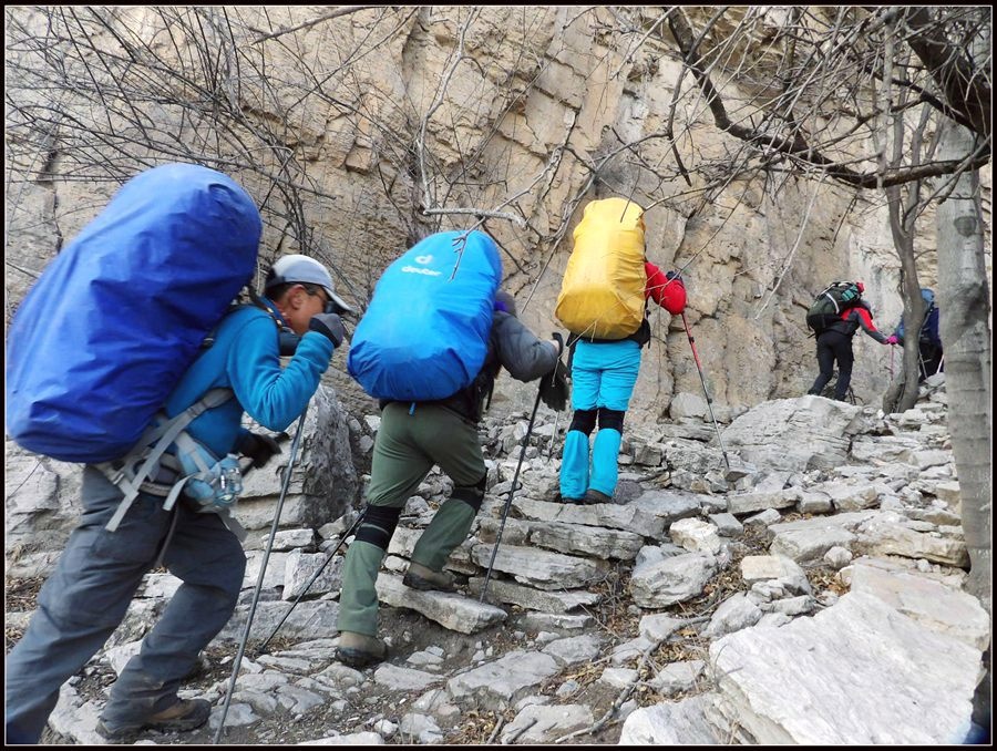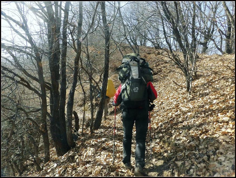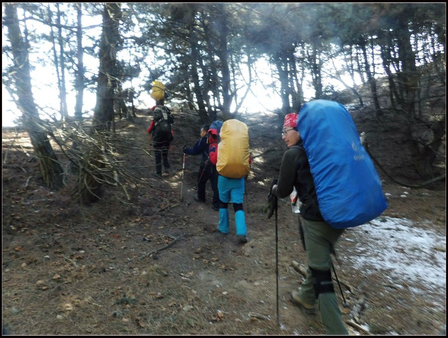 送走乐行,我们准备继续上路,前边是一个不小的爬升。刚刚走了几步,有人提议吃午餐。“吃饭?这才几点就吃饭”?“几点?都12点多了”。我一看表,可不是12点多了,今天上午过的真快,我还以为刚10点多呢。“那就开饭,把食物装到肚子里,不背在身上了”。于是,刚刚背上的包又卸了下来。 前边又是一不小的爬升 午餐进行中 刚刚吃了午餐后,不等大家喘口气儿,我就催着大伙上路了。从邢台驴友的游记中知道,大雨门到上龙门(即小董坪)的穿越,一路都是走山脊,一共要翻15个山头。现在半天时间过去了,我们只翻了一个座大山,好象是3个山头,也就是说,如果单纯看山头数量的话,我们刚走了1/5的路,后边任重而道远。听我这么一说,大家也着急了,老王讲话:“那还真得抓紧点时间”。如果天黑我们走不到小董坪,我们就得在山上扎营。山上扎营最大的问题是水,现在我们每个人平均只有1L的水,这点水路上喝可以,扎营肯定是不行的。 行走在林中小路上 一阵急升,我们又翻上了一座大山。顺着山坡上的小路,不长的时间就过了三个不高的小山头。路开始了长距离的下降。老王开始得瑟了:“看来不用紧赶,路没你说的那么远,这不一眨眼的功夫已经过了三个山头了”。我一瓢水泼过去:“你知这三个小山头算一个山还是三个山?没准这三个小山头只算一个山头呢"。"你说的,地图精度能那么低呀”?“20米一个等高线,那仨山头没多高,真可能在等高线上反应不出来”。 走在长长的下降路上 路边的风景 俯视邢和公路 走在长长的下降 路上,远远的就能看到沟里的有条大路直通上来,通到山脊上的山口处。那个山口莫非是风门口?风门口是阎王边南侧的晋冀两省间的又一通道,是内长城上的又一个关口,据说关口处还有一个古碑。我不知风门口的准确位置,只知道大概就在这一带。因为从地图上看,这儿有座山叫风门岭。 走到山口跟前,却发现山口的那边根本没有路同,所谓的山口其实是一狭窄的石缝,比上午我们走过的那个石缝更窄、更险的一道石缝,几乎直上直下的一道石缝,别说是人,就是岛儿也无法飞跃。石峰处砌有水泥平台,地面残留有少量煤炭,石缝上还横着一根大木头,种种迹象表明,这儿是一个溜煤场,老乡把石缝改造成了天然的运煤滑梯,代替了漫长的盘山公路。这可是一个多快好省的运输方式。 垭口那边又是一个不小的爬升,我们开始了新的攀升,铺满松针的小路如同松软的地毯,走在上边让人心旷神移。 上升、侧切、下降,又上升、再侧切、又下降,始而复返。草地、松林,松林、草地,不停变幻。时间一长,我们已忘记了数自己究竟翻过了多少个山头。 翻过一个山头,我看到对面山头上的铁塔,那是个高压输电线塔。早在中午,早在东沟垭口,在我们和乐行分手时,我就远远的看到了的那个铁塔,当时乐行问我小董坪有多远,我指着远处的高压线塔说:“就在那那个铁塔那边”。其实我只是泛泛的一指,泛泛的一说,我并没有走过这条线,小董坪究竟在何处,距那个铁塔又有多远,我根本不就不清楚。我只是根据方位猜测,小董坪距那个线塔不太远。现在,我们终于走到那条高压线近前了,远处看到的那个铁塔就在前眼前的小山包上,可小董坪离我们还有多远呢?凭直觉,铁塔那边绝对不是小董坪,小董坪离我们还有不近的路程。 不管小董坪离我们还有多远,眼前的山都是要翻的,翻一座就少一座。一行人刚刚下了一座山,又马不停蹄的向另一座山攀去,向铁截塔所在的山上攀去。 俯视山下,我们能看到两条公路, 较低处,宽大而明亮的是近年新修的邢和公路,邢和公路上方还有一条颜色暗淡又窄小的公路,那条在山坡上拐了好几道之字弯的公路是旧邢和公路,现在已经废弃了。 渐行渐高,现在我们已来到了高压线的正下方,能清楚的听到高压线的电离现象产生的“霹霹叭叭”的声音,那声音让人头皮有些发麻。我开玩笑的对大家说:“千万别把登山杖向上举,小心被吸上去"。这一说让人心情更紧张了,两个女驴甚至连大气都不敢出了,她们屏气息声的向前走着,周围一下子寂静下来,耳边传来的是更清晰的电离声:“霹霹、叭叭”、“霹霹、叭叭”。 走在侧切路上 路边的风景 穿过一片树林 转过一个山又是一垭口,这个垭口地貌有点特殊:垭口的两边,方正的巨石象人工垒砌的城障一样。这是风门口么?邢台驴友说,风门口关口处有石碑,那个石碑是风门口的标志物。从阎王边过来,每到一个垭口我都以为是风门口,都要找寻一番石碑,可一次次后是一次次的失望。现在这个垭口,岩石形成了天然的石门,从地貌上说,是我们走过的垭口中,最符合门口特征的垭口。那么,它是不是风门口呢? 站在垭口四处环顾,视线中根本没有什么石碑。只见一条大道由沟里爬上来,过垭口,拐下了河北一侧。我不死心,顺路向垭口下边走去。除了正在查看GPS的飞熊外,其它驴友也跟着我向下边走去。 正在查看GPS的飞熊 跟着我走下垭口的队友 垭口下边,山路拐弯处有一个石屋,应该是个“庙",却没有我期盼的石碑 再向下行是一道残墙,这儿原来应该是一个城门,然而城墙内外仍不见石碑 又往下走了几米,仍不见有石碑,我死心了,莫非那个石碑被人盗走了?有可能,这两年文物贩子横行,常为一已私利盗窃文物。说不定那个石碑被这些鼠辈们偷走了呢。也有可能这儿根本不就不是风门口。既然如此,还是研究一下
