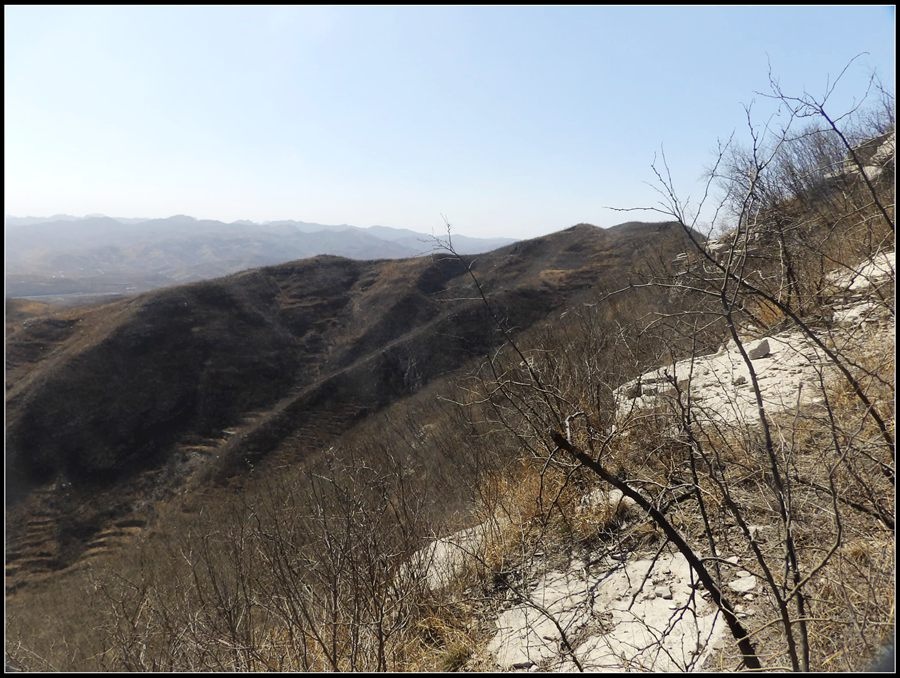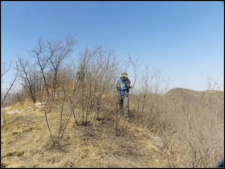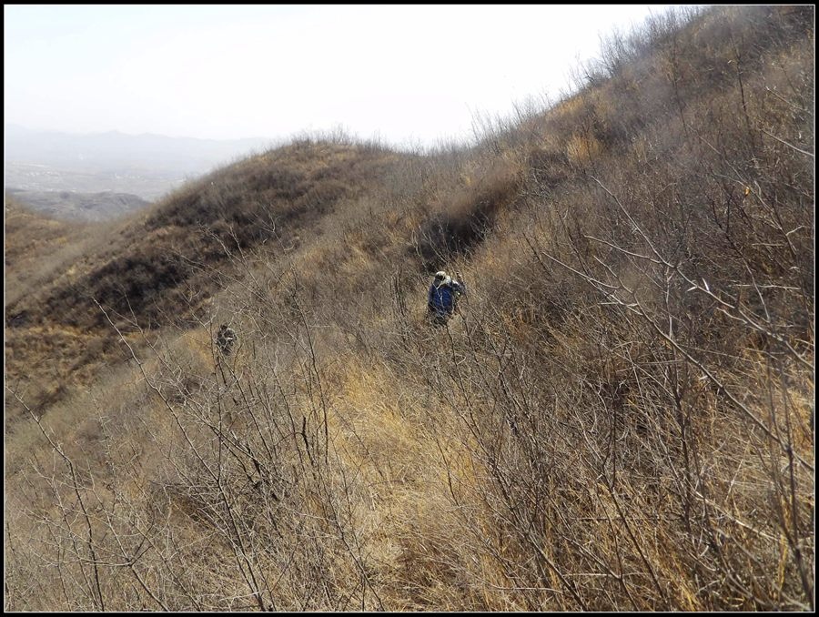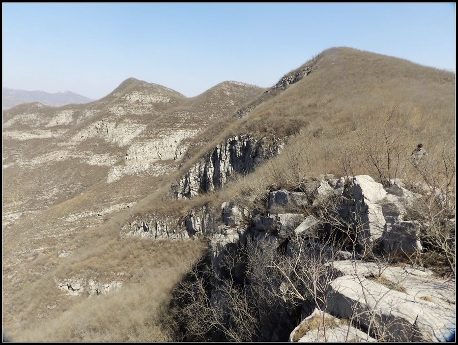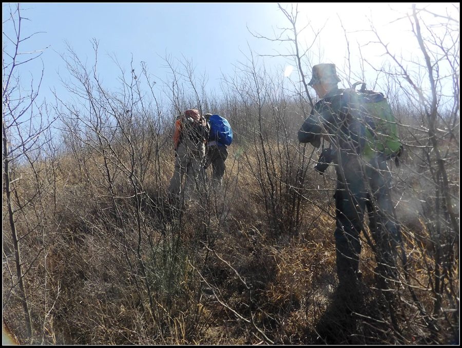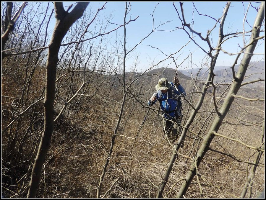 山脊低矮处,我们正想插到山脊上去,悠然却下来和我们汇合了,他说山脊上也尽是灌木,也不好走,闻听此言,我们打消了上山脊的想法,继续向前切去。 山脊拐弯处路断了。这样的山,这样的植被,有路尚切难走,无路更是寸步难行,我们决定上山脊,和老慢他们汇合。因为一般情况下山脊上总是有路。经过一番努力,我们终于钻出了灌木林,登上了山脊。山脊上果然有路,虽说路上也是以火榈圪针为主的灌木,毕竟比无路的山坡好走多了。山脊上,老慢和牛牛已经走的没了影。我们分开灌木,急急的向前赶去。 山脊上的植被 艰难前进中 再看乏驴岭村 还是乏驴岭村,我们所走的山脊围绕乏驴岭转了一个半圆,因此乏驴岭一直在我们的视线中 翻过一个小山包又是一个更高的山头,眼看就要攀到山顶时接到老慢的电话,告诉我,他们在山头的另一侧。可当我登上山头时,视线中却不见老慢和牛牛的影。前边一连又是两个山头,后边,我们侧切过来的山脊上也有两个小山头,老慢他们究竟在那个山头的另一侧?再打电话联系,没了信号,手台,也呼叫不应。我只好向回退,退回到山头的另一侧才打通了电话。经询问,老慢他们已经走过一段的石脊, 眼前的山头那边正是一段石脊,说明他们在我们前边呢。 快速前进,当我们登上第三个小山头时,终于看见下边鞍部有两个人, 正是他们。 行进中看北峪方向(远处正对的沟),当年,17师的将士们就是沿那条沟向撤退的 午餐后继续上路,山脊上的火榈圪针越来越多,我们在灌木林中绕来绕去,艰难而痛苦的前进着,速度比蜗牛都慢。每当山坡上出现一片灌木稀疏处,我们高兴的撩开大步时,都幸福的不行,好象捡了多大的金元宝一样。 遥看山下的村庄 走过一道崖墙 从崖墙上回看我们走过的山脊 这一带的山比较险,山上有多道断崖,每道断崖都连绵数里,象天堑一般。 说真的,若非此山只有一面能攻,当年17师的勇士们也坚守不了那么多天,或者已经全军覆灭了。说起来也算是天不灭曹吧。 走在茂密的灌木林中 前边又是一个不小的上升,山坡上路分成了两岔,我们选择了侧切的路。然而侧切了没有多远路竟丢了,几次寻路未果,我们强行向前横切,但前边的山坡越来越陡,灌木也越来越密,再向前走根本已不可能,我们只好沿越来越陡的山坡向上走,强行上升。人在灌木从中趟过,灌木上落了一冬的浮尘飞起来足有几米高。好在这种局面并没有维持多久,上升不过几十米后我们走上了路。走上了沿山脊上升的那条路。 大家在观察前边的地形 无路上升中,尘土飞起来很高