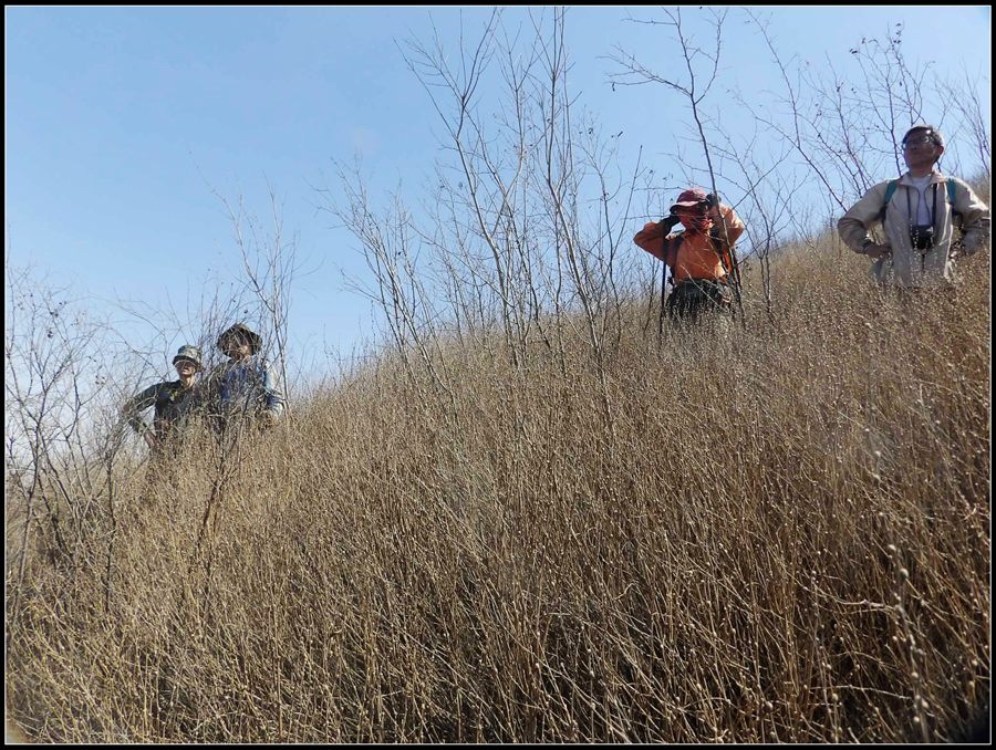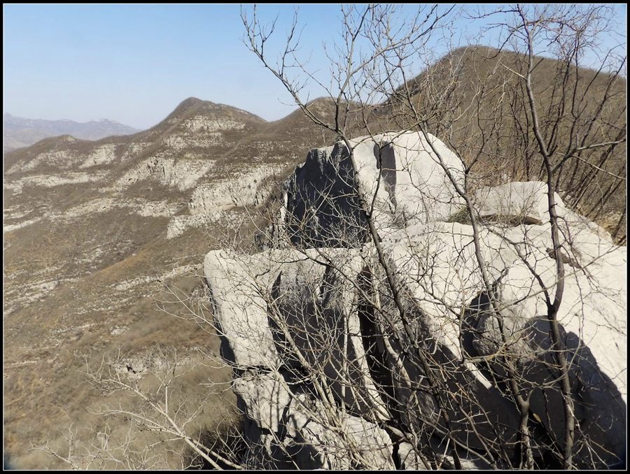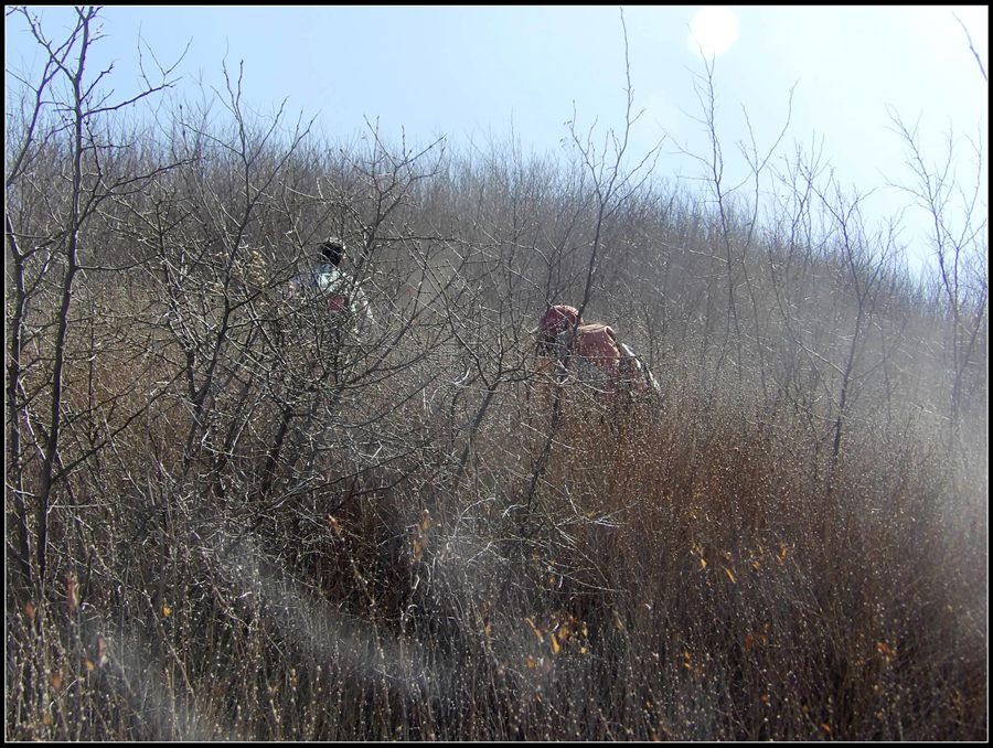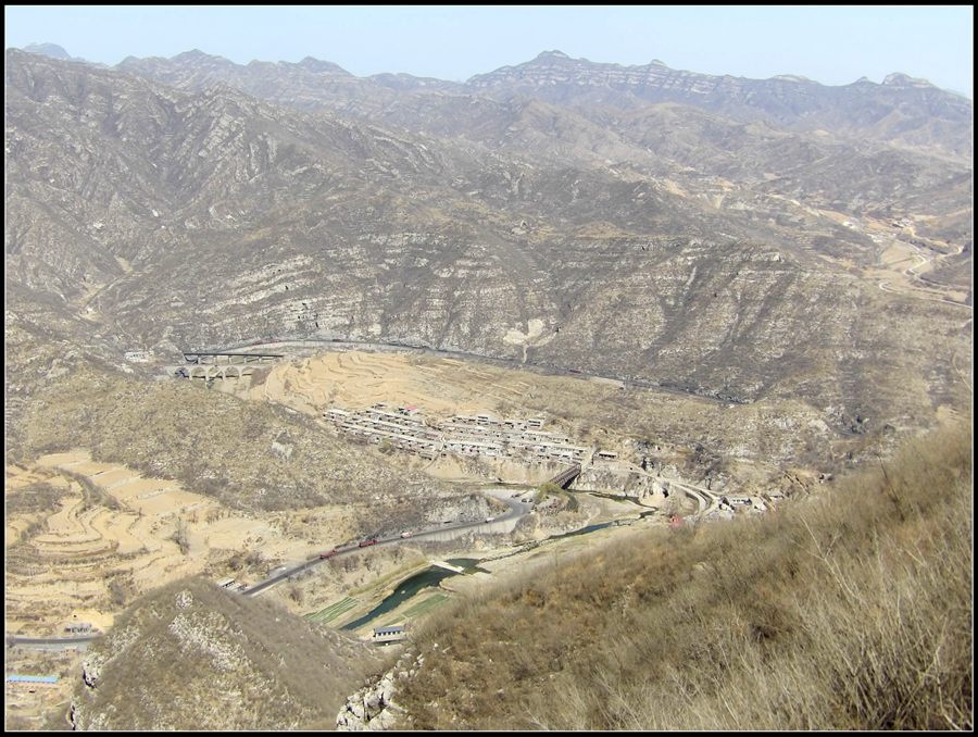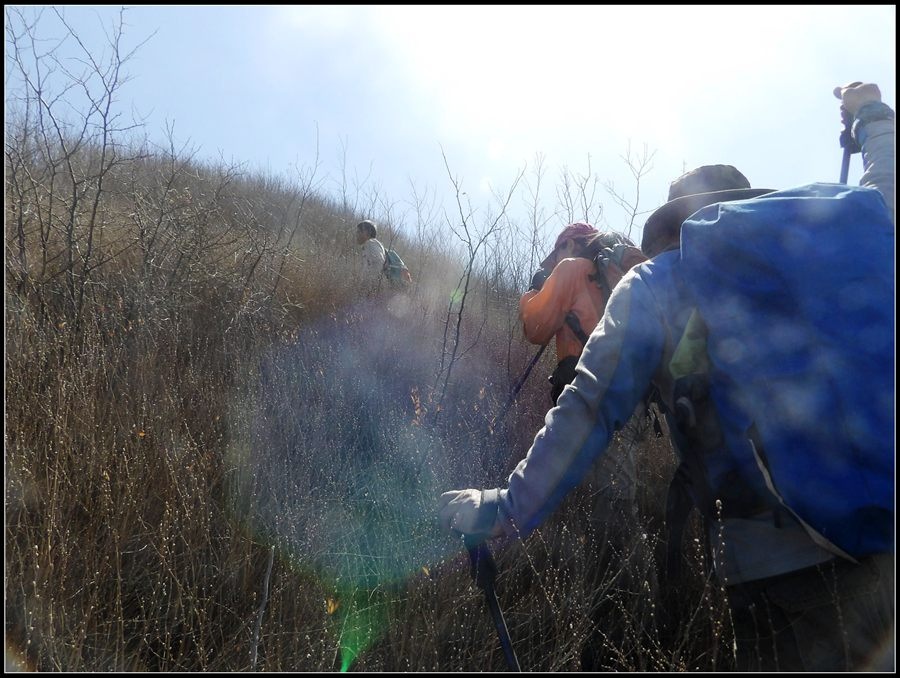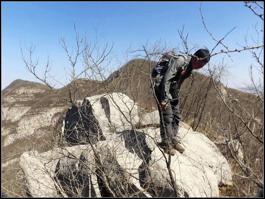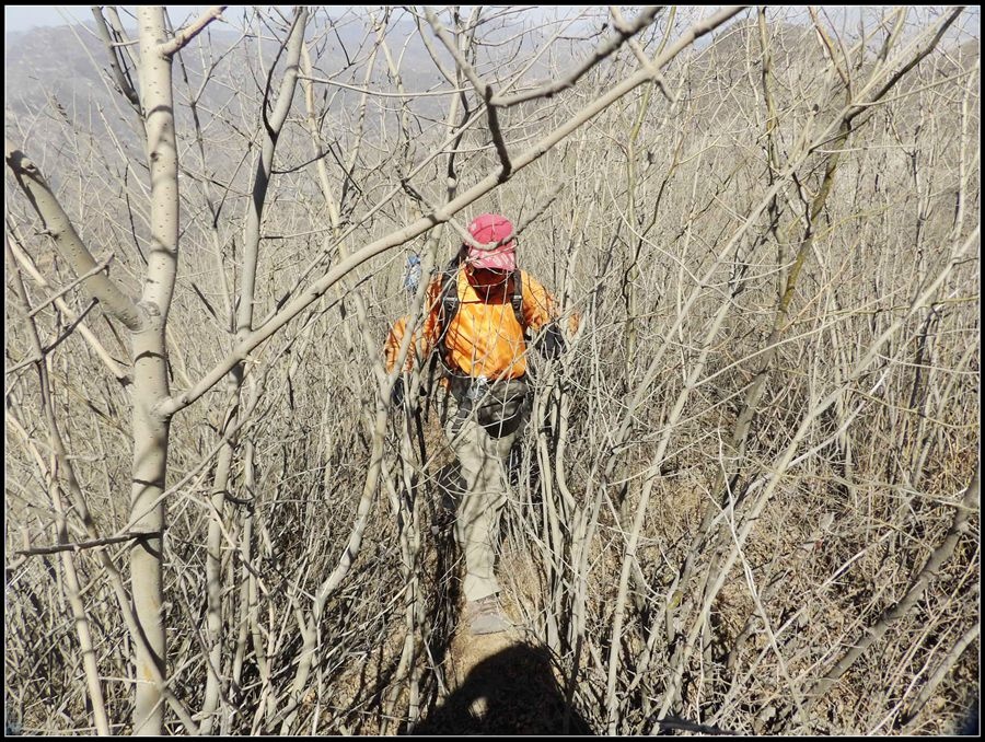 山脊低矮处,我们正想插到山脊上去,悠然却下来和我们汇合了,他说山脊上也尽是灌木,也不好走,闻听此言,我们打消了上山脊的想法,继续向前切去。 山脊拐弯处路断了。这样的山,这样的植被,有路尚切难走,无路更是寸步难行,我们决定上山脊,和老慢他们汇合。因为一般情况下山脊上总是有路。经过一番努力,我们终于钻出了灌木林,登上了山脊。山脊上果然有路,虽说路上也是以火榈圪针为主的灌木,毕竟比无路的山坡好走多了。山脊上,老慢和牛牛已经走的没了影。我们分开灌木,急急的向前赶去。 山脊上的植被 艰难前进中 再看乏驴岭村 还是乏驴岭村,我们所走的山脊围绕乏驴岭转了一个半圆,因此乏驴岭一直在我们的视线中 翻过一个小山包又是一个更高的山头,眼看就要攀到山顶时接到老慢的电话,告诉我,他们在山头的另一侧。可当我登上山头时,视线中却不见老慢和牛牛的影。前边一连又是两个山头,后边,我们侧切过来的山脊上也有两个小山头,老慢他们究竟在那个山头的另一侧?再打电话联系,没了信号,手台,也呼叫不应。我只好向回退,退回到山头的另一侧才打通了电话。经询问,老慢他们已经走过一段的石脊, 眼前的山头那边正是一段石脊,说明他们在我们前边呢。 快速前进,当我们登上第三个小山头时,终于看见下边鞍部有两个人, 正是他们。 行进中看北峪方向(远处正对的沟),当年,17师的将士们就是沿那条沟向撤退的 午餐后继续上路,山脊上的火榈圪针越来越多,我们在灌木林中绕来绕去,艰难而痛苦的前进着,速度比蜗牛都慢。每当山坡上出现一片灌木稀疏处,我们高兴的撩开大步时,都幸福的不行,好象捡了多大的金元宝一样。 遥看山下的村庄 走过一道崖墙 从崖墙上回看我们走过的山脊 这一带的山比较险,山上有多道断崖,每道断崖都连绵数里,象天堑一般。 说真的,若非此山只有一面能攻,当年17师的勇士们也坚守不了那么多天,或者已经全军覆灭了。说起来也算是天不灭曹吧。 走在茂密的灌木林中 前边又是一个不小的上升,山坡上路分成了两岔,我们选择了侧切的路。然而侧切了没有多远路竟丢了,几次寻路未果,我们强行向前横切,但前边的山坡越来越陡,灌木也越来越密,再向前走根本已不可能,我们只好沿越来越陡的山坡向上走,强行上升。人在灌木从中趟过,灌木上落了一冬的浮尘飞起来足有几米高。好在这种局面并没有维持多久,上升不过几十米后我们走上了路。走上了沿山脊上升的那条路。 大家在观察前边的地形 无路上升中,尘土飞起来很高
