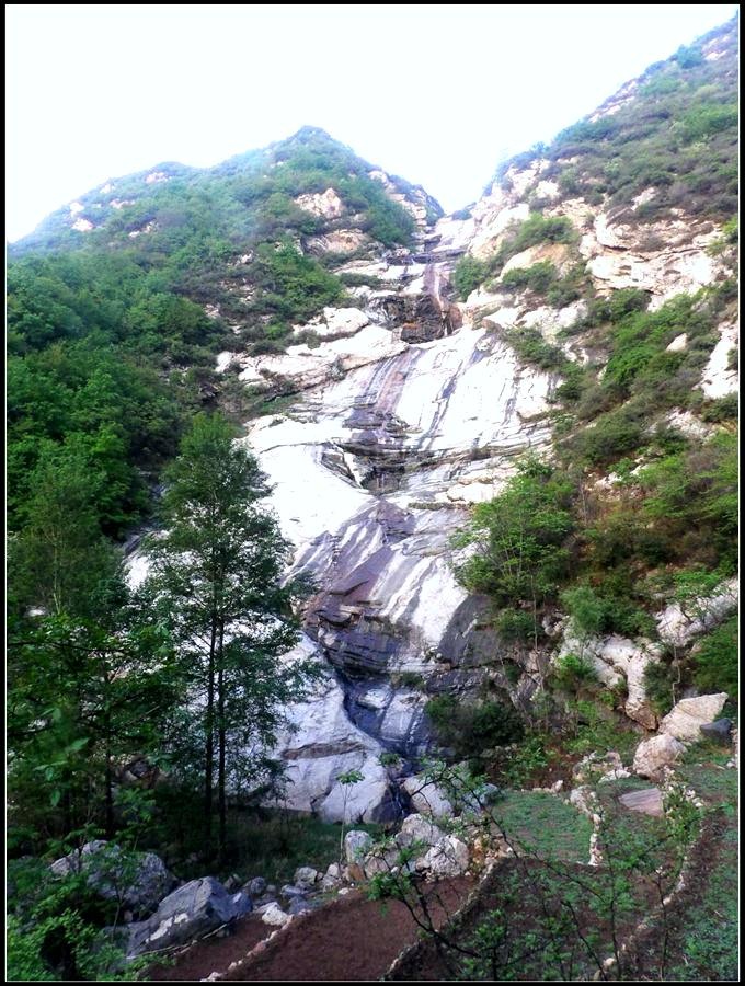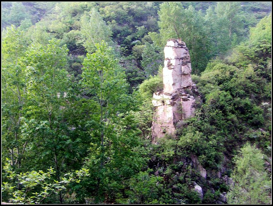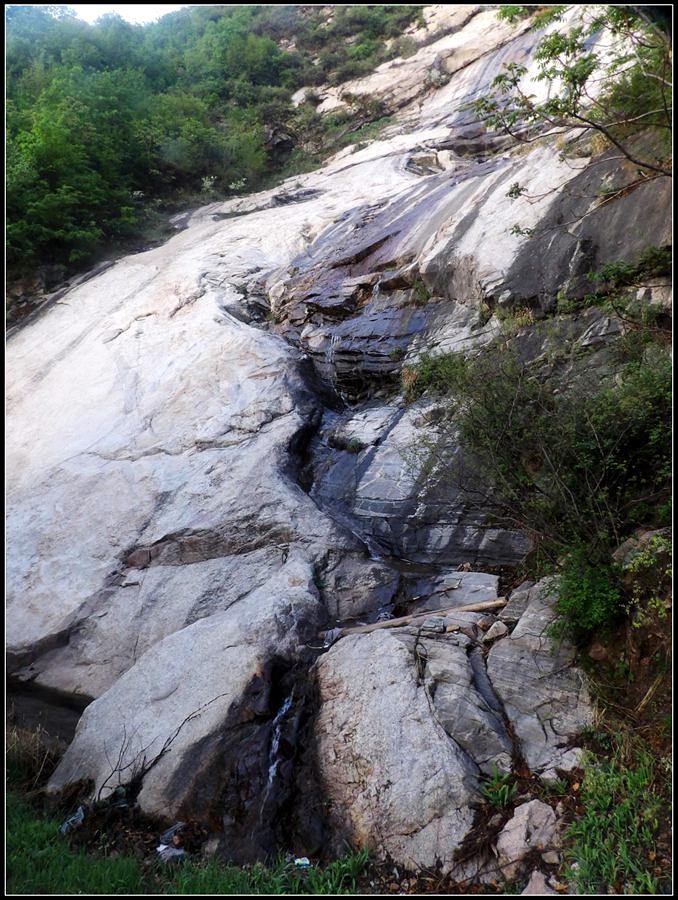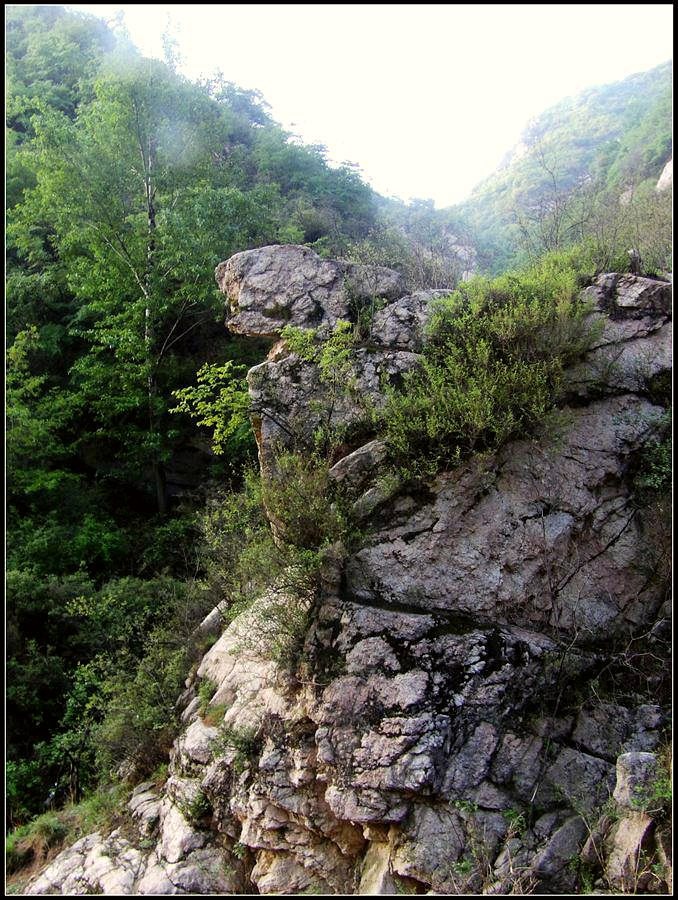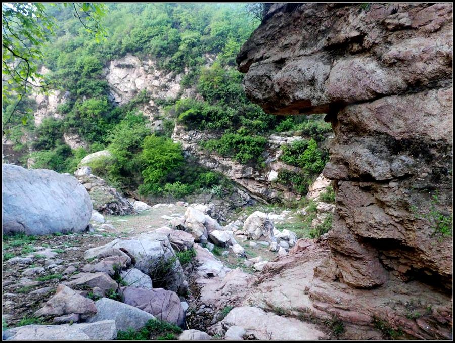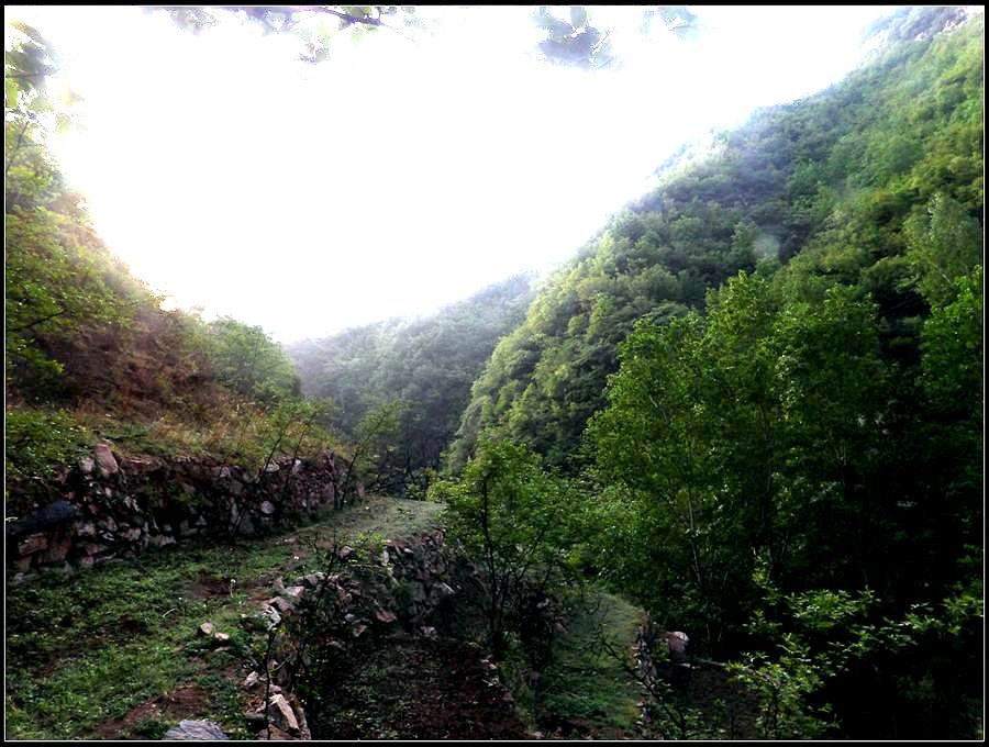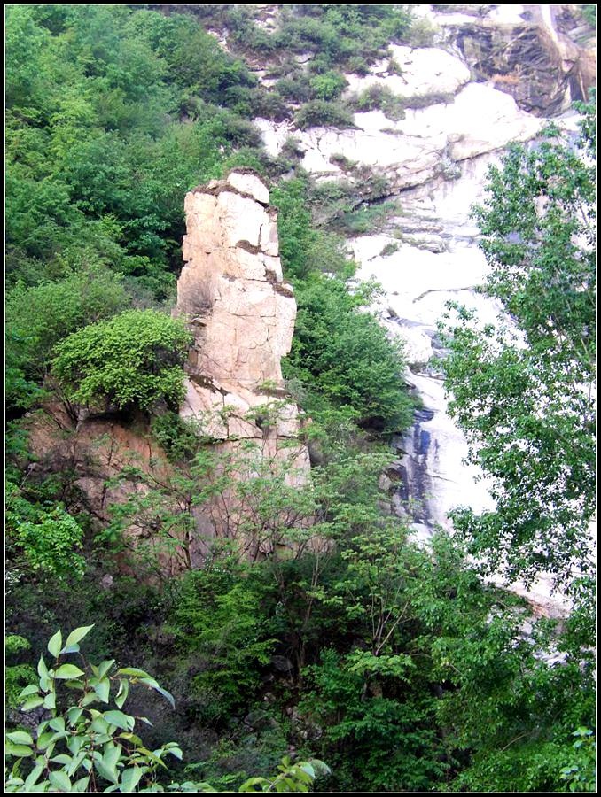 今天的天气预报是小雨。现在的天气预报还真准,尽管我们下车时天还是晴的,但走过大柳树后毛毛雨真的下起来了,我们急急的向前赶着路。 走过一条能通车的岔沟,雨下的紧了,我们穿上了雨衣,冒着雨继续赶路。又过一条岔沟,脚下的路变成了急升,前边是一之字形盘道,看样子要翻梁。我停下了脚步。 小岭到大柳树的路我走过一次,那次是由串上出来,过小岭的下的九里铺。记的由小岭过来是一路顺着沟底的水走,路上没有大的下降,也没有翻梁。难道我们走错路了?叫停了前边的老李,我向回走去,第一个岔沟口我问铃铛(此行的7个人中,铃铛是唯一一个也走过这条路的人) 上次怎么走的还有印象么。铃铛也记不清楚。进岔沟察看了一下,这条沟中没大路,不是我们走过的沟。莫非在前边那条岔沟就走错了?我继续向回退去。 拐进第二条岔沟,行有200多米,我惊喜的发现高高的山脊上有个放羊人。“老乡——,问下路——,小岭是这么走么——?” 我大声的喊着。老乡也大声的回着: “错了——,走过了——,走那边——”。看来是我的记忆出现了问题。谢过老乡。我向回走去。 因为下雨,这段路一直没有拍照,直到后来宿营后才又开始照相。 我们的营地 大路急拐弯处有条小路,我们兵分两路,有人走小路,有人走大路,很快都到达了小岭村。此时雨下的正紧,尽管现在刚4点多点,我还是决定就地扎营。我们还从没有这么早扎过营,之所以在小岭扎营,主要是去年我们从串上往花果山穿结果没能走通,串上的老乡说山脊走不通。所以这次我想从小岭穿花果山,从卫星图上看,小岭村北有条小路,似乎能通花果山方向。 我们左转右转,村里没有合适的营地。一个老乡给我们打开一间屋子,但里边很乱,最多能挤3、5个人。最终,大多数人选择了村口一侧的废梯田,只有老史和老李住了“宾馆"。 有点小意外的是, 当我们准备扎营时,雨停了。 一夜无提。天亮了,我早早的起了床。看时间还早,我决定在村子周边遛达遛达,有人将这种行为称为巡山。 小岭村位于4条沟的交汇处。村北、村南是两条旱沟,村西北、村西南的沟分别有不大的溪流,两条沟的汇合处是一道突起的石脊,那座石脊是两条沟的分水岭。石脊上有一立石,如同一把利锥直刺云天, 成为小岭村一景。小岭村就坐落在石脊北侧,西北方向的沟口处。这条沟又以是去串上的必经之路,不过其景色平平,小溪也没多长,不看也罢。而西南方向的主沟就不同了,沿主沟上行二三百米是一个百米高崖。崖壁上拍有一百米飞瀑,每年春季瀑水不大,近似干沽,一旦到了雨季那瀑却十分的壮观,天上之水跌跌撞撞的砸下沟底,涛声如雷,响彻云天。而最漂亮的季节当属冬季了,万木皆枯的冬季,巨大的冰瀑悬挂在百米苍崖上,如一条银龙从天而降,头伏大地,尾却还在天云里,壮观的景色每年都吸引众多的游人来此观冰。此时,这条沟正是我的兴趣所在。 营地一侧的石峰 沿出村的老道向下走,绕过眼前的石脊,我进入了西南方向的主沟里,沿着潺潺的小溪向沟的上游走去。那个渐行渐远的石峰一直在身后默默的注视着我。它好象有些好奇:“他起那么早,一个人进沟去干什么”? 绕过的石脊 从不同的位置看那个石峰 沟底的小溪 沿沟向里走2、300米,沟收窄了,巨大的滚石横七竖八的卧在沟底,眼前已经没了路。我只能向沟右手的陡坡之上攀去,攀过几层梯田,有条不大的小路。沿那条路很快就到了沟的尽头。沟的尽头是一道高高的崖壁,其高度足有上百米,崖壁虽非刀切那样的直,却也象斧剁一般的险,一道细细的水流挂在崖壁上,这就是小岭瀑布。 从小路上看前边的崖壁 沟对面的石柱 高高的崖壁 崖壁的上半部分 瀑布的底部 看过瀑布,顺原路返回。这是返回路上拍的沟的下游 走回岔沟口,我没有回营地,而是继续顺沟向下走,又走了百来米,走到正南那条岔沟的沟口才止步。这个沟口也有一个不错的石头,只是背景不好,拍出的照片一般般。 小岭的进村路 岔沟口的石头