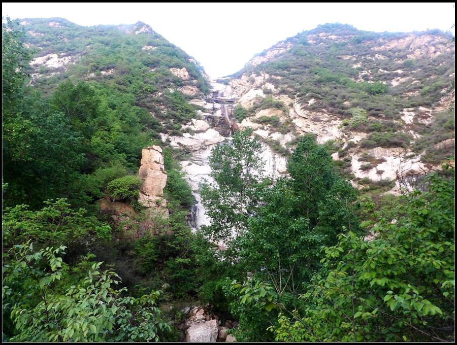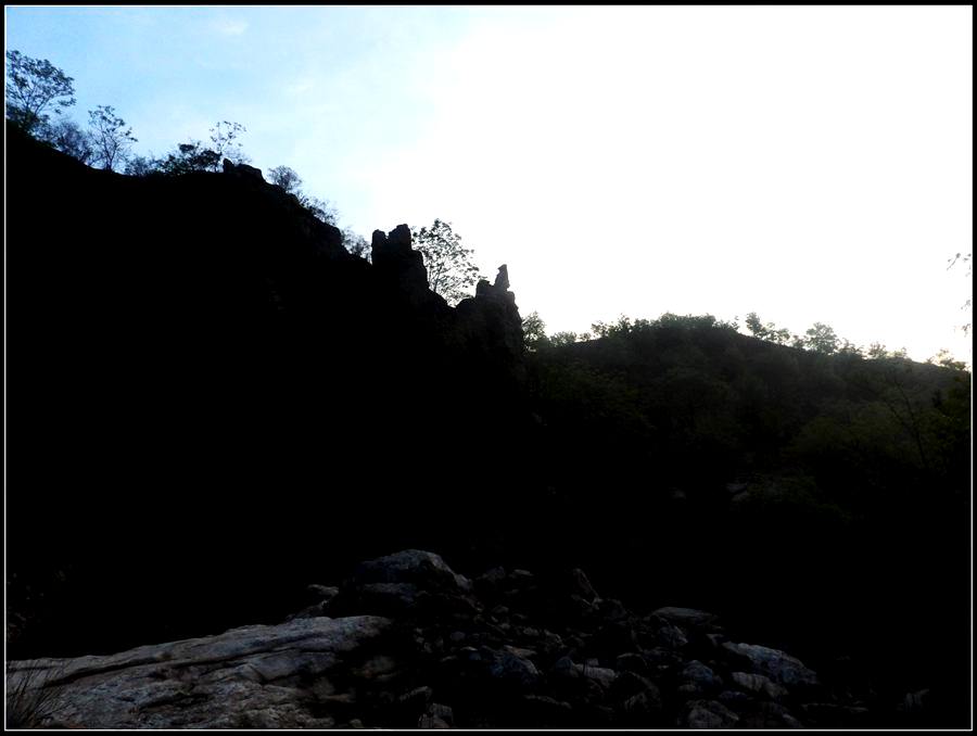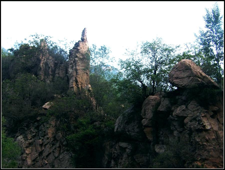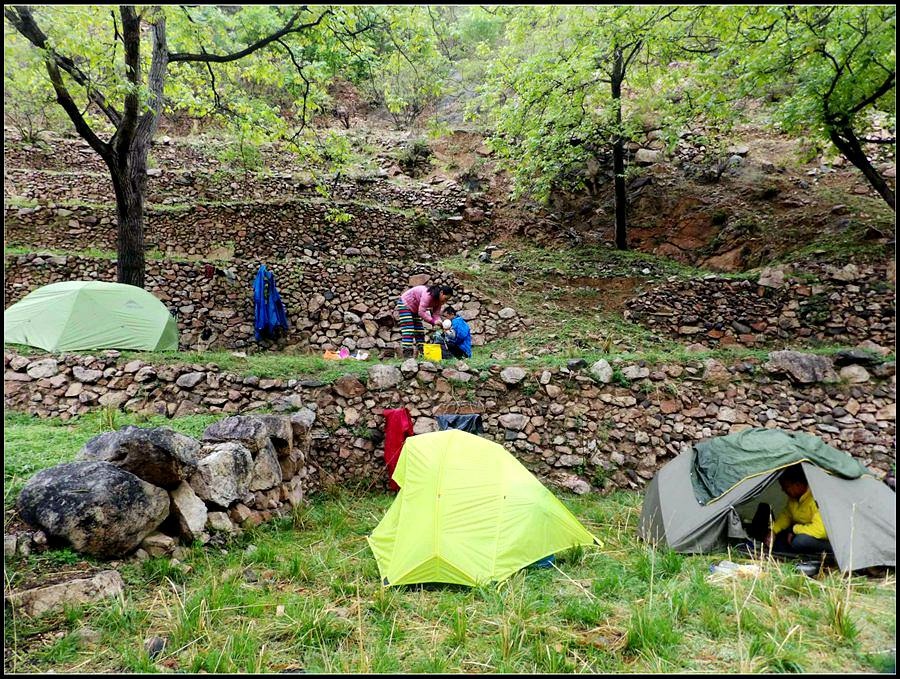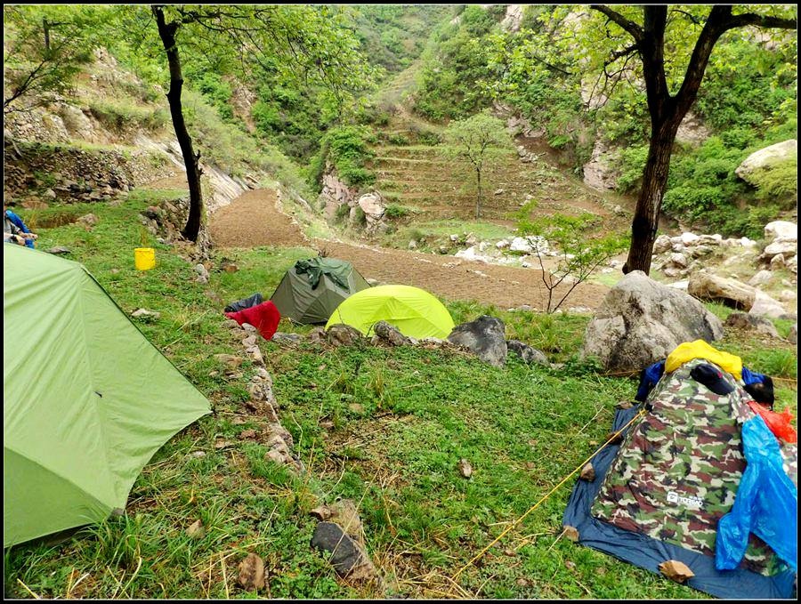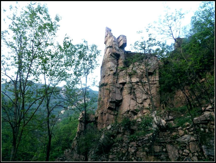 今天的天气预报是小雨。现在的天气预报还真准,尽管我们下车时天还是晴的,但走过大柳树后毛毛雨真的下起来了,我们急急的向前赶着路。 走过一条能通车的岔沟,雨下的紧了,我们穿上了雨衣,冒着雨继续赶路。又过一条岔沟,脚下的路变成了急升,前边是一之字形盘道,看样子要翻梁。我停下了脚步。 小岭到大柳树的路我走过一次,那次是由串上出来,过小岭的下的九里铺。记的由小岭过来是一路顺着沟底的水走,路上没有大的下降,也没有翻梁。难道我们走错路了?叫停了前边的老李,我向回走去,第一个岔沟口我问铃铛(此行的7个人中,铃铛是唯一一个也走过这条路的人) 上次怎么走的还有印象么。铃铛也记不清楚。进岔沟察看了一下,这条沟中没大路,不是我们走过的沟。莫非在前边那条岔沟就走错了?我继续向回退去。 拐进第二条岔沟,行有200多米,我惊喜的发现高高的山脊上有个放羊人。“老乡——,问下路——,小岭是这么走么——?” 我大声的喊着。老乡也大声的回着: “错了——,走过了——,走那边——”。看来是我的记忆出现了问题。谢过老乡。我向回走去。 因为下雨,这段路一直没有拍照,直到后来宿营后才又开始照相。 我们的营地 大路急拐弯处有条小路,我们兵分两路,有人走小路,有人走大路,很快都到达了小岭村。此时雨下的正紧,尽管现在刚4点多点,我还是决定就地扎营。我们还从没有这么早扎过营,之所以在小岭扎营,主要是去年我们从串上往花果山穿结果没能走通,串上的老乡说山脊走不通。所以这次我想从小岭穿花果山,从卫星图上看,小岭村北有条小路,似乎能通花果山方向。 我们左转右转,村里没有合适的营地。一个老乡给我们打开一间屋子,但里边很乱,最多能挤3、5个人。最终,大多数人选择了村口一侧的废梯田,只有老史和老李住了“宾馆"。 有点小意外的是, 当我们准备扎营时,雨停了。 一夜无提。天亮了,我早早的起了床。看时间还早,我决定在村子周边遛达遛达,有人将这种行为称为巡山。 小岭村位于4条沟的交汇处。村北、村南是两条旱沟,村西北、村西南的沟分别有不大的溪流,两条沟的汇合处是一道突起的石脊,那座石脊是两条沟的分水岭。石脊上有一立石,如同一把利锥直刺云天, 成为小岭村一景。小岭村就坐落在石脊北侧,西北方向的沟口处。这条沟又以是去串上的必经之路,不过其景色平平,小溪也没多长,不看也罢。而西南方向的主沟就不同了,沿主沟上行二三百米是一个百米高崖。崖壁上拍有一百米飞瀑,每年春季瀑水不大,近似干沽,一旦到了雨季那瀑却十分的壮观,天上之水跌跌撞撞的砸下沟底,涛声如雷,响彻云天。而最漂亮的季节当属冬季了,万木皆枯的冬季,巨大的冰瀑悬挂在百米苍崖上,如一条银龙从天而降,头伏大地,尾却还在天云里,壮观的景色每年都吸引众多的游人来此观冰。此时,这条沟正是我的兴趣所在。 营地一侧的石峰 沿出村的老道向下走,绕过眼前的石脊,我进入了西南方向的主沟里,沿着潺潺的小溪向沟的上游走去。那个渐行渐远的石峰一直在身后默默的注视着我。它好象有些好奇:“他起那么早,一个人进沟去干什么”? 绕过的石脊 从不同的位置看那个石峰 沟底的小溪 沿沟向里走2、300米,沟收窄了,巨大的滚石横七竖八的卧在沟底,眼前已经没了路。我只能向沟右手的陡坡之上攀去,攀过几层梯田,有条不大的小路。沿那条路很快就到了沟的尽头。沟的尽头是一道高高的崖壁,其高度足有上百米,崖壁虽非刀切那样的直,却也象斧剁一般的险,一道细细的水流挂在崖壁上,这就是小岭瀑布。 从小路上看前边的崖壁 沟对面的石柱 高高的崖壁 崖壁的上半部分 瀑布的底部 看过瀑布,顺原路返回。这是返回路上拍的沟的下游 走回岔沟口,我没有回营地,而是继续顺沟向下走,又走了百来米,走到正南那条岔沟的沟口才止步。这个沟口也有一个不错的石头,只是背景不好,拍出的照片一般般。 小岭的进村路 岔沟口的石头