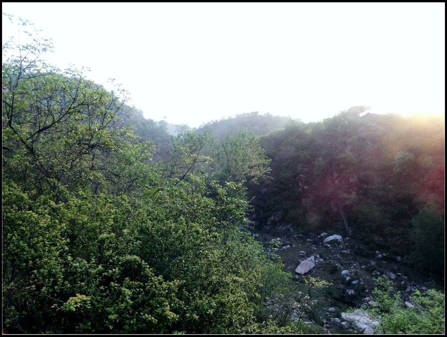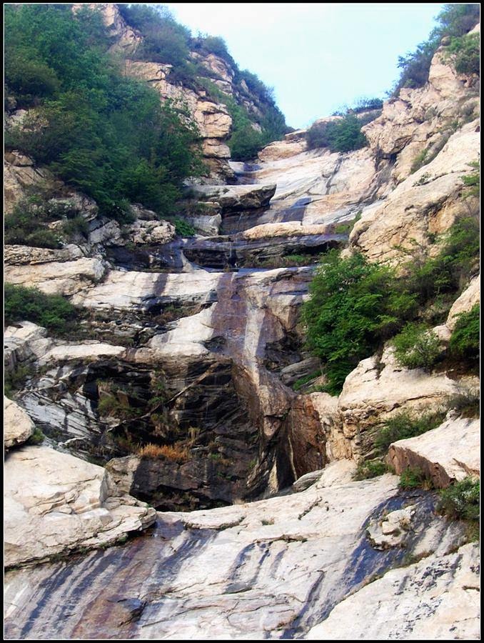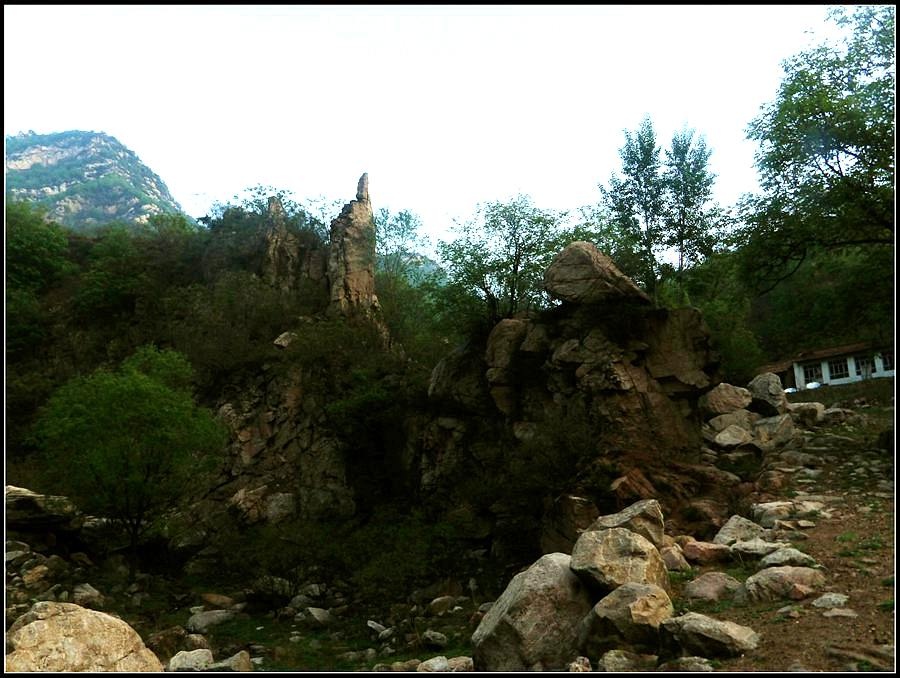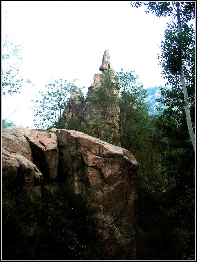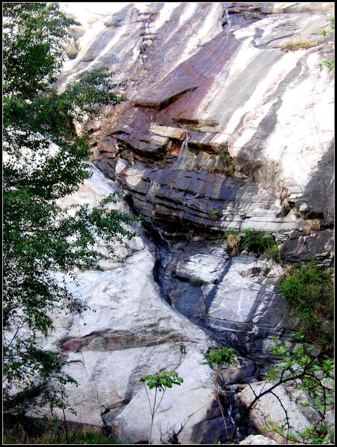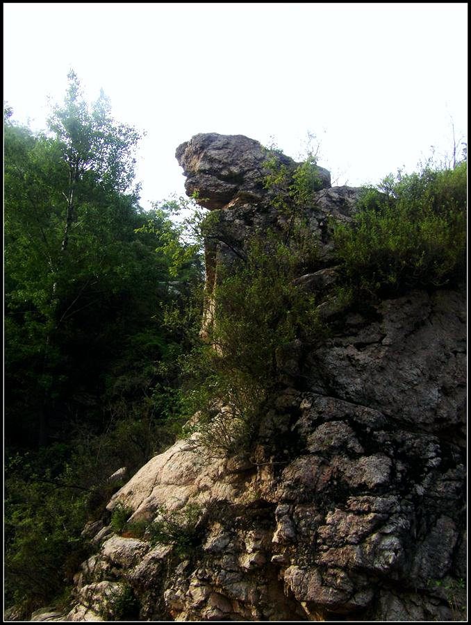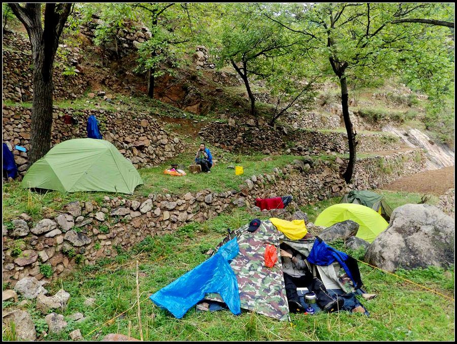 今天的天气预报是小雨。现在的天气预报还真准,尽管我们下车时天还是晴的,但走过大柳树后毛毛雨真的下起来了,我们急急的向前赶着路。 走过一条能通车的岔沟,雨下的紧了,我们穿上了雨衣,冒着雨继续赶路。又过一条岔沟,脚下的路变成了急升,前边是一之字形盘道,看样子要翻梁。我停下了脚步。 小岭到大柳树的路我走过一次,那次是由串上出来,过小岭的下的九里铺。记的由小岭过来是一路顺着沟底的水走,路上没有大的下降,也没有翻梁。难道我们走错路了?叫停了前边的老李,我向回走去,第一个岔沟口我问铃铛(此行的7个人中,铃铛是唯一一个也走过这条路的人) 上次怎么走的还有印象么。铃铛也记不清楚。进岔沟察看了一下,这条沟中没大路,不是我们走过的沟。莫非在前边那条岔沟就走错了?我继续向回退去。 拐进第二条岔沟,行有200多米,我惊喜的发现高高的山脊上有个放羊人。“老乡——,问下路——,小岭是这么走么——?” 我大声的喊着。老乡也大声的回着: “错了——,走过了——,走那边——”。看来是我的记忆出现了问题。谢过老乡。我向回走去。 因为下雨,这段路一直没有拍照,直到后来宿营后才又开始照相。 我们的营地 大路急拐弯处有条小路,我们兵分两路,有人走小路,有人走大路,很快都到达了小岭村。此时雨下的正紧,尽管现在刚4点多点,我还是决定就地扎营。我们还从没有这么早扎过营,之所以在小岭扎营,主要是去年我们从串上往花果山穿结果没能走通,串上的老乡说山脊走不通。所以这次我想从小岭穿花果山,从卫星图上看,小岭村北有条小路,似乎能通花果山方向。 我们左转右转,村里没有合适的营地。一个老乡给我们打开一间屋子,但里边很乱,最多能挤3、5个人。最终,大多数人选择了村口一侧的废梯田,只有老史和老李住了“宾馆"。 有点小意外的是, 当我们准备扎营时,雨停了。 一夜无提。天亮了,我早早的起了床。看时间还早,我决定在村子周边遛达遛达,有人将这种行为称为巡山。 小岭村位于4条沟的交汇处。村北、村南是两条旱沟,村西北、村西南的沟分别有不大的溪流,两条沟的汇合处是一道突起的石脊,那座石脊是两条沟的分水岭。石脊上有一立石,如同一把利锥直刺云天, 成为小岭村一景。小岭村就坐落在石脊北侧,西北方向的沟口处。这条沟又以是去串上的必经之路,不过其景色平平,小溪也没多长,不看也罢。而西南方向的主沟就不同了,沿主沟上行二三百米是一个百米高崖。崖壁上拍有一百米飞瀑,每年春季瀑水不大,近似干沽,一旦到了雨季那瀑却十分的壮观,天上之水跌跌撞撞的砸下沟底,涛声如雷,响彻云天。而最漂亮的季节当属冬季了,万木皆枯的冬季,巨大的冰瀑悬挂在百米苍崖上,如一条银龙从天而降,头伏大地,尾却还在天云里,壮观的景色每年都吸引众多的游人来此观冰。此时,这条沟正是我的兴趣所在。 营地一侧的石峰 沿出村的老道向下走,绕过眼前的石脊,我进入了西南方向的主沟里,沿着潺潺的小溪向沟的上游走去。那个渐行渐远的石峰一直在身后默默的注视着我。它好象有些好奇:“他起那么早,一个人进沟去干什么”? 绕过的石脊 从不同的位置看那个石峰 沟底的小溪 沿沟向里走2、300米,沟收窄了,巨大的滚石横七竖八的卧在沟底,眼前已经没了路。我只能向沟右手的陡坡之上攀去,攀过几层梯田,有条不大的小路。沿那条路很快就到了沟的尽头。沟的尽头是一道高高的崖壁,其高度足有上百米,崖壁虽非刀切那样的直,却也象斧剁一般的险,一道细细的水流挂在崖壁上,这就是小岭瀑布。 从小路上看前边的崖壁 沟对面的石柱 高高的崖壁 崖壁的上半部分 瀑布的底部 看过瀑布,顺原路返回。这是返回路上拍的沟的下游 走回岔沟口,我没有回营地,而是继续顺沟向下走,又走了百来米,走到正南那条岔沟的沟口才止步。这个沟口也有一个不错的石头,只是背景不好,拍出的照片一般般。 小岭的进村路 岔沟口的石头