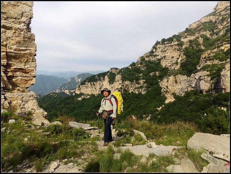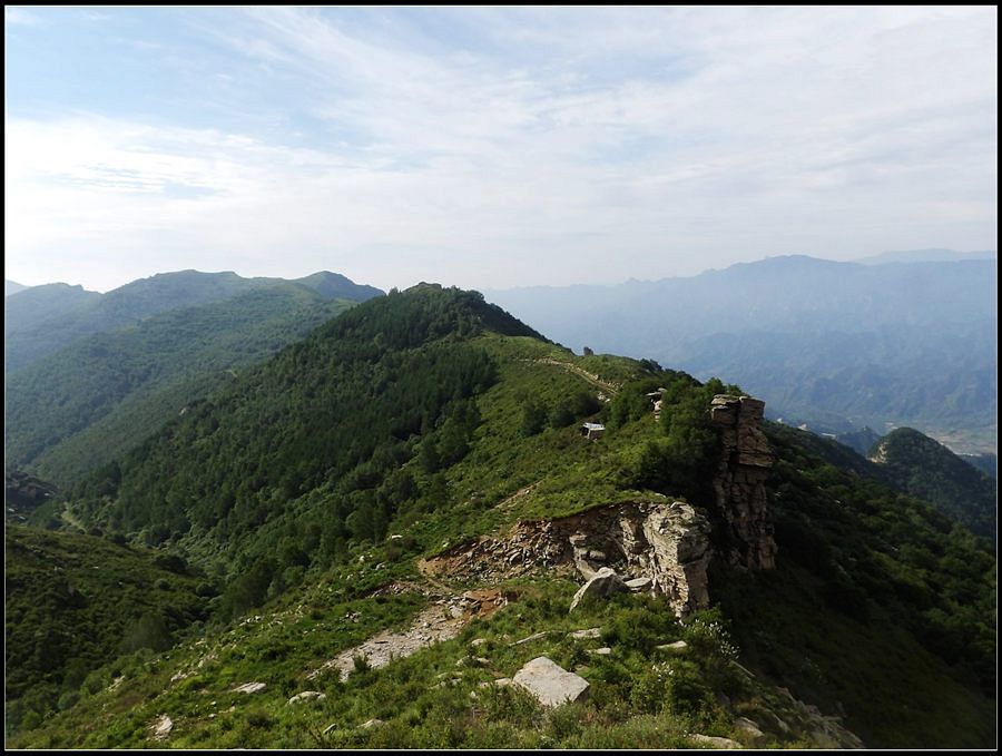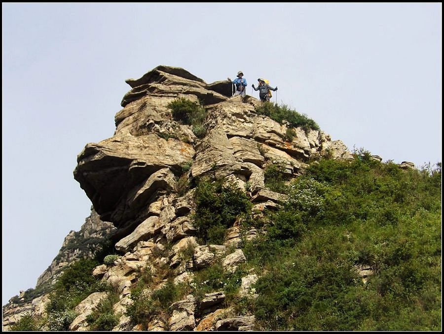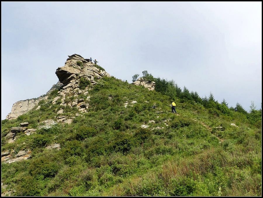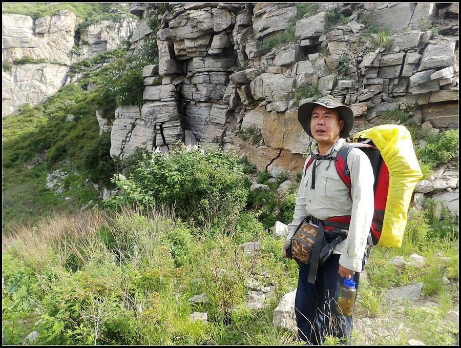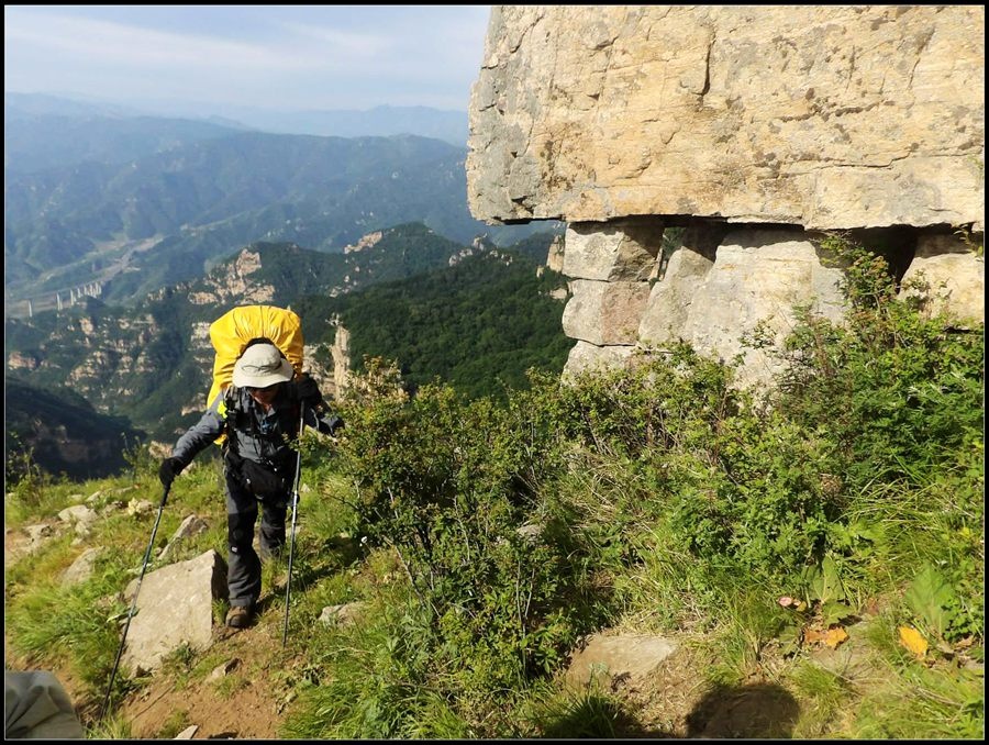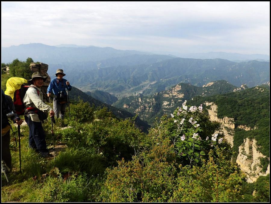 得瑟够了,我返回了营地。现在要去打水,然后做饭,今天争取早点出发。大夏天的,早点出发走路凉快。 那边,老王早已打回水来了,正在做饭,老王真够积极的。老王这个人,往往什么事不用你说,他主动就想在前边,做在前边。和这样的同伴出行,我喜欢。 扎在路边的营地 从营地看歪头山主峰。其实我们前边看到的歪头山都是歪头山的次峰,次峰海拔2254米高。歪头山真正的主峰在那个歪头的北侧,是个浑圆的毫无特色的山头。因歪头山的次峰更有特色,从河北一带看过去更显眼,所以这座山就被冠之以歪头山的名字了。 主峰海拔2286米歪头山,在河北十大独立高峰群中位列第7,也是河北十一个地级市中除了张家口市境内的山之外的最高山了。它巍然屹立在晋冀两冰片的交界处,南北两向的山脊构成了晋冀两省的天然分界线。歪头山西侧是有华北屋脊之称的大五台,东侧则是长达20公里的花尖梁、黄落伞、摩天岭山脊,歪头山正处在四条十字架形的山脊的交汇处。 附,河北十大独立高峰群 1.小五台 2882米(张家口蔚县、琢鹿交界处) 2.茶山 2524米 (张家口蔚县) 3.灵山 2420米(又叫西灵山,张家口涿鹿,) 4.摆宴陀 2307米 (张家口蔚县) 5.东灵山 2303米( 张家口涿鹿、北京门头沟交界) 6.东猴顶 2293米(张家口 赤城) 7.歪头山 2286米(保定阜平、山西繁驰交界) 8.南驼 2281米 (保定阜平、石家庄市平山、山西五台交界) 9.海坨 2241米 (张家口赤城、北京延庆交界) 10.冰山梁 2211米 (张家口赤城、沽源交界) 另外需要说明,有其它资料将韩家洼山(2488米、韭菜梁山(2262米)列入河北10大高山之中,其实韩家洼山、韭菜梁均是小五台余脉,并非独立的山。特别是韩家洼,距小五的东台只有几公里,与水五的山脊一脉相连,两者之间没有明显的地理分隔,如果韩家洼山能算成独立的山,那小五台余脉中的另几个山头如牛草沟南顶(2654)、乔力皮山(2321米)特别是距小五台较远的白谷查山(2300多米,具体数值不详)更应该算为河北10大高峰了。如果这样排名,歪头山肯定就被挤出前10之列了。 从营地看歪头山主峰 我们脚下的沟,即面然清那条沟。这条沟的出口在吴王口,全长70多华里,是阜平最深的一条沟,又称银河大峡谷 对面,赶着牛下山的老乡 对面山梁上的石,远拍,虚的严重 远拍歪头山下的石,关于此石后边会重点说到 8点稍过我们上路了。今天的队伍出现了“战斗减员”,昨天,在向大路攀升时,驼铃踩上了一块活石头,闪了一下,拉伤了腿。睡了一夜,今天起来疼痛一点不见轻,反而更历害,所以今天只能下撤。好在有老马陪着她(老马和驼铃的关系那可是不一般的关系,铁的很哦,每次出来两人都是一起报名,活动中也是成双成对,用句文明词,那叫如影如形,要问他俩咋那么亲密,呵呵,别想歪了,人家可是夫妻),好在他们可以走孟寺塔城的大路下山,前边说过,那条路老马开车走过一次。 老马也是疯惯了的人,虽说不能和我们一起向前走了,可他并不想下山,他打算今天下撤到孟寺塔扎营,明天再下山。爱山的人,进了山就象撒欢的小马驹子,拦也拦不住。现在老马要陪我们一起往前“遛达遛达”,等我们补完水再回去,说白了,是想带我们去补水。感动,感动的哗哗的眼泪。 陪我们一起向前走的老马 从我们扎营的地方向歪头山走不远是大路的尽头,山脊上被人工挖开一个山口,山口的那边并没有下山路,而是百丈悬崖,既然不是修路,挖这个山口做什么?有人说,是当年的阎老西修工事挖的,也有人说开矿的挖的,众说不一,不置可否。 众人在这儿小小的得瑟了一番,在众人拍照时,只有西西独自一人继续向前走去。 山口留影的葫芦岛 从山口看黑崖沟,脚下是深不可测的悬崖 停留的时间很短,不过一两分钟时间,拍照之后我们又继续上路了。大路到此已是尽头,从现在开始我们又走上了小路,充满未知的小路、崎岖不平的小路,让某些普通人谈虎色变,但却是我们的最爱。因为只有人迹罕至的地方,才有别人看不到的美景。 从山脊高处看下边的山口 山口一侧,曾经的简易房,看到这处废弃不算太久的简易房,我们更相信下边的山口是挖矿形成的 现在我们走的这条山脊,一侧是刀劈斧剁般的百丈深渊,悬壁如一道长墙。另一侧是大约40度的陡坡、坡上绿树葱笼象条碧玉带,两侧对比强烈,风光那是相当的美。队员们为美景吸引,不时的停下脚步,或观赏、或拍照,大家走的都比较轻松,心情舒松,脚步也轻松。你要问为什么 ,现在不说,先卖个关子。 回看我们身后的山脊 现在我们看到的是保阜高速黑崖沟大桥。黑崖沟大桥其实是相连的两座桥,其中黑崖沟1号桥是河北省内单孔跨度最大的高速公路桥,单孔跨径达135米桥。黑崖沟2号桥则以高箸称,其中最高的7号墩墩高120.5米,仅一个桥墩的总重就达到15万吨,堪称为华北最高桥。保阜高速和山西欣五高速对接,连通了河北及京津一带和山西北部的交通,也成为歪头山区的一道风景线。 路开始了急升,步步登高的路让我们步履不再轻松,我们只能放慢脚步缓缓而行。尽管大家都 放慢了脚步,边走边拍的我还是渐渐的落在了最后。 老王走过一个巨石,此石的独特之处是上边的石头比较大,象个蘑菇头,它的一端坐在下边较小的石座上,另一端好象是用三块叠在一起的小石头支住一样 再看我们扎营的山脊。此时,不远处的小山包上,昨天看到过的那个烽火台出现在视线中。这个烽火台是内长城龙泉关关