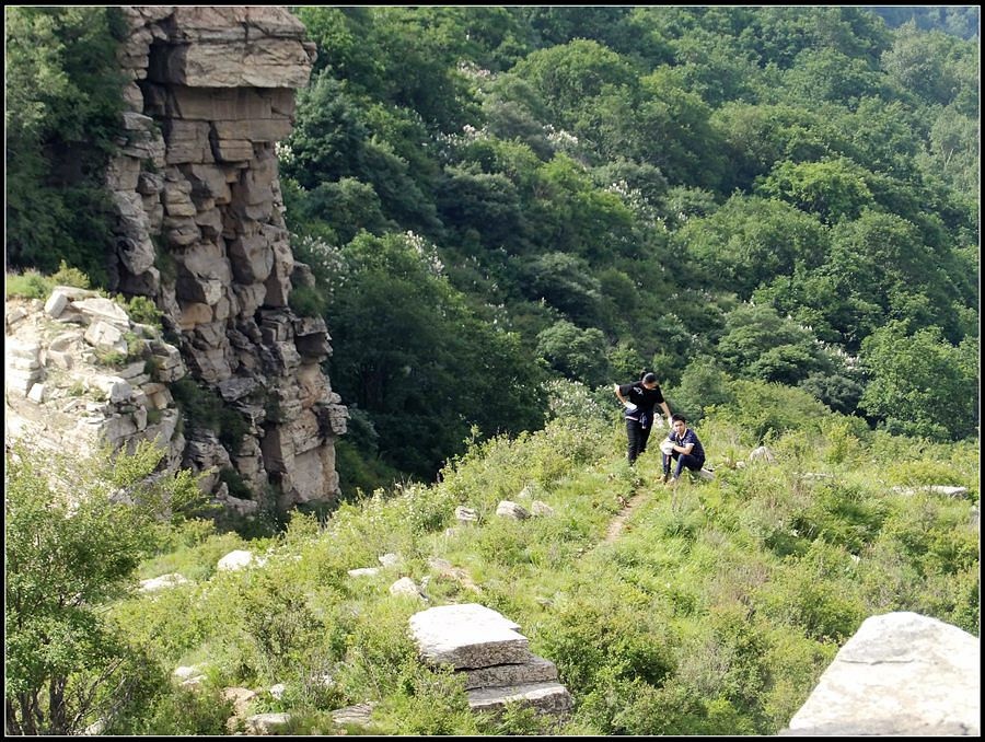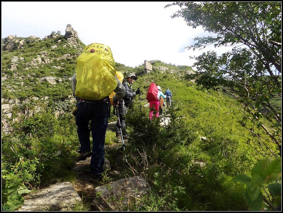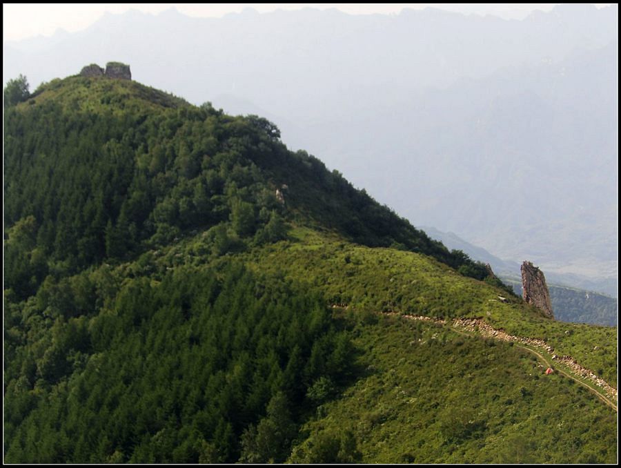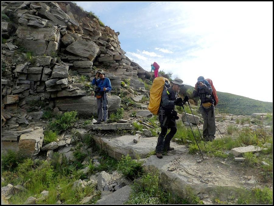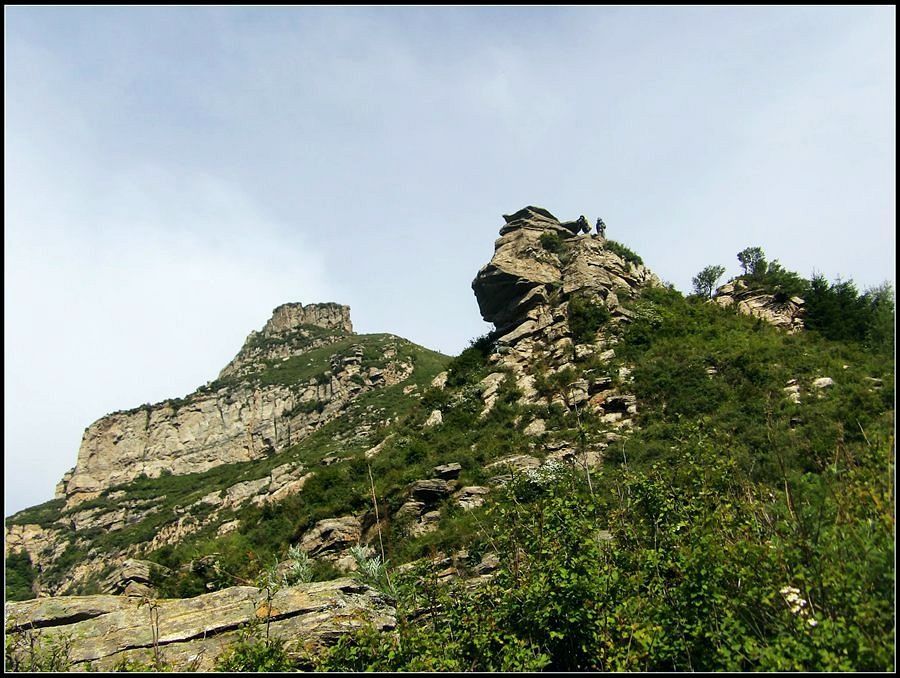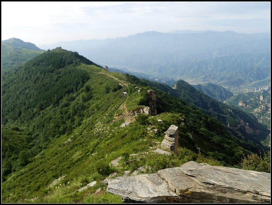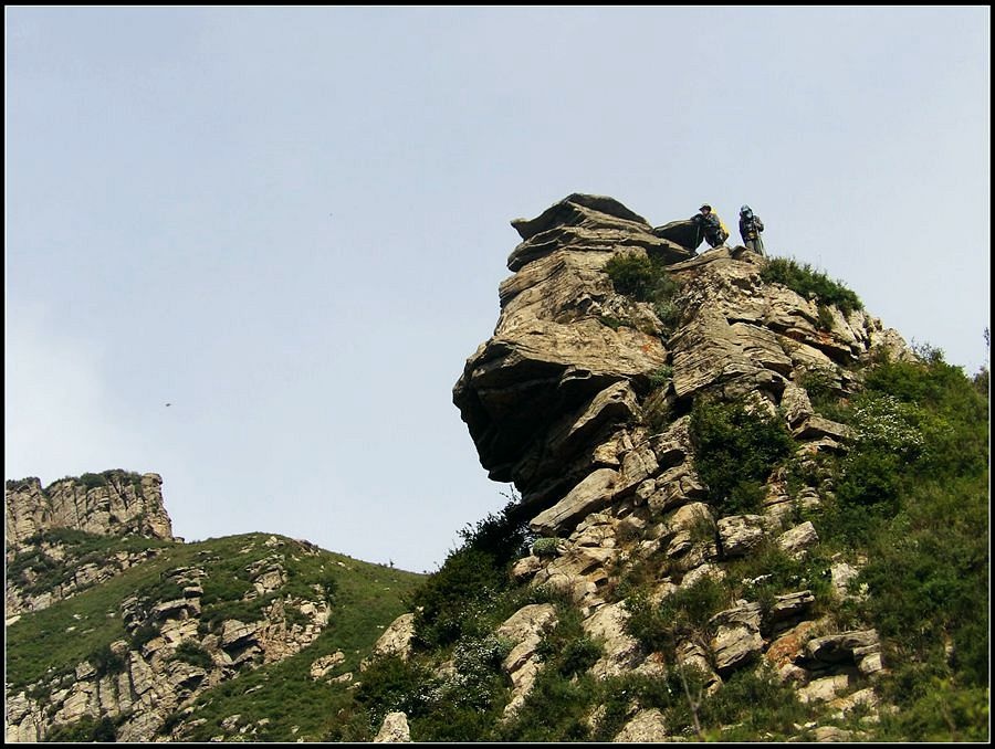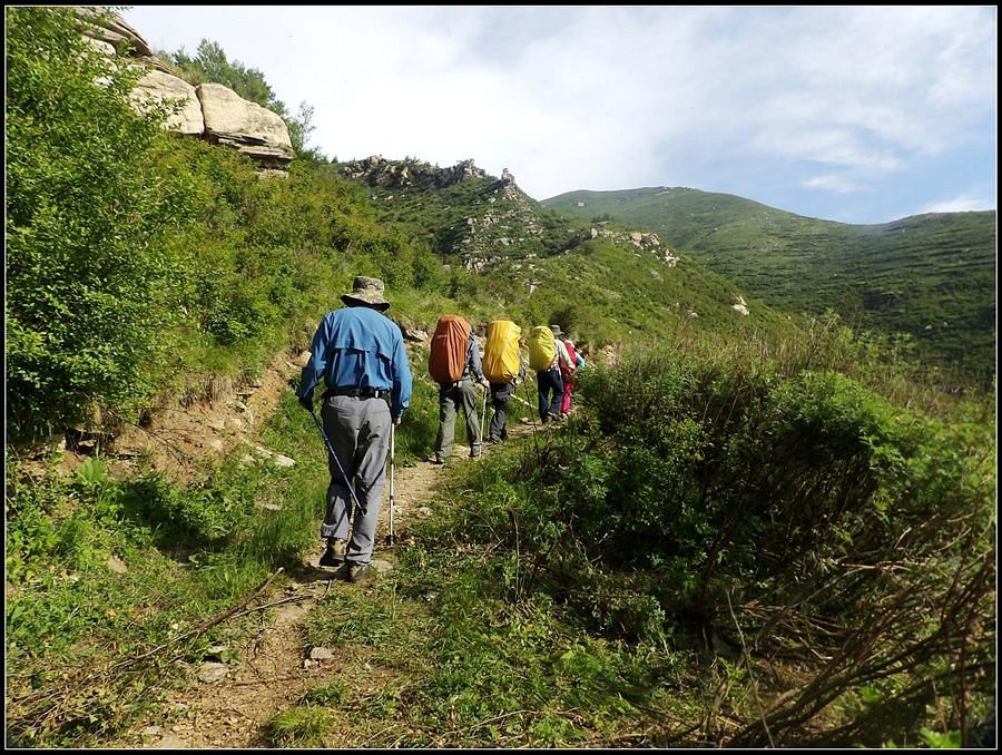 得瑟够了,我返回了营地。现在要去打水,然后做饭,今天争取早点出发。大夏天的,早点出发走路凉快。 那边,老王早已打回水来了,正在做饭,老王真够积极的。老王这个人,往往什么事不用你说,他主动就想在前边,做在前边。和这样的同伴出行,我喜欢。 扎在路边的营地 从营地看歪头山主峰。其实我们前边看到的歪头山都是歪头山的次峰,次峰海拔2254米高。歪头山真正的主峰在那个歪头的北侧,是个浑圆的毫无特色的山头。因歪头山的次峰更有特色,从河北一带看过去更显眼,所以这座山就被冠之以歪头山的名字了。 主峰海拔2286米歪头山,在河北十大独立高峰群中位列第7,也是河北十一个地级市中除了张家口市境内的山之外的最高山了。它巍然屹立在晋冀两冰片的交界处,南北两向的山脊构成了晋冀两省的天然分界线。歪头山西侧是有华北屋脊之称的大五台,东侧则是长达20公里的花尖梁、黄落伞、摩天岭山脊,歪头山正处在四条十字架形的山脊的交汇处。 附,河北十大独立高峰群 1.小五台 2882米(张家口蔚县、琢鹿交界处) 2.茶山 2524米 (张家口蔚县) 3.灵山 2420米(又叫西灵山,张家口涿鹿,) 4.摆宴陀 2307米 (张家口蔚县) 5.东灵山 2303米( 张家口涿鹿、北京门头沟交界) 6.东猴顶 2293米(张家口 赤城) 7.歪头山 2286米(保定阜平、山西繁驰交界) 8.南驼 2281米 (保定阜平、石家庄市平山、山西五台交界) 9.海坨 2241米 (张家口赤城、北京延庆交界) 10.冰山梁 2211米 (张家口赤城、沽源交界) 另外需要说明,有其它资料将韩家洼山(2488米、韭菜梁山(2262米)列入河北10大高山之中,其实韩家洼山、韭菜梁均是小五台余脉,并非独立的山。特别是韩家洼,距小五的东台只有几公里,与水五的山脊一脉相连,两者之间没有明显的地理分隔,如果韩家洼山能算成独立的山,那小五台余脉中的另几个山头如牛草沟南顶(2654)、乔力皮山(2321米)特别是距小五台较远的白谷查山(2300多米,具体数值不详)更应该算为河北10大高峰了。如果这样排名,歪头山肯定就被挤出前10之列了。 从营地看歪头山主峰 我们脚下的沟,即面然清那条沟。这条沟的出口在吴王口,全长70多华里,是阜平最深的一条沟,又称银河大峡谷 对面,赶着牛下山的老乡 对面山梁上的石,远拍,虚的严重 远拍歪头山下的石,关于此石后边会重点说到 8点稍过我们上路了。今天的队伍出现了“战斗减员”,昨天,在向大路攀升时,驼铃踩上了一块活石头,闪了一下,拉伤了腿。睡了一夜,今天起来疼痛一点不见轻,反而更历害,所以今天只能下撤。好在有老马陪着她(老马和驼铃的关系那可是不一般的关系,铁的很哦,每次出来两人都是一起报名,活动中也是成双成对,用句文明词,那叫如影如形,要问他俩咋那么亲密,呵呵,别想歪了,人家可是夫妻),好在他们可以走孟寺塔城的大路下山,前边说过,那条路老马开车走过一次。 老马也是疯惯了的人,虽说不能和我们一起向前走了,可他并不想下山,他打算今天下撤到孟寺塔扎营,明天再下山。爱山的人,进了山就象撒欢的小马驹子,拦也拦不住。现在老马要陪我们一起往前“遛达遛达”,等我们补完水再回去,说白了,是想带我们去补水。感动,感动的哗哗的眼泪。 陪我们一起向前走的老马 从我们扎营的地方向歪头山走不远是大路的尽头,山脊上被人工挖开一个山口,山口的那边并没有下山路,而是百丈悬崖,既然不是修路,挖这个山口做什么?有人说,是当年的阎老西修工事挖的,也有人说开矿的挖的,众说不一,不置可否。 众人在这儿小小的得瑟了一番,在众人拍照时,只有西西独自一人继续向前走去。 山口留影的葫芦岛 从山口看黑崖沟,脚下是深不可测的悬崖 停留的时间很短,不过一两分钟时间,拍照之后我们又继续上路了。大路到此已是尽头,从现在开始我们又走上了小路,充满未知的小路、崎岖不平的小路,让某些普通人谈虎色变,但却是我们的最爱。因为只有人迹罕至的地方,才有别人看不到的美景。 从山脊高处看下边的山口 山口一侧,曾经的简易房,看到这处废弃不算太久的简易房,我们更相信下边的山口是挖矿形成的 现在我们走的这条山脊,一侧是刀劈斧剁般的百丈深渊,悬壁如一道长墙。另一侧是大约40度的陡坡、坡上绿树葱笼象条碧玉带,两侧对比强烈,风光那是相当的美。队员们为美景吸引,不时的停下脚步,或观赏、或拍照,大家走的都比较轻松,心情舒松,脚步也轻松。你要问为什么 ,现在不说,先卖个关子。 回看我们身后的山脊 现在我们看到的是保阜高速黑崖沟大桥。黑崖沟大桥其实是相连的两座桥,其中黑崖沟1号桥是河北省内单孔跨度最大的高速公路桥,单孔跨径达135米桥。黑崖沟2号桥则以高箸称,其中最高的7号墩墩高120.5米,仅一个桥墩的总重就达到15万吨,堪称为华北最高桥。保阜高速和山西欣五高速对接,连通了河北及京津一带和山西北部的交通,也成为歪头山区的一道风景线。 路开始了急升,步步登高的路让我们步履不再轻松,我们只能放慢脚步缓缓而行。尽管大家都 放慢了脚步,边走边拍的我还是渐渐的落在了最后。 老王走过一个巨石,此石的独特之处是上边的石头比较大,象个蘑菇头,它的一端坐在下边较小的石座上,另一端好象是用三块叠在一起的小石头支住一样 再看我们扎营的山脊。此时,不远处的小山包上,昨天看到过的那个烽火台出现在视线中。这个烽火台是内长城龙泉关关