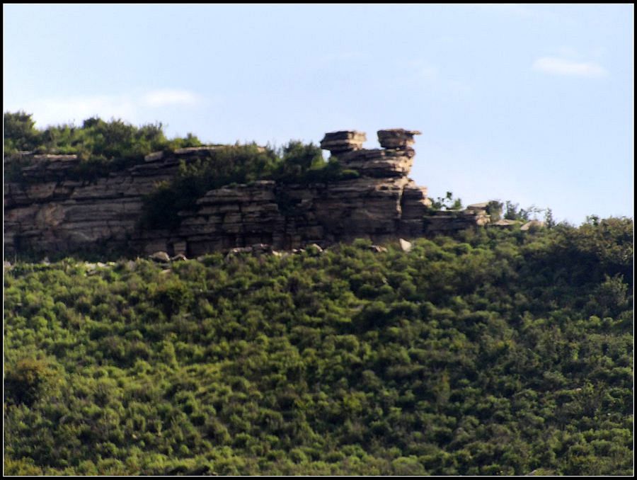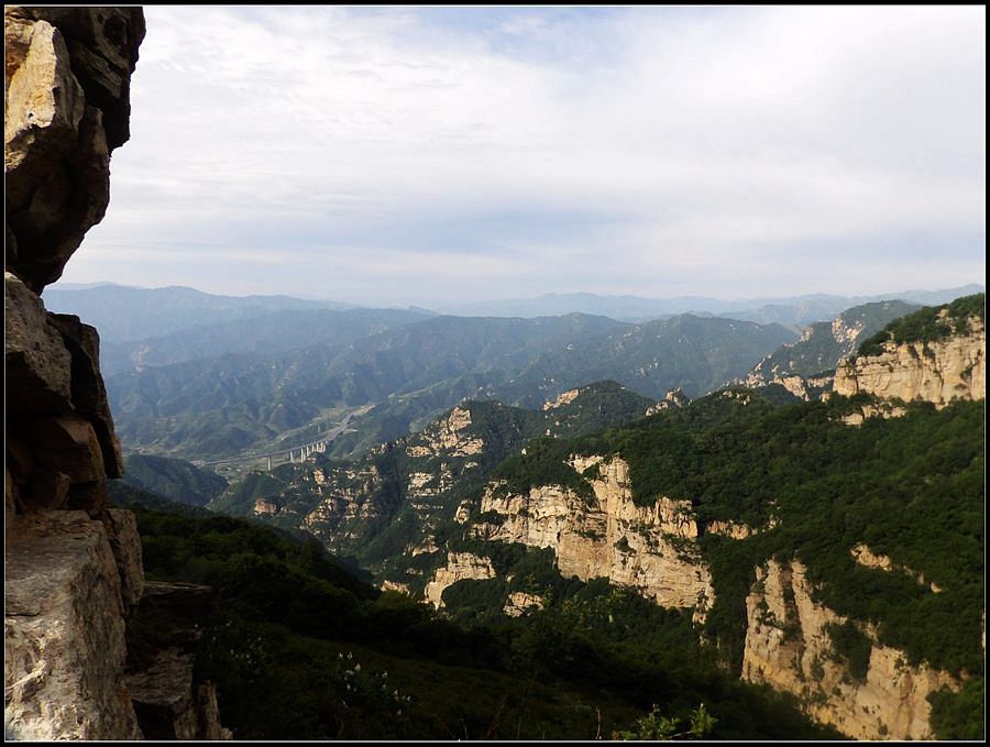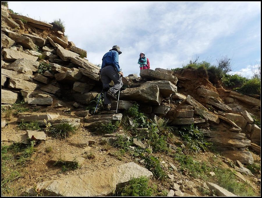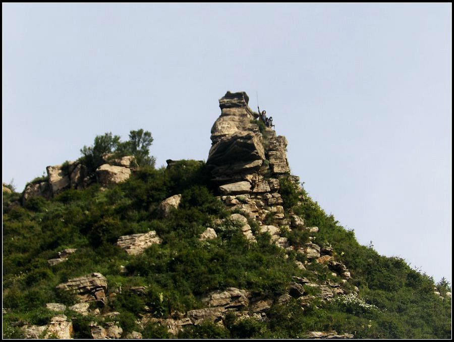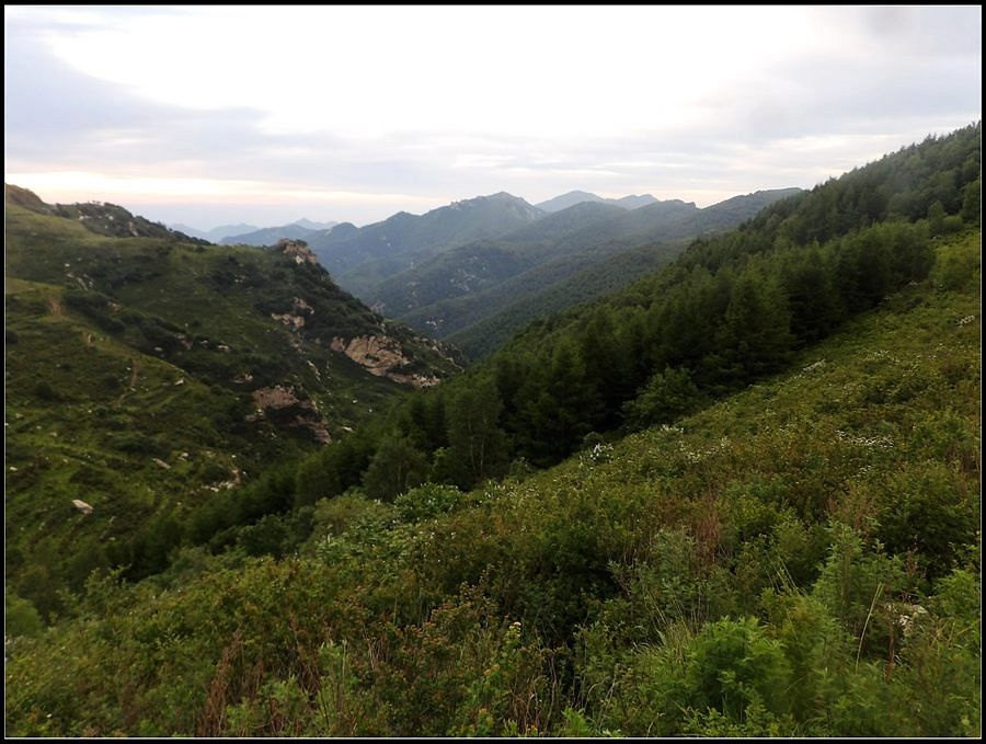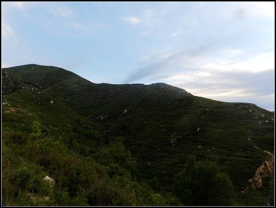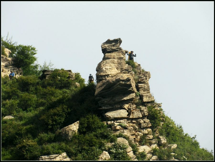 得瑟够了,我返回了营地。现在要去打水,然后做饭,今天争取早点出发。大夏天的,早点出发走路凉快。 那边,老王早已打回水来了,正在做饭,老王真够积极的。老王这个人,往往什么事不用你说,他主动就想在前边,做在前边。和这样的同伴出行,我喜欢。 扎在路边的营地 从营地看歪头山主峰。其实我们前边看到的歪头山都是歪头山的次峰,次峰海拔2254米高。歪头山真正的主峰在那个歪头的北侧,是个浑圆的毫无特色的山头。因歪头山的次峰更有特色,从河北一带看过去更显眼,所以这座山就被冠之以歪头山的名字了。 主峰海拔2286米歪头山,在河北十大独立高峰群中位列第7,也是河北十一个地级市中除了张家口市境内的山之外的最高山了。它巍然屹立在晋冀两冰片的交界处,南北两向的山脊构成了晋冀两省的天然分界线。歪头山西侧是有华北屋脊之称的大五台,东侧则是长达20公里的花尖梁、黄落伞、摩天岭山脊,歪头山正处在四条十字架形的山脊的交汇处。 附,河北十大独立高峰群 1.小五台 2882米(张家口蔚县、琢鹿交界处) 2.茶山 2524米 (张家口蔚县) 3.灵山 2420米(又叫西灵山,张家口涿鹿,) 4.摆宴陀 2307米 (张家口蔚县) 5.东灵山 2303米( 张家口涿鹿、北京门头沟交界) 6.东猴顶 2293米(张家口 赤城) 7.歪头山 2286米(保定阜平、山西繁驰交界) 8.南驼 2281米 (保定阜平、石家庄市平山、山西五台交界) 9.海坨 2241米 (张家口赤城、北京延庆交界) 10.冰山梁 2211米 (张家口赤城、沽源交界) 另外需要说明,有其它资料将韩家洼山(2488米、韭菜梁山(2262米)列入河北10大高山之中,其实韩家洼山、韭菜梁均是小五台余脉,并非独立的山。特别是韩家洼,距小五的东台只有几公里,与水五的山脊一脉相连,两者之间没有明显的地理分隔,如果韩家洼山能算成独立的山,那小五台余脉中的另几个山头如牛草沟南顶(2654)、乔力皮山(2321米)特别是距小五台较远的白谷查山(2300多米,具体数值不详)更应该算为河北10大高峰了。如果这样排名,歪头山肯定就被挤出前10之列了。 从营地看歪头山主峰 我们脚下的沟,即面然清那条沟。这条沟的出口在吴王口,全长70多华里,是阜平最深的一条沟,又称银河大峡谷 对面,赶着牛下山的老乡 对面山梁上的石,远拍,虚的严重 远拍歪头山下的石,关于此石后边会重点说到 8点稍过我们上路了。今天的队伍出现了“战斗减员”,昨天,在向大路攀升时,驼铃踩上了一块活石头,闪了一下,拉伤了腿。睡了一夜,今天起来疼痛一点不见轻,反而更历害,所以今天只能下撤。好在有老马陪着她(老马和驼铃的关系那可是不一般的关系,铁的很哦,每次出来两人都是一起报名,活动中也是成双成对,用句文明词,那叫如影如形,要问他俩咋那么亲密,呵呵,别想歪了,人家可是夫妻),好在他们可以走孟寺塔城的大路下山,前边说过,那条路老马开车走过一次。 老马也是疯惯了的人,虽说不能和我们一起向前走了,可他并不想下山,他打算今天下撤到孟寺塔扎营,明天再下山。爱山的人,进了山就象撒欢的小马驹子,拦也拦不住。现在老马要陪我们一起往前“遛达遛达”,等我们补完水再回去,说白了,是想带我们去补水。感动,感动的哗哗的眼泪。 陪我们一起向前走的老马 从我们扎营的地方向歪头山走不远是大路的尽头,山脊上被人工挖开一个山口,山口的那边并没有下山路,而是百丈悬崖,既然不是修路,挖这个山口做什么?有人说,是当年的阎老西修工事挖的,也有人说开矿的挖的,众说不一,不置可否。 众人在这儿小小的得瑟了一番,在众人拍照时,只有西西独自一人继续向前走去。 山口留影的葫芦岛 从山口看黑崖沟,脚下是深不可测的悬崖 停留的时间很短,不过一两分钟时间,拍照之后我们又继续上路了。大路到此已是尽头,从现在开始我们又走上了小路,充满未知的小路、崎岖不平的小路,让某些普通人谈虎色变,但却是我们的最爱。因为只有人迹罕至的地方,才有别人看不到的美景。 从山脊高处看下边的山口 山口一侧,曾经的简易房,看到这处废弃不算太久的简易房,我们更相信下边的山口是挖矿形成的 现在我们走的这条山脊,一侧是刀劈斧剁般的百丈深渊,悬壁如一道长墙。另一侧是大约40度的陡坡、坡上绿树葱笼象条碧玉带,两侧对比强烈,风光那是相当的美。队员们为美景吸引,不时的停下脚步,或观赏、或拍照,大家走的都比较轻松,心情舒松,脚步也轻松。你要问为什么 ,现在不说,先卖个关子。 回看我们身后的山脊 现在我们看到的是保阜高速黑崖沟大桥。黑崖沟大桥其实是相连的两座桥,其中黑崖沟1号桥是河北省内单孔跨度最大的高速公路桥,单孔跨径达135米桥。黑崖沟2号桥则以高箸称,其中最高的7号墩墩高120.5米,仅一个桥墩的总重就达到15万吨,堪称为华北最高桥。保阜高速和山西欣五高速对接,连通了河北及京津一带和山西北部的交通,也成为歪头山区的一道风景线。 路开始了急升,步步登高的路让我们步履不再轻松,我们只能放慢脚步缓缓而行。尽管大家都 放慢了脚步,边走边拍的我还是渐渐的落在了最后。 老王走过一个巨石,此石的独特之处是上边的石头比较大,象个蘑菇头,它的一端坐在下边较小的石座上,另一端好象是用三块叠在一起的小石头支住一样 再看我们扎营的山脊。此时,不远处的小山包上,昨天看到过的那个烽火台出现在视线中。这个烽火台是内长城龙泉关关
