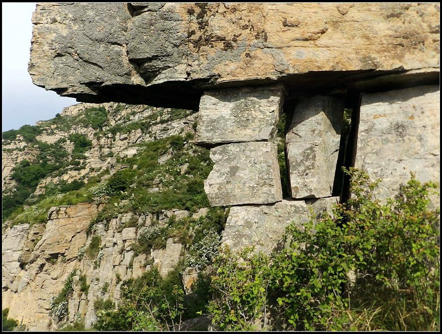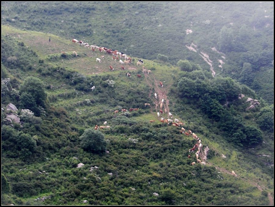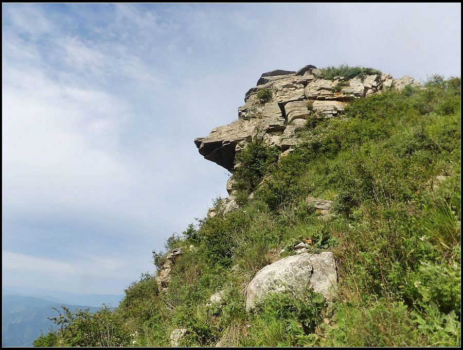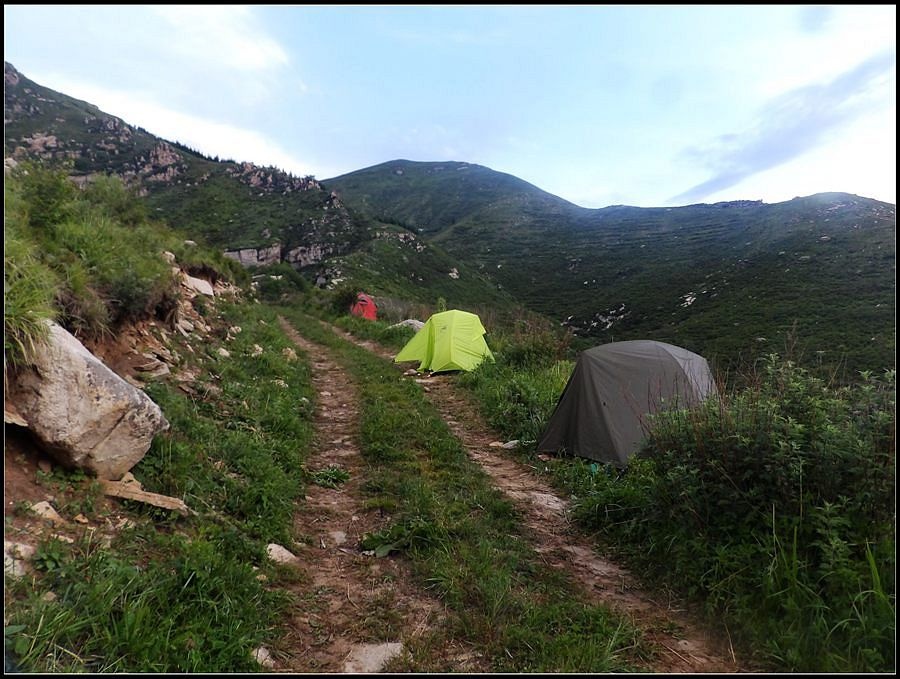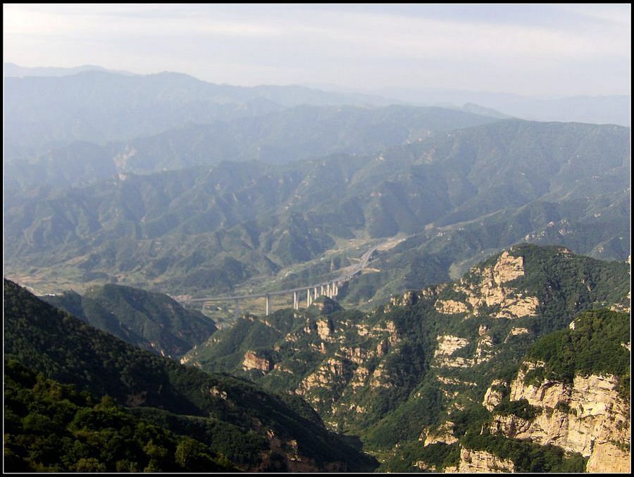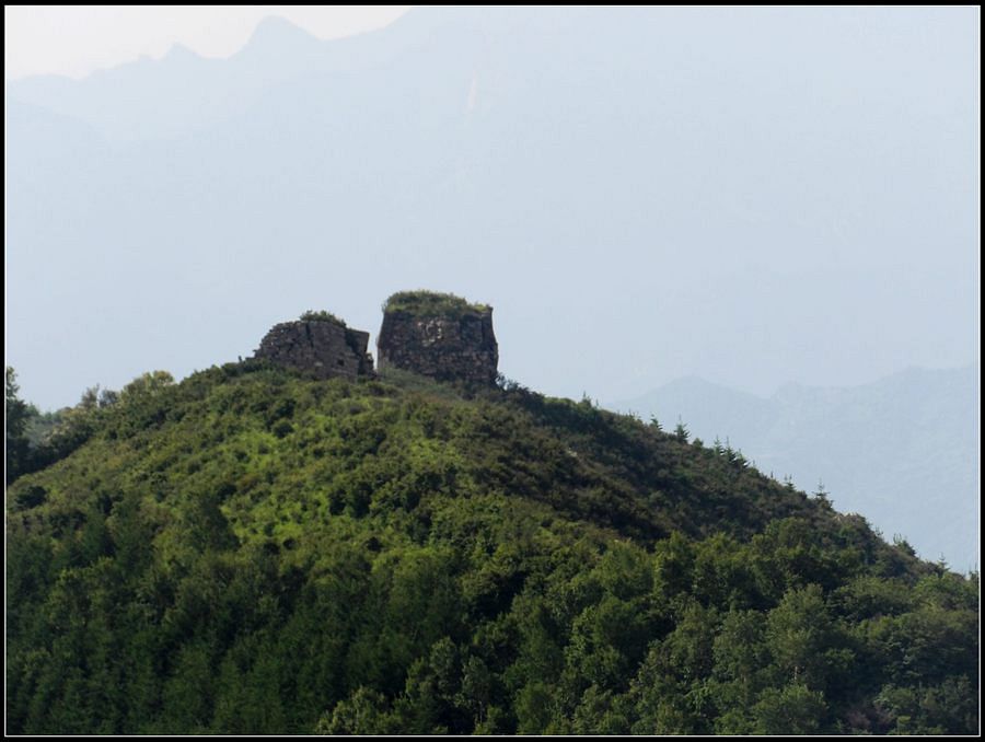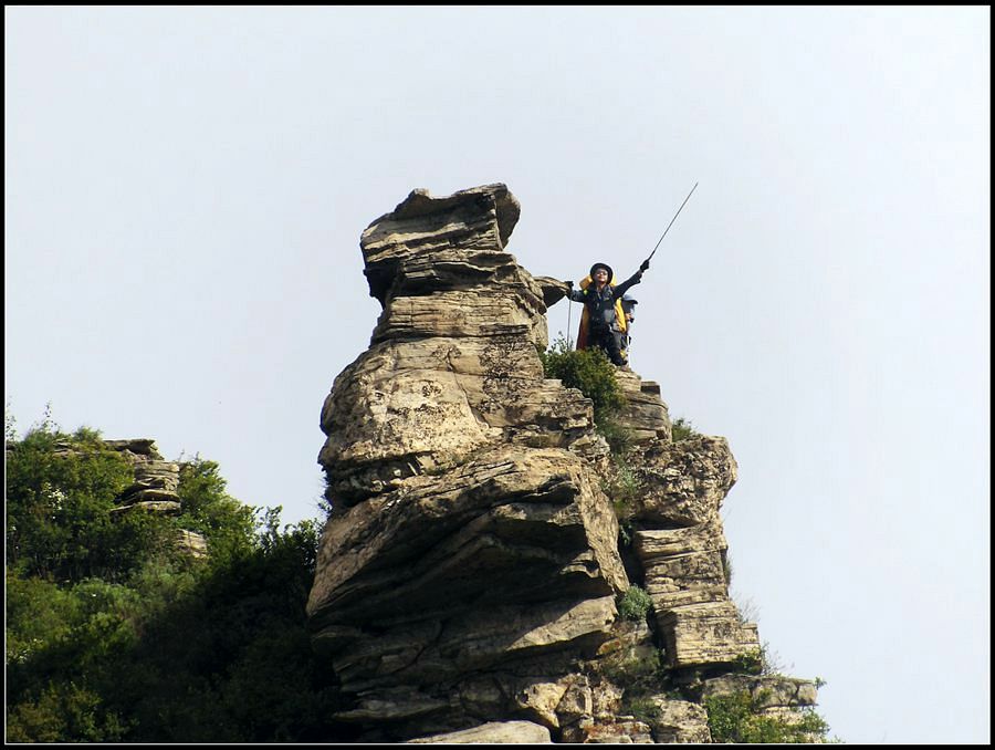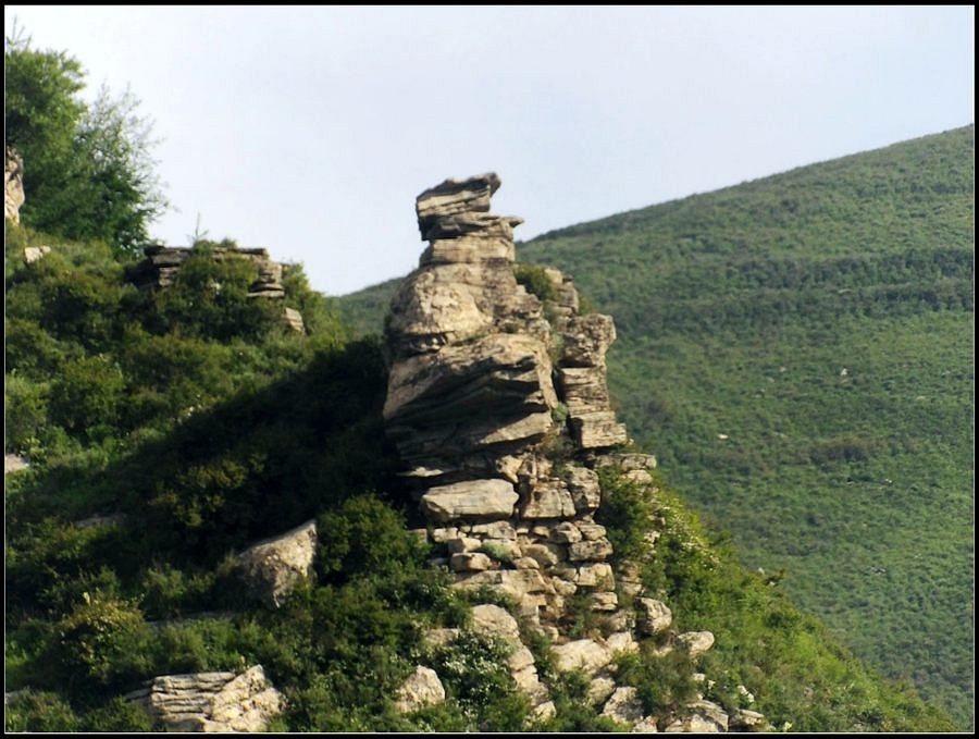 得瑟够了,我返回了营地。现在要去打水,然后做饭,今天争取早点出发。大夏天的,早点出发走路凉快。 那边,老王早已打回水来了,正在做饭,老王真够积极的。老王这个人,往往什么事不用你说,他主动就想在前边,做在前边。和这样的同伴出行,我喜欢。 扎在路边的营地 从营地看歪头山主峰。其实我们前边看到的歪头山都是歪头山的次峰,次峰海拔2254米高。歪头山真正的主峰在那个歪头的北侧,是个浑圆的毫无特色的山头。因歪头山的次峰更有特色,从河北一带看过去更显眼,所以这座山就被冠之以歪头山的名字了。 主峰海拔2286米歪头山,在河北十大独立高峰群中位列第7,也是河北十一个地级市中除了张家口市境内的山之外的最高山了。它巍然屹立在晋冀两冰片的交界处,南北两向的山脊构成了晋冀两省的天然分界线。歪头山西侧是有华北屋脊之称的大五台,东侧则是长达20公里的花尖梁、黄落伞、摩天岭山脊,歪头山正处在四条十字架形的山脊的交汇处。 附,河北十大独立高峰群 1.小五台 2882米(张家口蔚县、琢鹿交界处) 2.茶山 2524米 (张家口蔚县) 3.灵山 2420米(又叫西灵山,张家口涿鹿,) 4.摆宴陀 2307米 (张家口蔚县) 5.东灵山 2303米( 张家口涿鹿、北京门头沟交界) 6.东猴顶 2293米(张家口 赤城) 7.歪头山 2286米(保定阜平、山西繁驰交界) 8.南驼 2281米 (保定阜平、石家庄市平山、山西五台交界) 9.海坨 2241米 (张家口赤城、北京延庆交界) 10.冰山梁 2211米 (张家口赤城、沽源交界) 另外需要说明,有其它资料将韩家洼山(2488米、韭菜梁山(2262米)列入河北10大高山之中,其实韩家洼山、韭菜梁均是小五台余脉,并非独立的山。特别是韩家洼,距小五的东台只有几公里,与水五的山脊一脉相连,两者之间没有明显的地理分隔,如果韩家洼山能算成独立的山,那小五台余脉中的另几个山头如牛草沟南顶(2654)、乔力皮山(2321米)特别是距小五台较远的白谷查山(2300多米,具体数值不详)更应该算为河北10大高峰了。如果这样排名,歪头山肯定就被挤出前10之列了。 从营地看歪头山主峰 我们脚下的沟,即面然清那条沟。这条沟的出口在吴王口,全长70多华里,是阜平最深的一条沟,又称银河大峡谷 对面,赶着牛下山的老乡 对面山梁上的石,远拍,虚的严重 远拍歪头山下的石,关于此石后边会重点说到 8点稍过我们上路了。今天的队伍出现了“战斗减员”,昨天,在向大路攀升时,驼铃踩上了一块活石头,闪了一下,拉伤了腿。睡了一夜,今天起来疼痛一点不见轻,反而更历害,所以今天只能下撤。好在有老马陪着她(老马和驼铃的关系那可是不一般的关系,铁的很哦,每次出来两人都是一起报名,活动中也是成双成对,用句文明词,那叫如影如形,要问他俩咋那么亲密,呵呵,别想歪了,人家可是夫妻),好在他们可以走孟寺塔城的大路下山,前边说过,那条路老马开车走过一次。 老马也是疯惯了的人,虽说不能和我们一起向前走了,可他并不想下山,他打算今天下撤到孟寺塔扎营,明天再下山。爱山的人,进了山就象撒欢的小马驹子,拦也拦不住。现在老马要陪我们一起往前“遛达遛达”,等我们补完水再回去,说白了,是想带我们去补水。感动,感动的哗哗的眼泪。 陪我们一起向前走的老马 从我们扎营的地方向歪头山走不远是大路的尽头,山脊上被人工挖开一个山口,山口的那边并没有下山路,而是百丈悬崖,既然不是修路,挖这个山口做什么?有人说,是当年的阎老西修工事挖的,也有人说开矿的挖的,众说不一,不置可否。 众人在这儿小小的得瑟了一番,在众人拍照时,只有西西独自一人继续向前走去。 山口留影的葫芦岛 从山口看黑崖沟,脚下是深不可测的悬崖 停留的时间很短,不过一两分钟时间,拍照之后我们又继续上路了。大路到此已是尽头,从现在开始我们又走上了小路,充满未知的小路、崎岖不平的小路,让某些普通人谈虎色变,但却是我们的最爱。因为只有人迹罕至的地方,才有别人看不到的美景。 从山脊高处看下边的山口 山口一侧,曾经的简易房,看到这处废弃不算太久的简易房,我们更相信下边的山口是挖矿形成的 现在我们走的这条山脊,一侧是刀劈斧剁般的百丈深渊,悬壁如一道长墙。另一侧是大约40度的陡坡、坡上绿树葱笼象条碧玉带,两侧对比强烈,风光那是相当的美。队员们为美景吸引,不时的停下脚步,或观赏、或拍照,大家走的都比较轻松,心情舒松,脚步也轻松。你要问为什么 ,现在不说,先卖个关子。 回看我们身后的山脊 现在我们看到的是保阜高速黑崖沟大桥。黑崖沟大桥其实是相连的两座桥,其中黑崖沟1号桥是河北省内单孔跨度最大的高速公路桥,单孔跨径达135米桥。黑崖沟2号桥则以高箸称,其中最高的7号墩墩高120.5米,仅一个桥墩的总重就达到15万吨,堪称为华北最高桥。保阜高速和山西欣五高速对接,连通了河北及京津一带和山西北部的交通,也成为歪头山区的一道风景线。 路开始了急升,步步登高的路让我们步履不再轻松,我们只能放慢脚步缓缓而行。尽管大家都 放慢了脚步,边走边拍的我还是渐渐的落在了最后。 老王走过一个巨石,此石的独特之处是上边的石头比较大,象个蘑菇头,它的一端坐在下边较小的石座上,另一端好象是用三块叠在一起的小石头支住一样 再看我们扎营的山脊。此时,不远处的小山包上,昨天看到过的那个烽火台出现在视线中。这个烽火台是内长城龙泉关关